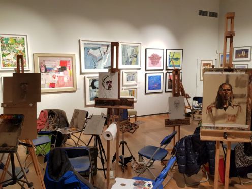Back at Mall Galleries to sit for the portrait artists of Hesketh Hubbard Art Society, my first objective was accessing their pivotal throne. Again and again, I paced round the perimeter of portraitists who’d assembled tightly into a double arc but I could find no means of ingress. It was a busy night. When finally an oil painter momentarily left his station, I slid carefully betwixt poised paraphernalia and eased into the hotseat.