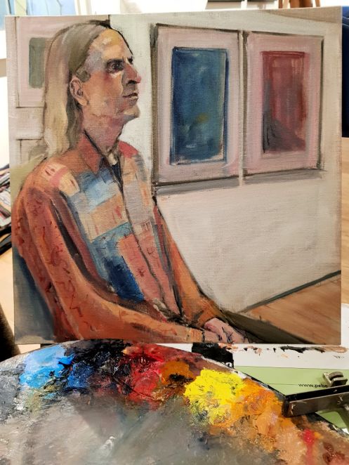 Two months after this session I finally learned who was responsible for the in-progress painting I’d admired so much at the interval. Thank you, Barbara Storey! Her finished (“kind of”) work is below.