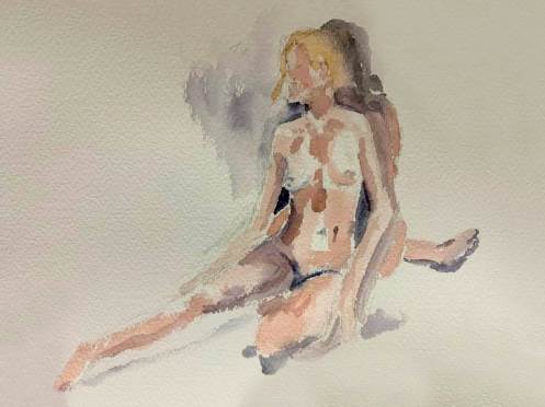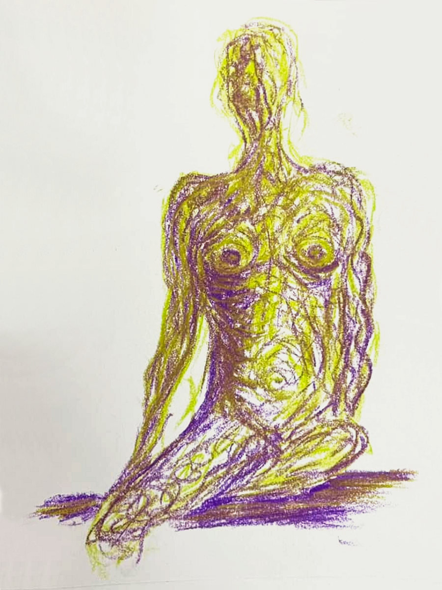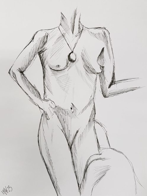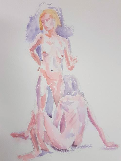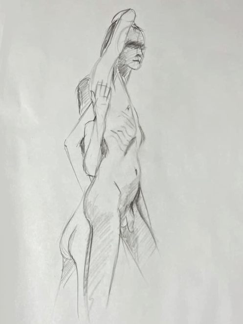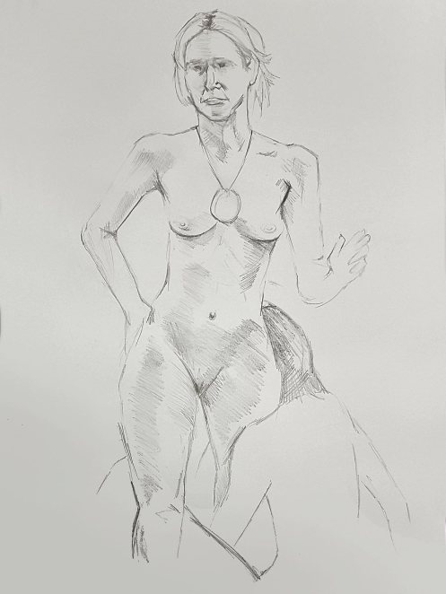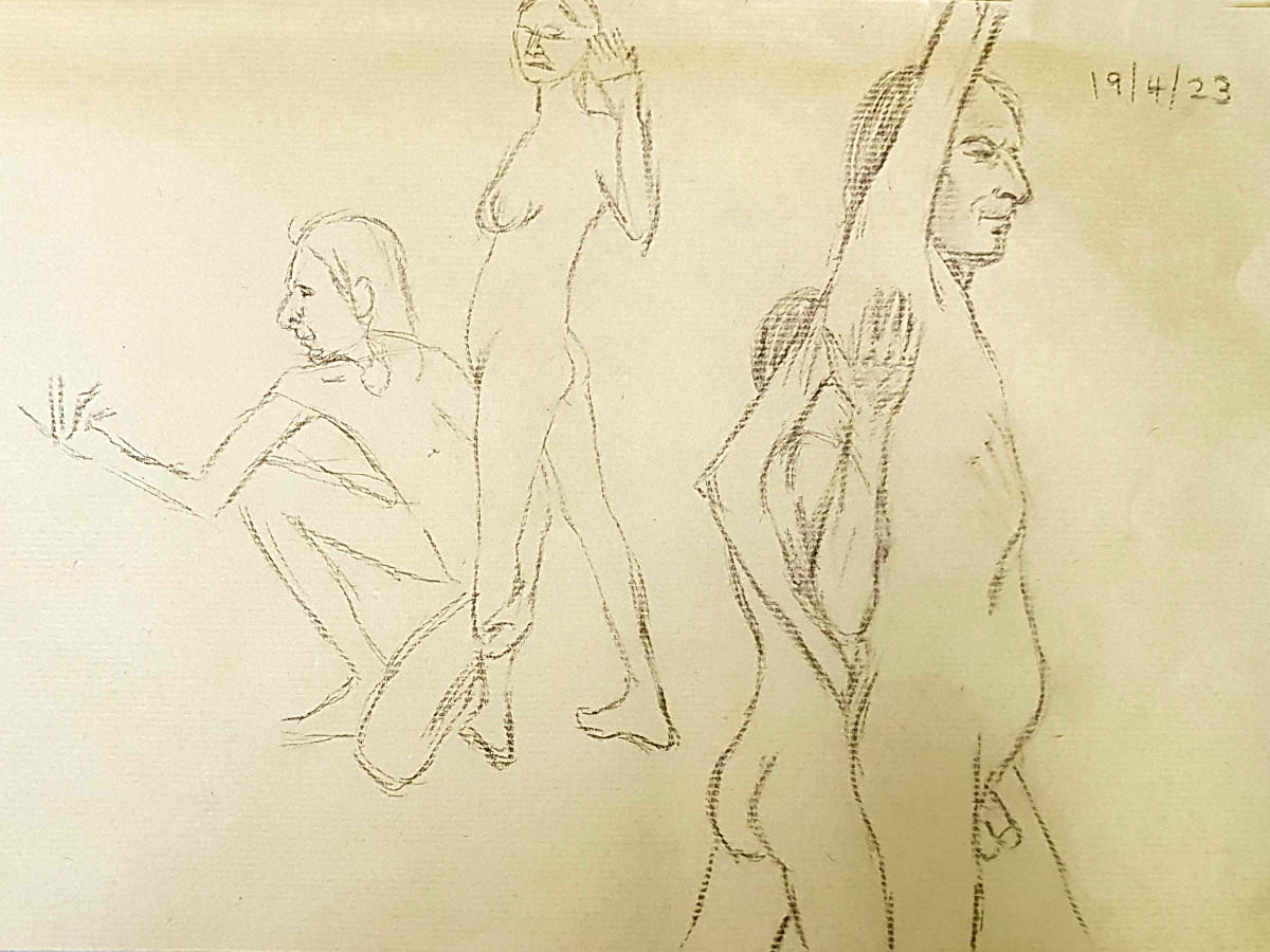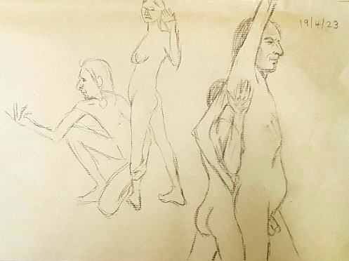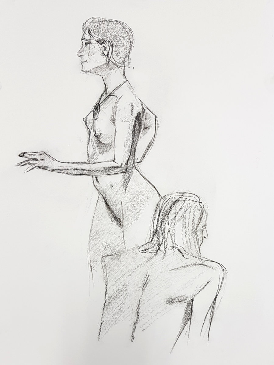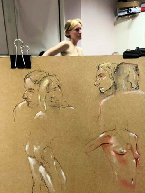 At 7:30pm we started in the round with poses of 5, 10 and 15 minutes. Artists studied and captured us with quiet concentration. LeNu Life Drawing has matured – gone are the days of constant chatter throughout. Since the COVID-19 lockdowns it has grown both in numbers and seriousness. Now everybody concentrates on their art.