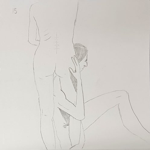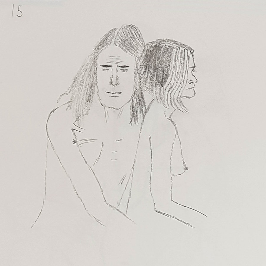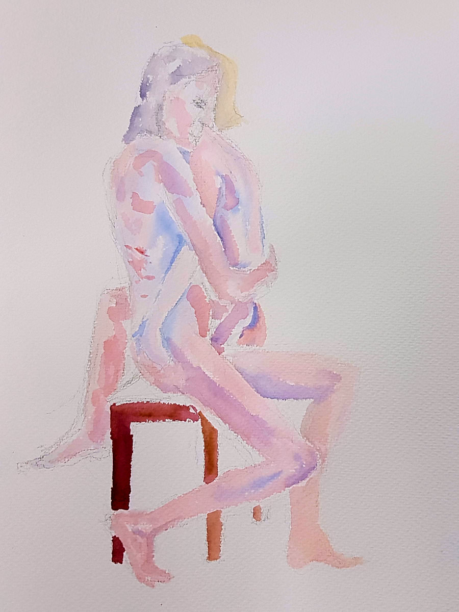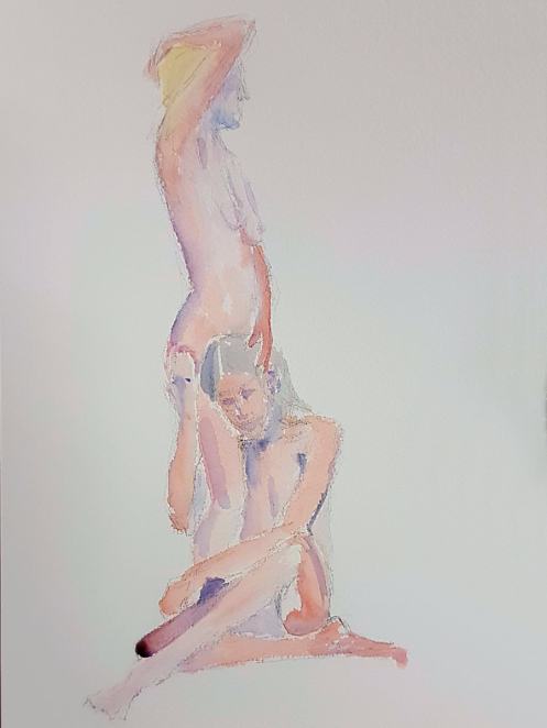 Esther felt she needed to stand for the final 25 minutes, so we reprised the last of our 15-minute poses with me sitting wrapped around one of her legs. For variety, I picked the left leg instead of right, Esther switched gestures and most importantly we rotated ninety degrees. Thus a familiar pose became wholly original from all perspectives.