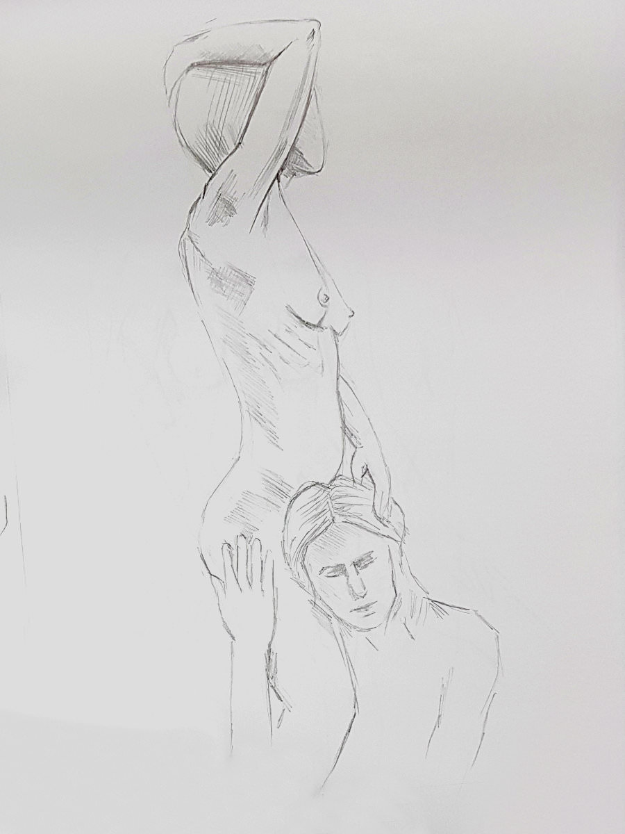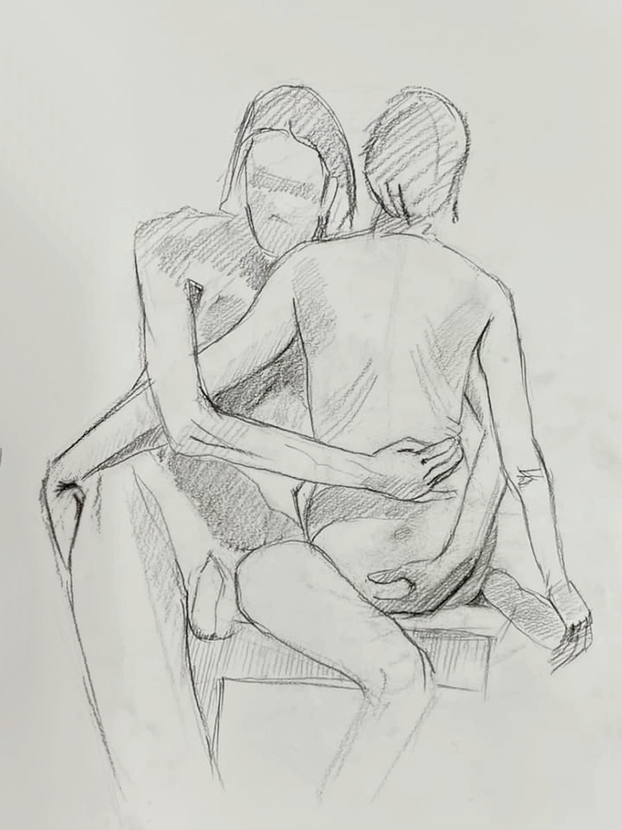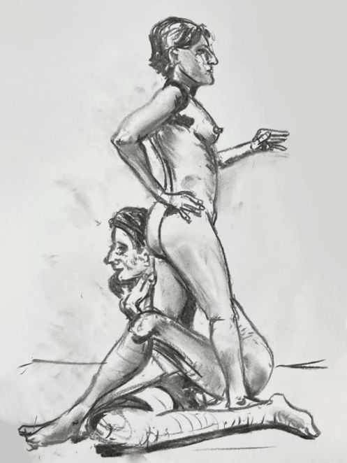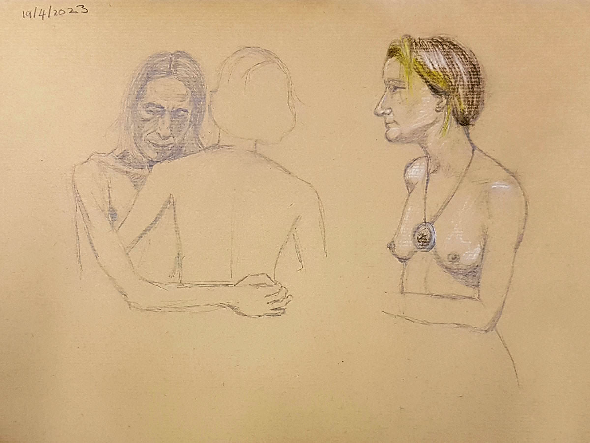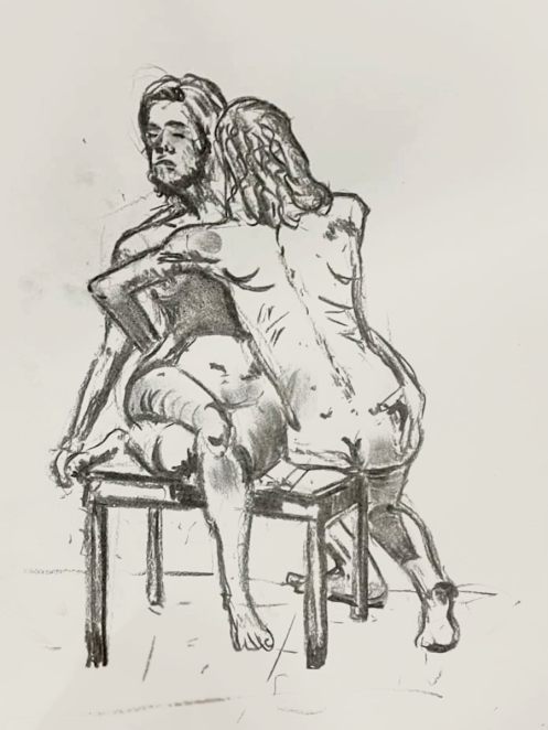 Opportunities for duo life modelling as a couple are thinning out. Prior to this session, Esther and I hadn’t posed together since January 2022. LeNu Life Drawing, run by our friend Natansky, happily ended our barren spell in 2023 by inviting us once more for an evening at Fairkytes Arts Centre. Last time we were both here was 2018!