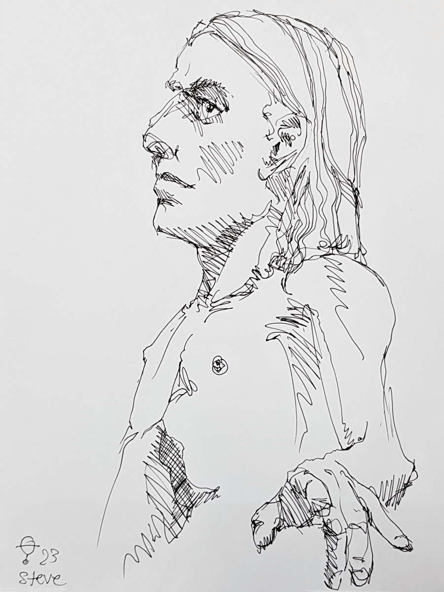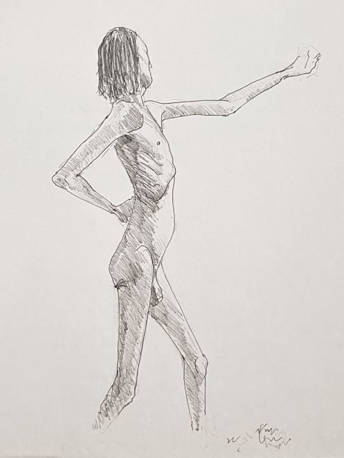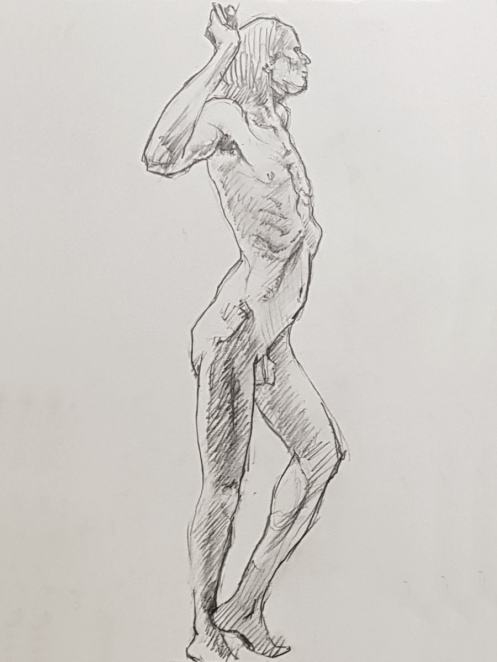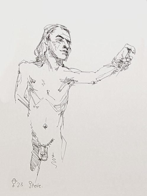 For many a moon Bruce Thomas has supported Adrian Dutton’s groups both as a life drawing artist and, for want of a better way to say it, technical assistant. Now he’s applying his skills to a project of his own: lifedrawing.art. This includes Thursday life drawing sessions in-person and via Zoom at Homerton library. I was his model #14.