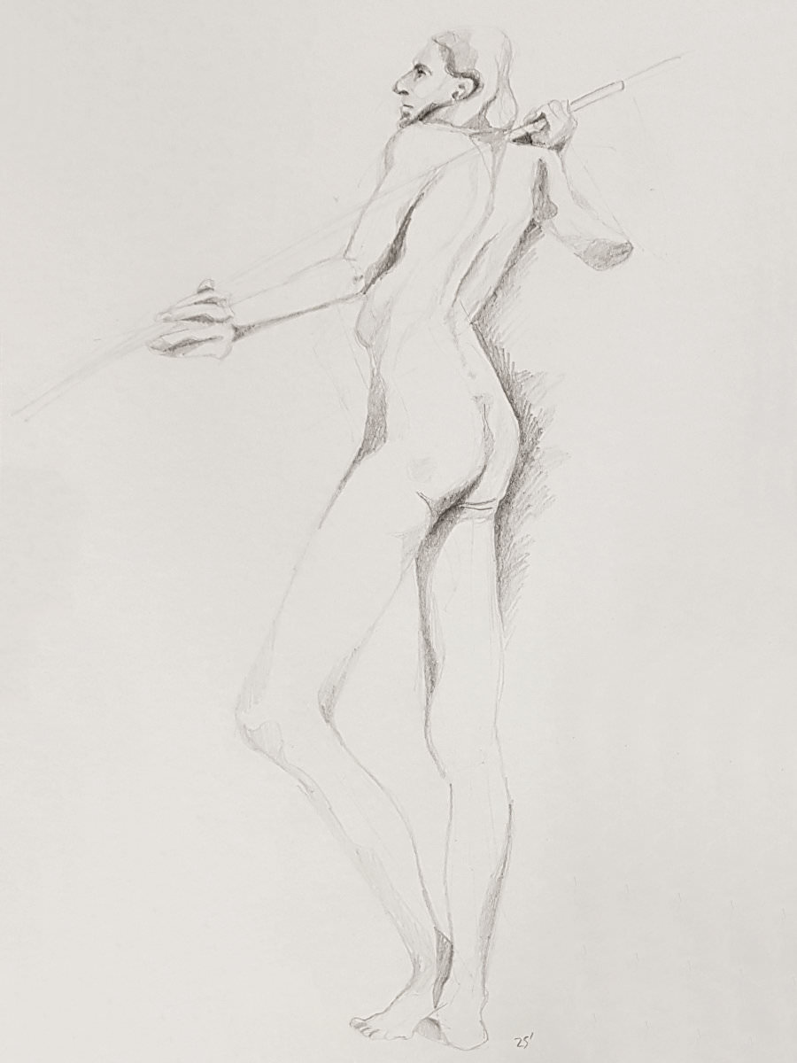 The first floor space in the library is ideal, with plenty of room for all. Bruce sets up an array of lamps, even using a red filter where low-level lighting would otherwise be too bright for artists when in their line of sight. We began with a 10-minute standing pose, followed by four poses of 90 seconds each, then poses of 5, 5, 10 and 15 minutes.