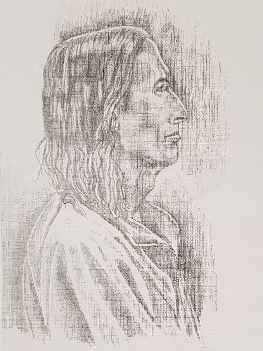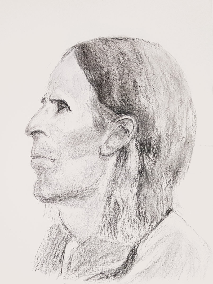 Not that I wouldn’t appreciate the gift of a portrait – I do! It’s just that if I have no other reason to bring a bag, then the tube doesn’t come with me. But I digress. Back to me seated inside a horseshoe of tables occupied by this friendly community of artists: an unbroken 55 minutes took us to tea and biscuits, then 45 minutes took us to the end.