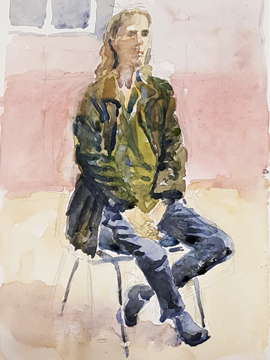 I was to pose for portraits, so in both baggage and imagination I travelled light. It is a curious paradox that if I’m to pose completely nude, I’ll bring a backpack, but if I’m to be fully clothed, I bring nothing. What’s in the backpack, you ask? My dressing gown, my trusty white sheet, and a small tube for those occasional gifts of artworks.