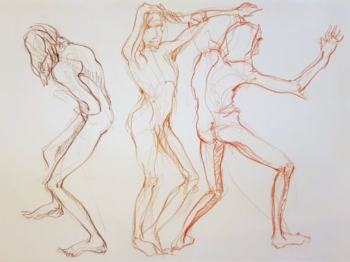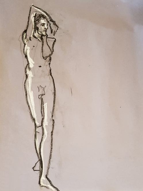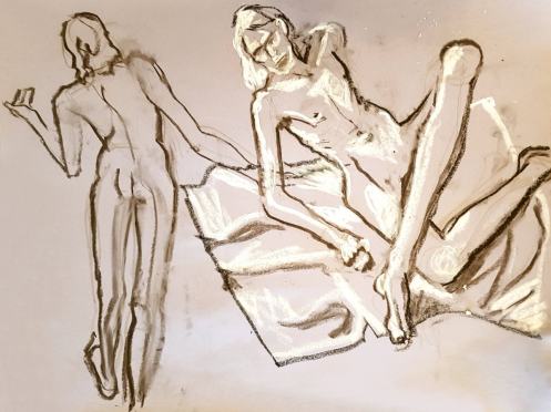 We opened with three 1-minute poses, followed by three of 3 minutes each, then two poses of 5 minutes, one of 15 minutes and a 10-minute pose taking us to an interval. After our break we concluded the session with a single pose of 40 minutes. It was so nice to be back. Everything went superbly well… the only spark missing was Jenny.
