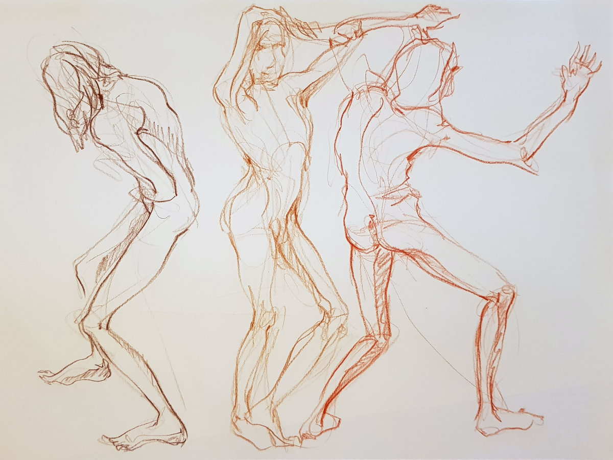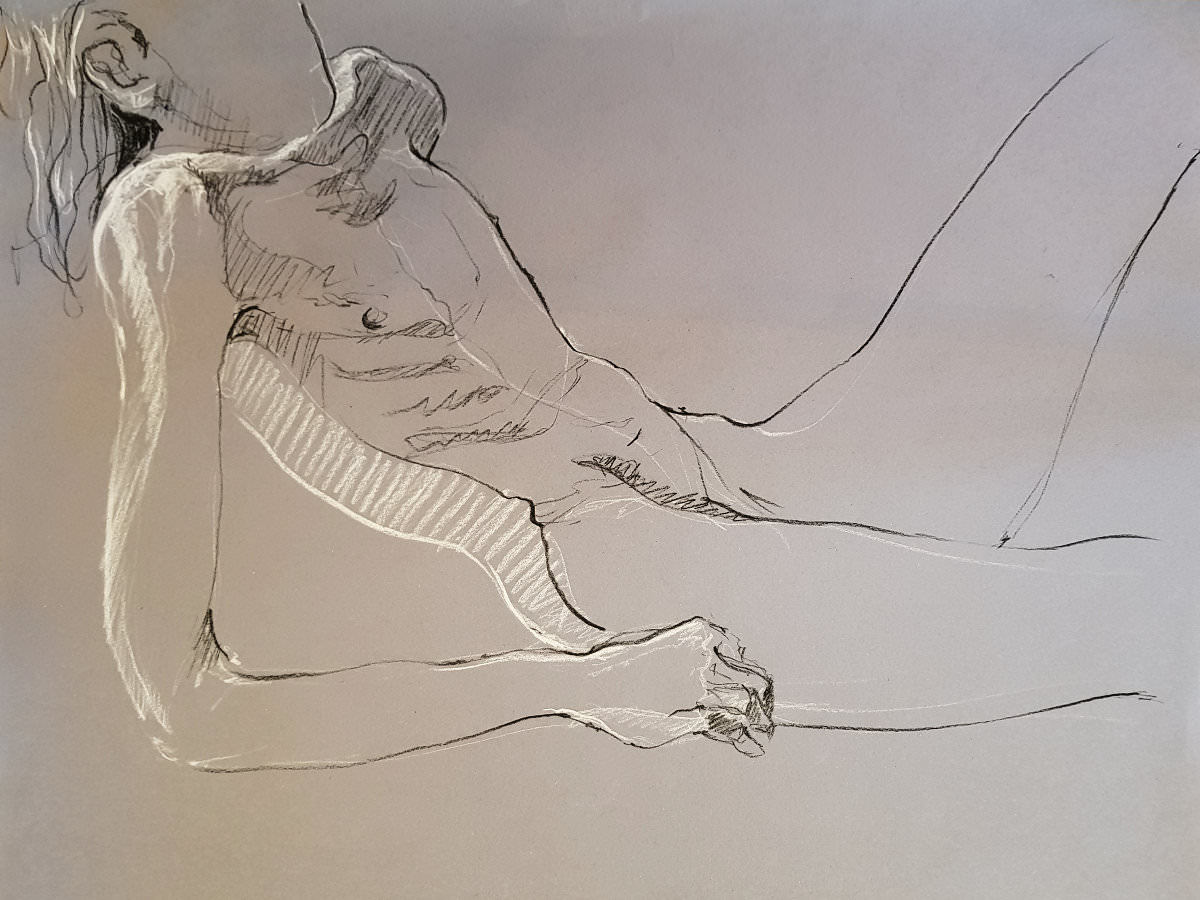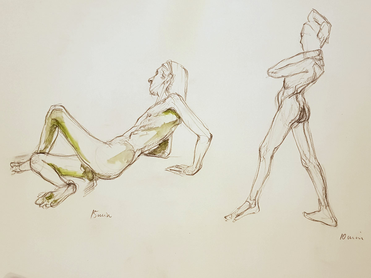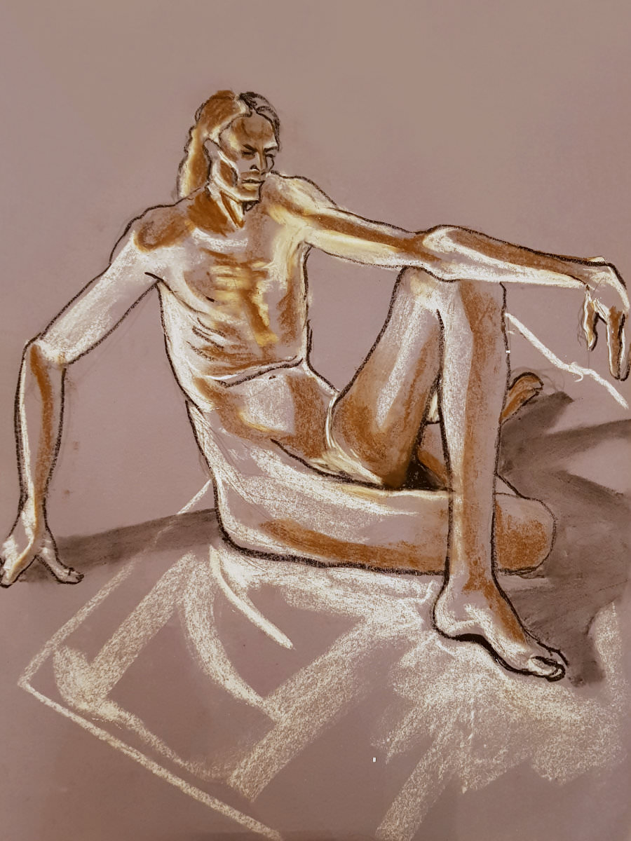 We opened with three 1-minute poses, followed by three of 3 minutes each, then two poses of 5 minutes, one of 15 minutes and a 10-minute pose taking us to an interval. After our break we concluded the session with a single pose of 40 minutes. It was so nice to be back. Everything went superbly well… the only spark missing was Jenny.