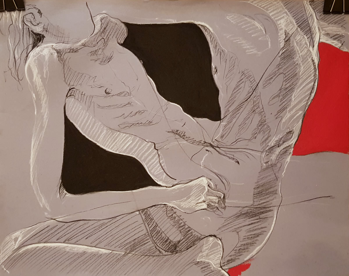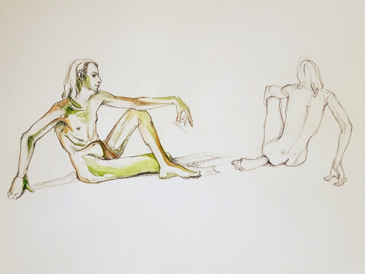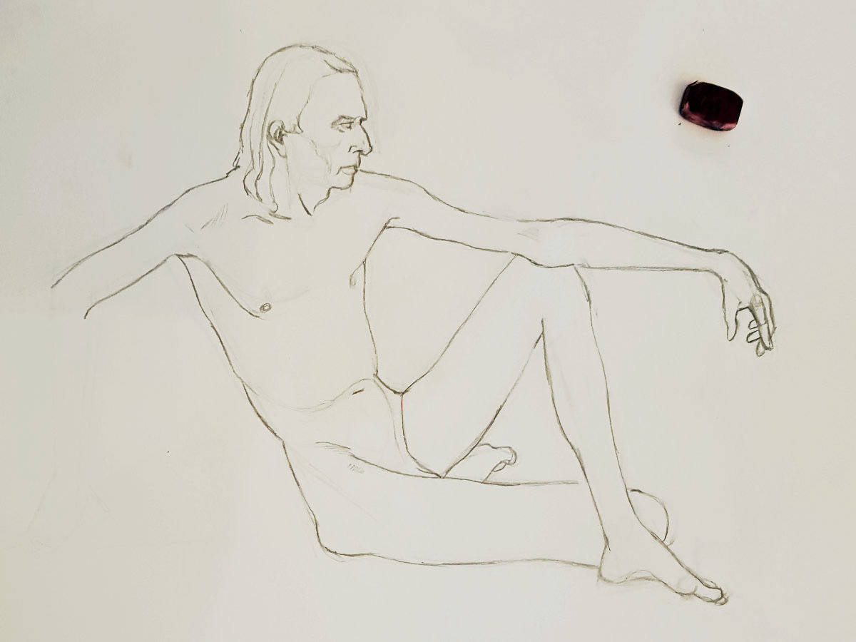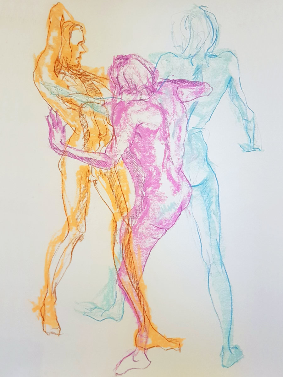 We opened with three 1-minute poses, followed by three of 3 minutes each, then two poses of 5 minutes, one of 15 minutes and a 10-minute pose taking us to an interval. After our break we concluded the session with a single pose of 40 minutes. It was so nice to be back. Everything went superbly well… the only spark missing was Jenny.