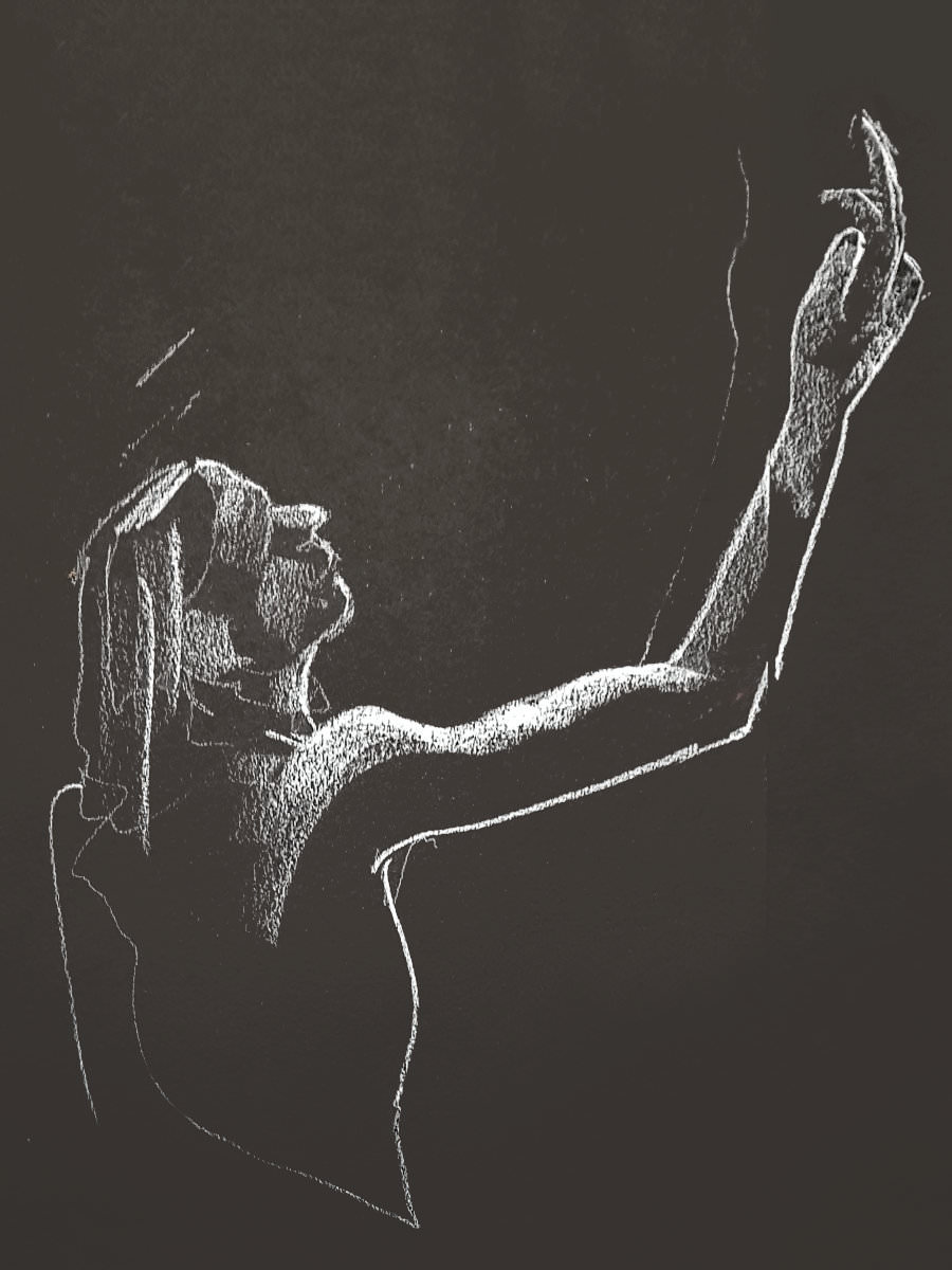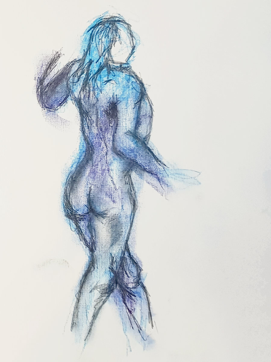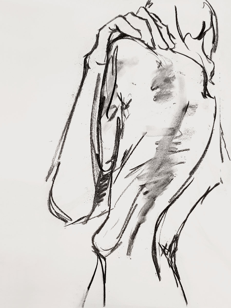 Part two began with pose-time preferences being put to a popular vote. Artists raised their hands in greatest numbers for two poses of 15 minutes. I made the first of these one of my stock stances: standing, right arm over my head, left arm behind my back.