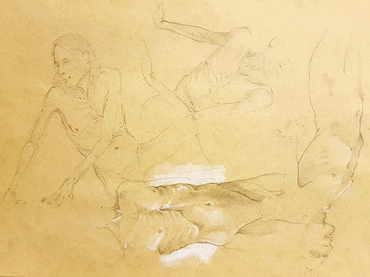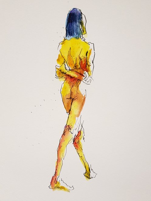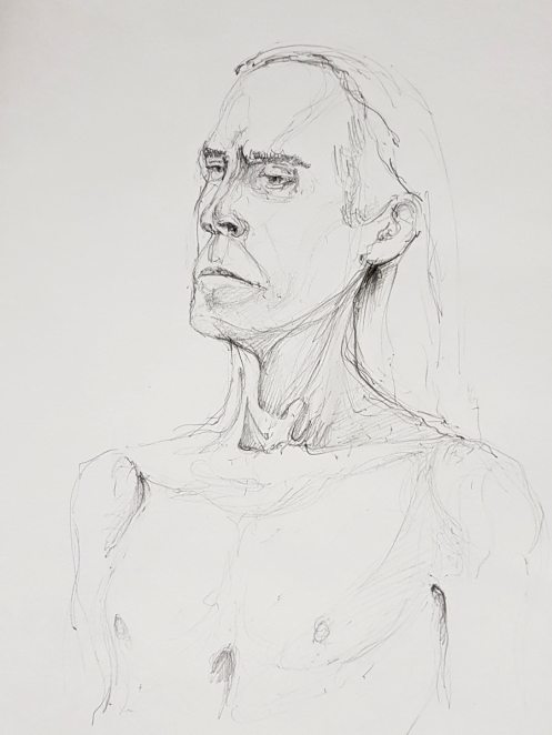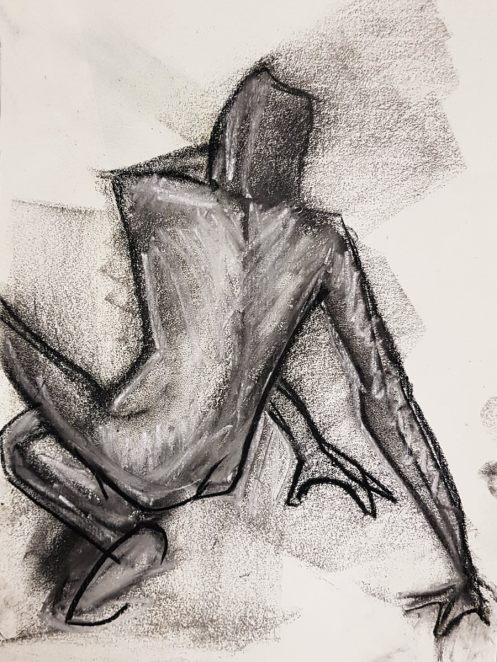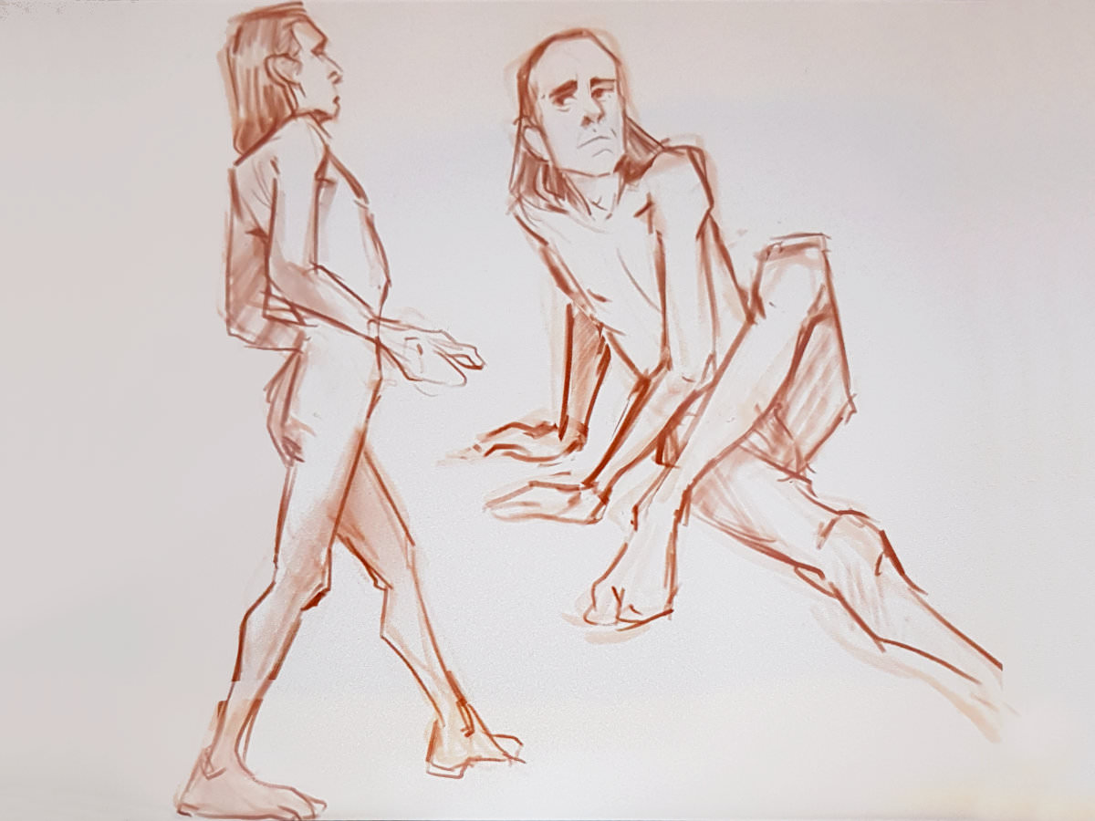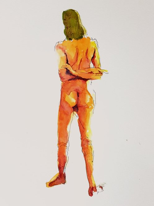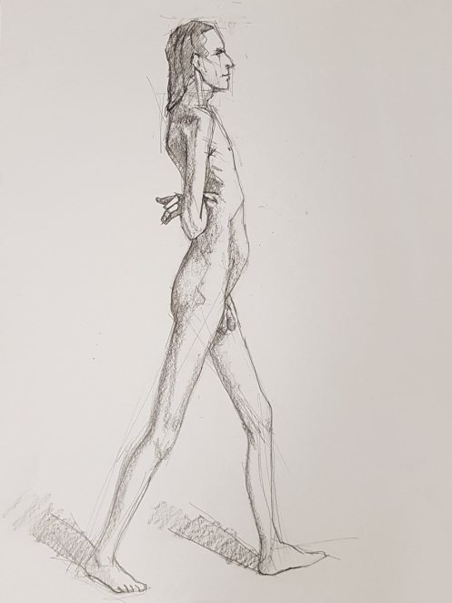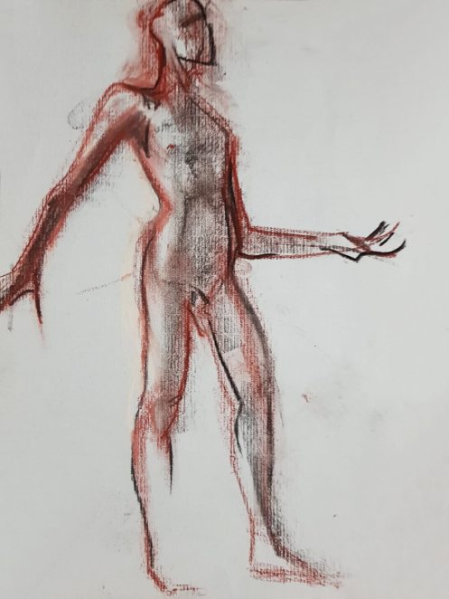 While artists were invited to pay their admission fees, I was first in the kitchen area to pour tea and partake of the white chocolate biscuits. After our break, a single pose of 55 minutes would see the session to its end; feeling magnanimous, I offered to stand. This evidently not being a common offer, it was accepted without dissent. I folded my arms behind my arched back and settled into a balanced stance. We began.