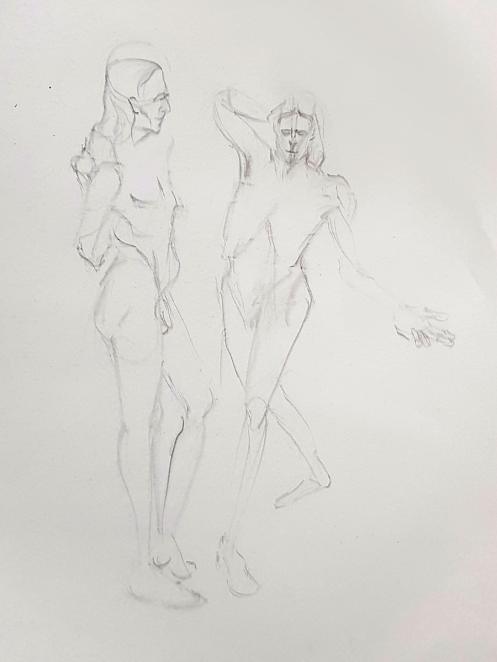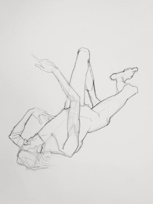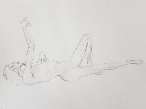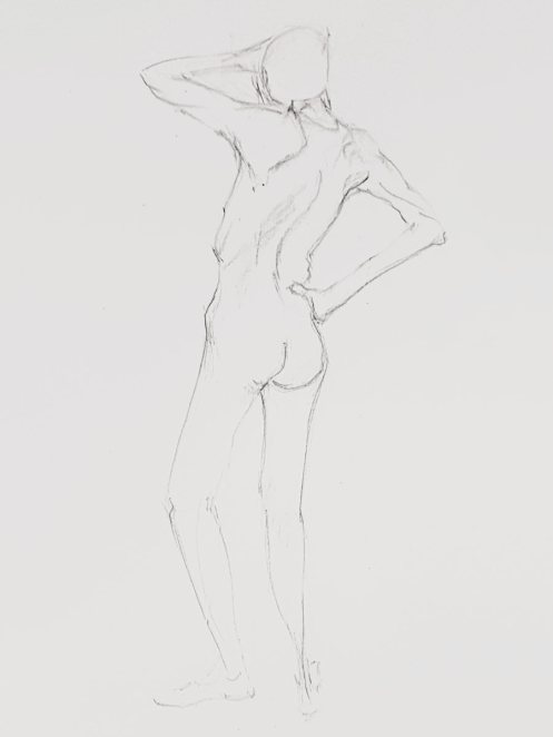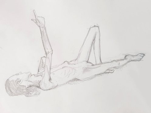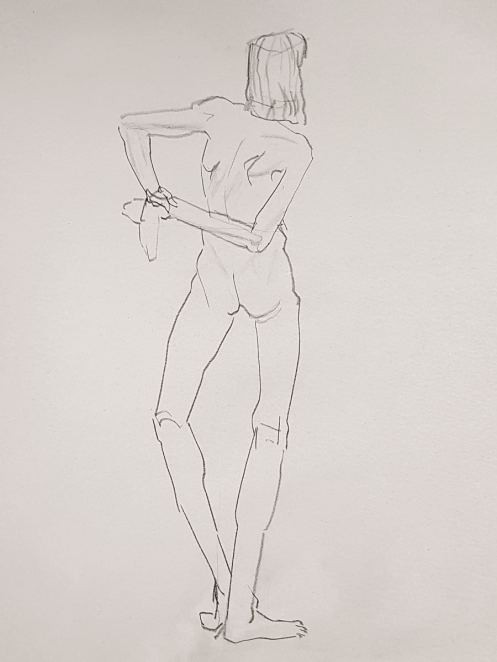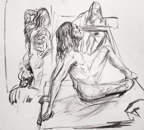 Once again I was impressed by the artists whose commitment motivates them to join us whatever the weather, even when Zoom is offered as an alternative. More than 20 made the effort, occupying seats set out as a square, with a couple more standing by easels. We began: a 15-minute pose, five of 1 minute, then 5 minutes, 10 minutes.