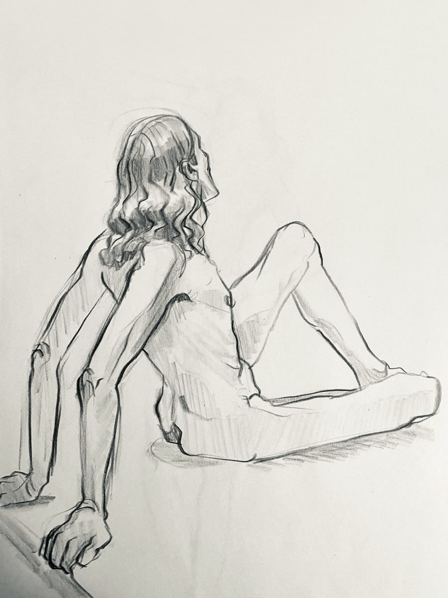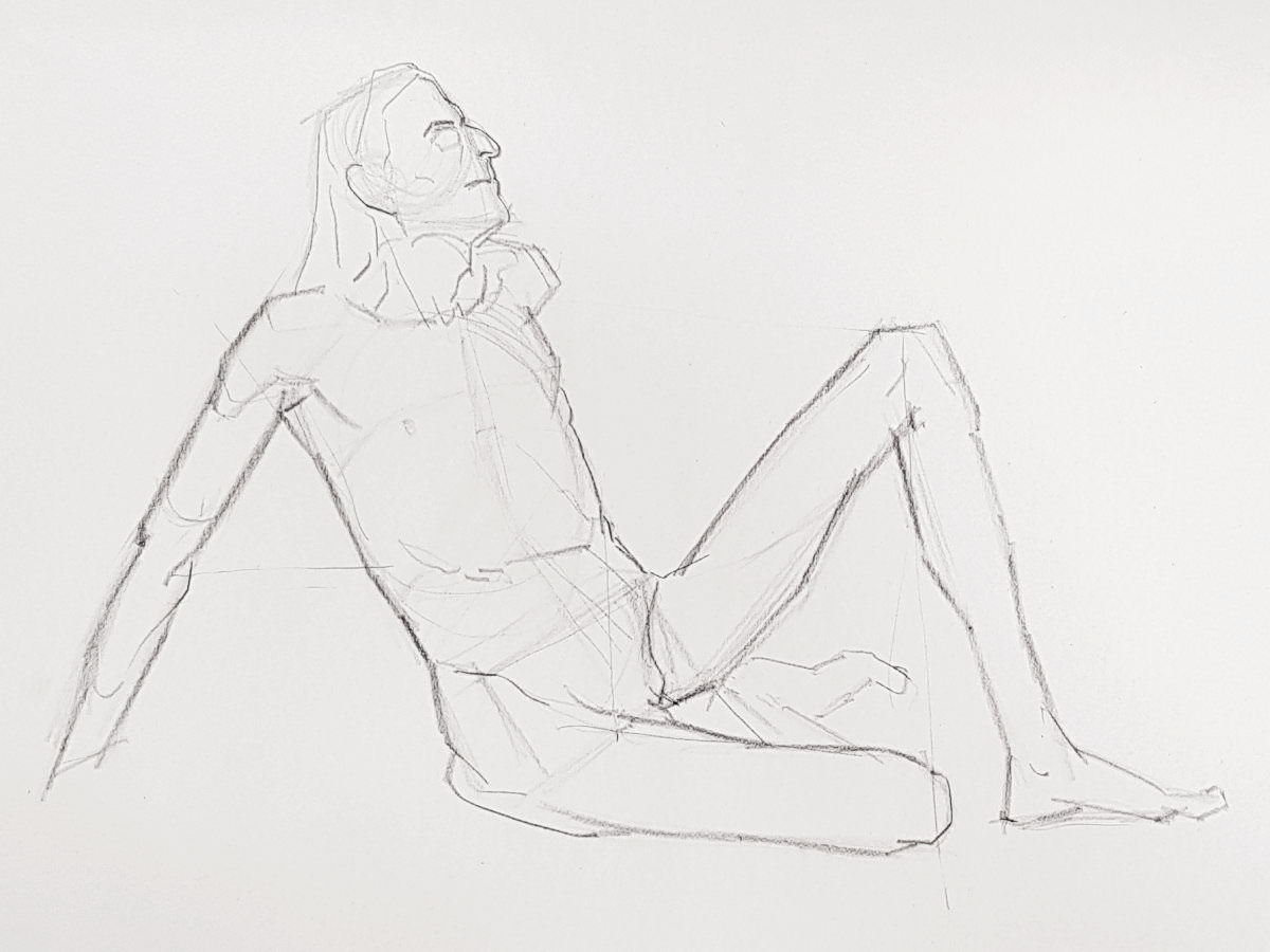 Once again I was impressed by the artists whose commitment motivates them to join us whatever the weather, even when Zoom is offered as an alternative. More than 20 made the effort, occupying seats set out as a square, with a couple more standing by easels. We began: a 15-minute pose, five of 1 minute, then 5 minutes, 10 minutes.