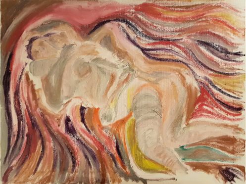 Two rarities in a single session: a private booking for one artist and a chance to pose as a couple. We began with quick poses for warm-up sketches before laying down in an embrace for our long pose. Through happy tears, Avidyā captured our aura. 🌈