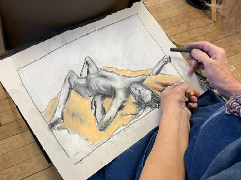 Posing in the round, I was asked for one 5-minute seated guru pose then three more variations turning 90° for 2 minutes each time. Cleo provided advice to artists before, during and after every change, with discussion, engagement and sharing throughout. Clearly I had entered a close, characterful community. Next: the long pose.