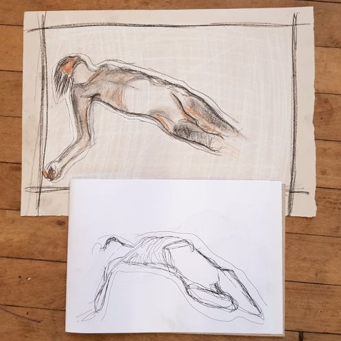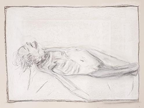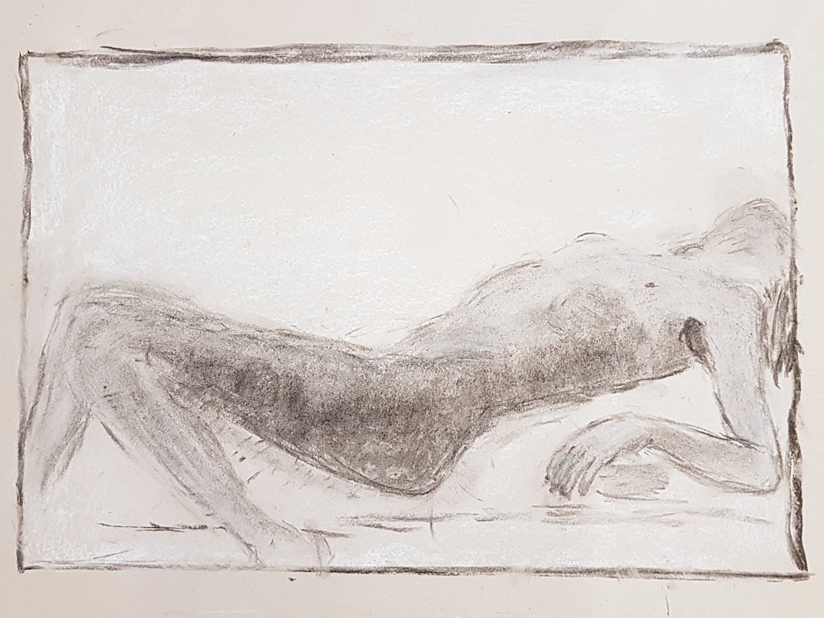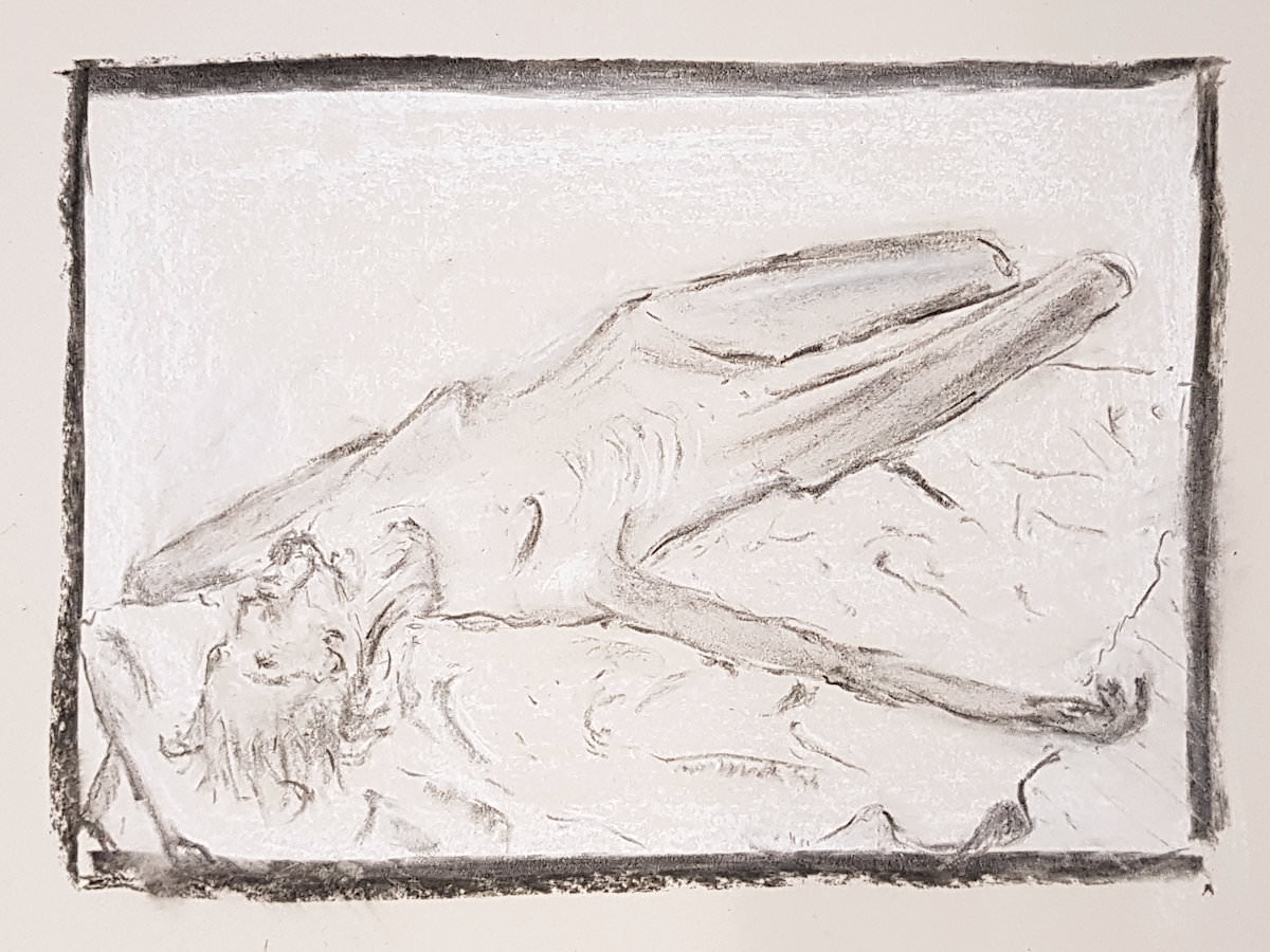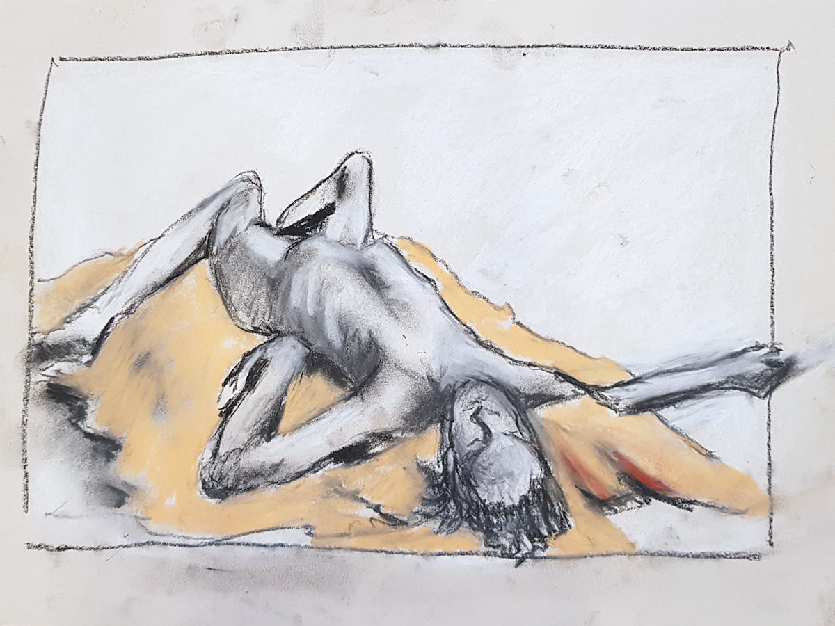 To support the planned tuition, I was asked specifically to lay down for the long pose. No problem! But more than that, to lay as if collapsed like a murder victim, with head lolling down to the floor from the cushions beneath me. I slumped into position with a few Schiele-esque angles in my limbs, and then remained in situ for 40 minutes.
