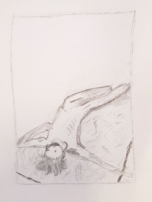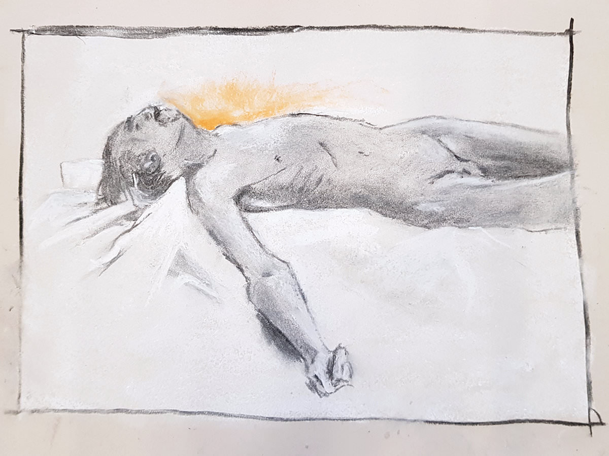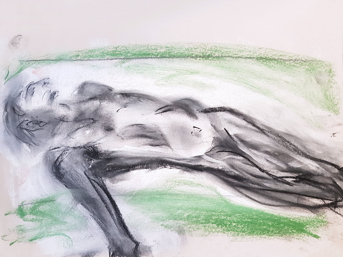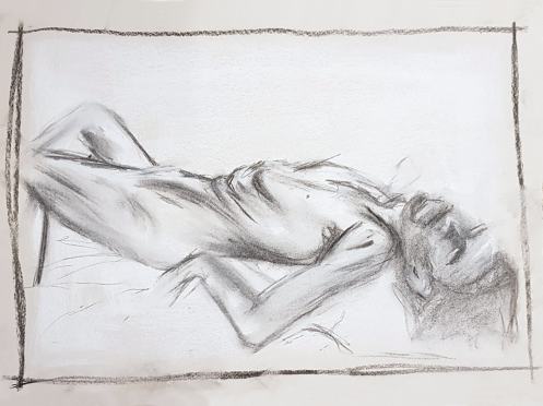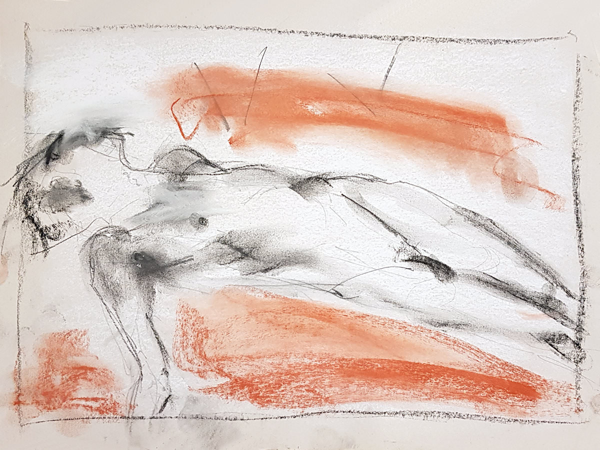 To support the planned tuition, I was asked specifically to lay down for the long pose. No problem! But more than that, to lay as if collapsed like a murder victim, with head lolling down to the floor from the cushions beneath me. I slumped into position with a few Schiele-esque angles in my limbs, and then remained in situ for 40 minutes.