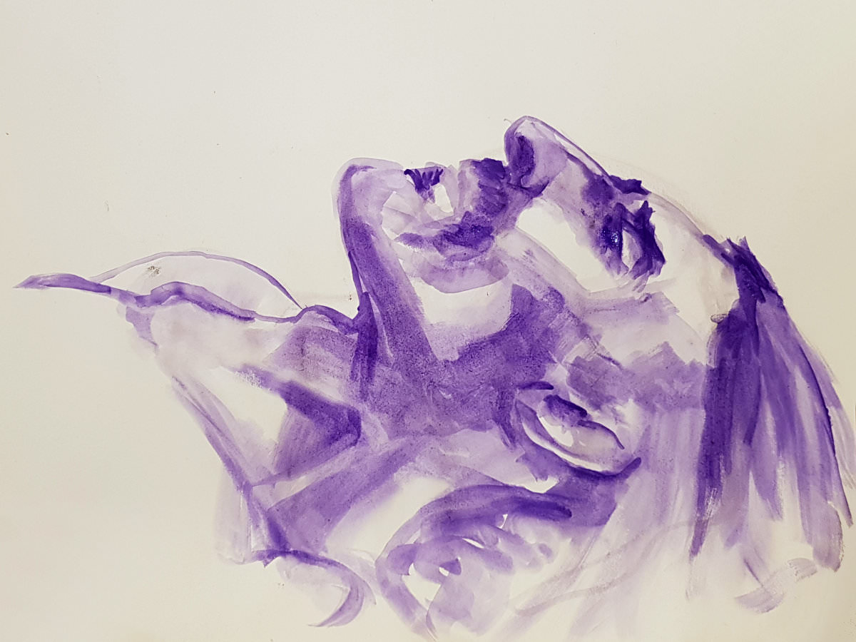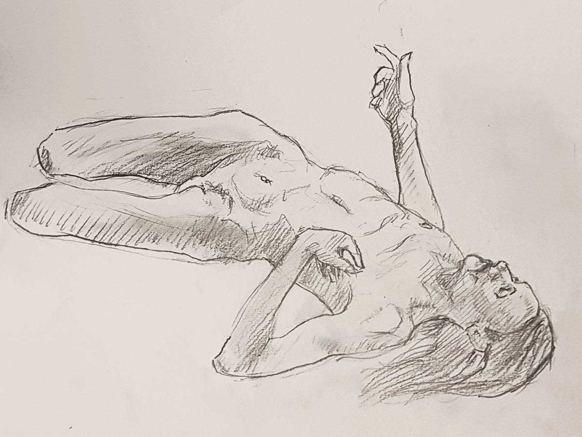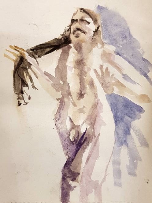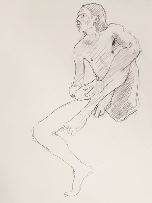 I’d indulged in some prop use: standing with two lengths of material – one black, one white – draped over my shoulders. To begin the second half I indulged some more: a seated pose clutching a long bamboo cane for 20 minutes. One final 20-minute pose reclining on a desperately-needed electric blanket concluded our evening’s work.
