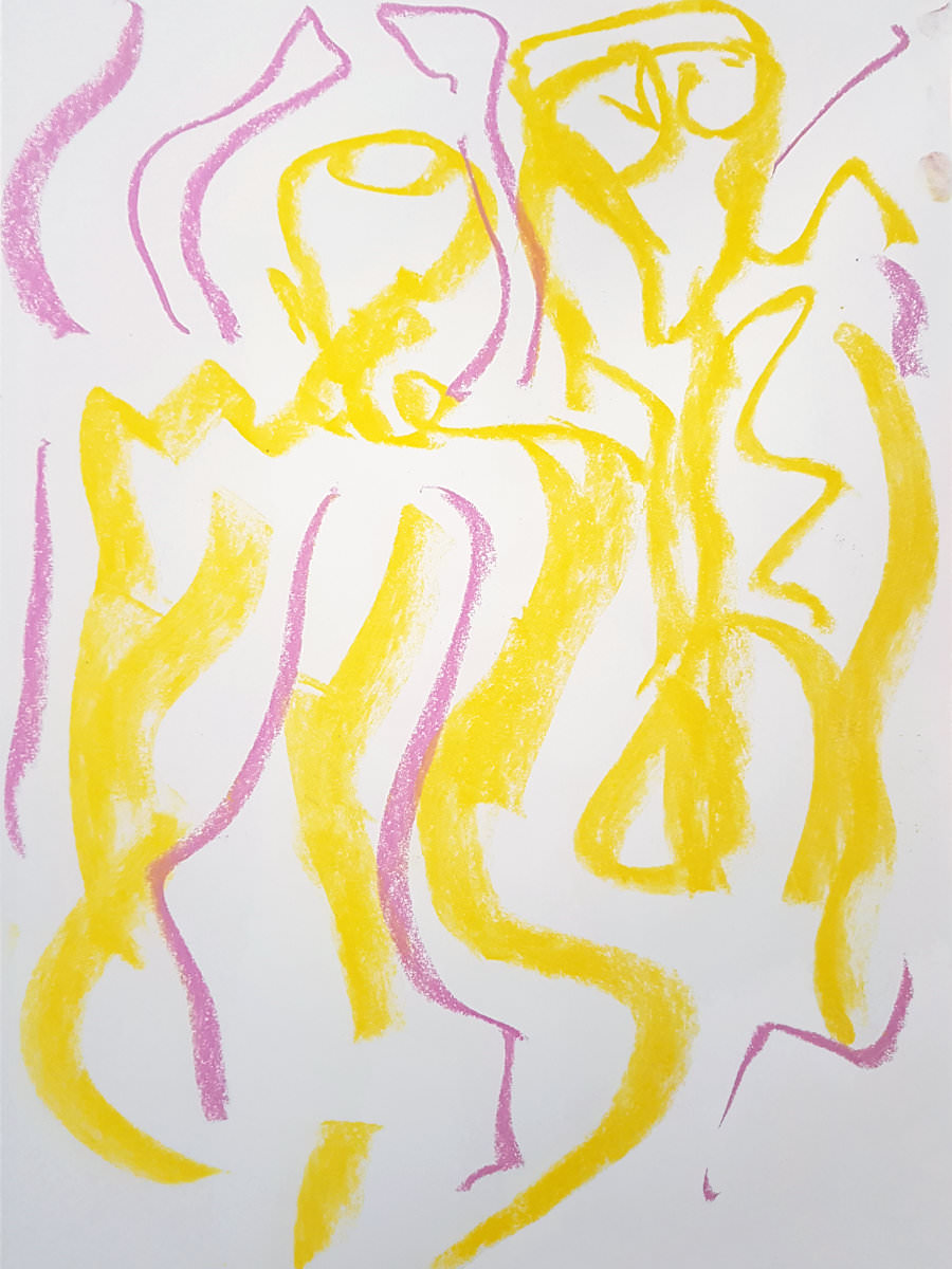 A fortnight after we’d first modelled for Avidyā as a couple, Esther and I returned to Avidyā’s studio to form new poses. Music was playing as before, but this time livelier. Of course, Esther began dancing so I began ‘dancing’ too, and before we knew it our starter had become a spontaneous movement pose.