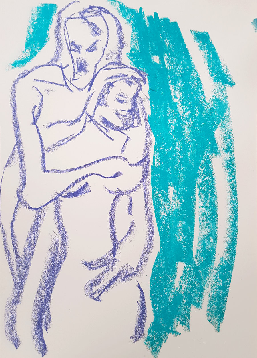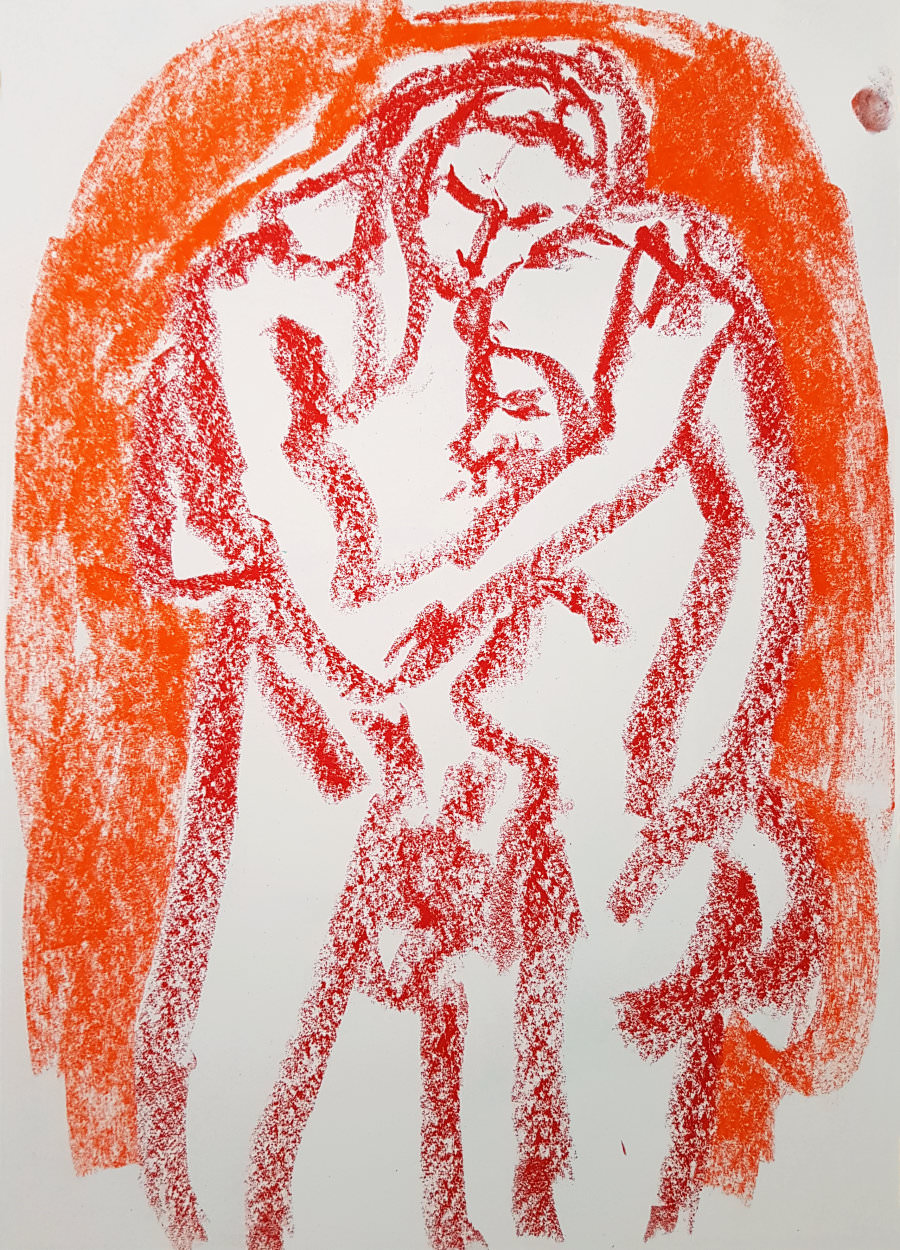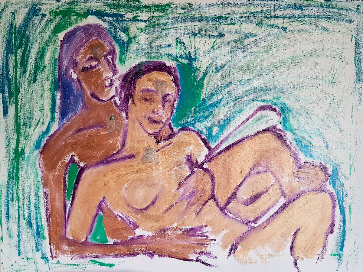 For our main pose, Esther directed me to sit upon the paper-covered cushioned floor and lean against the wall while she nestled between my legs, resting upon my chest, and once more we formed an embrace. Avidyā prepared a fresh canvas, readied her paints and set to work…