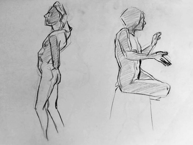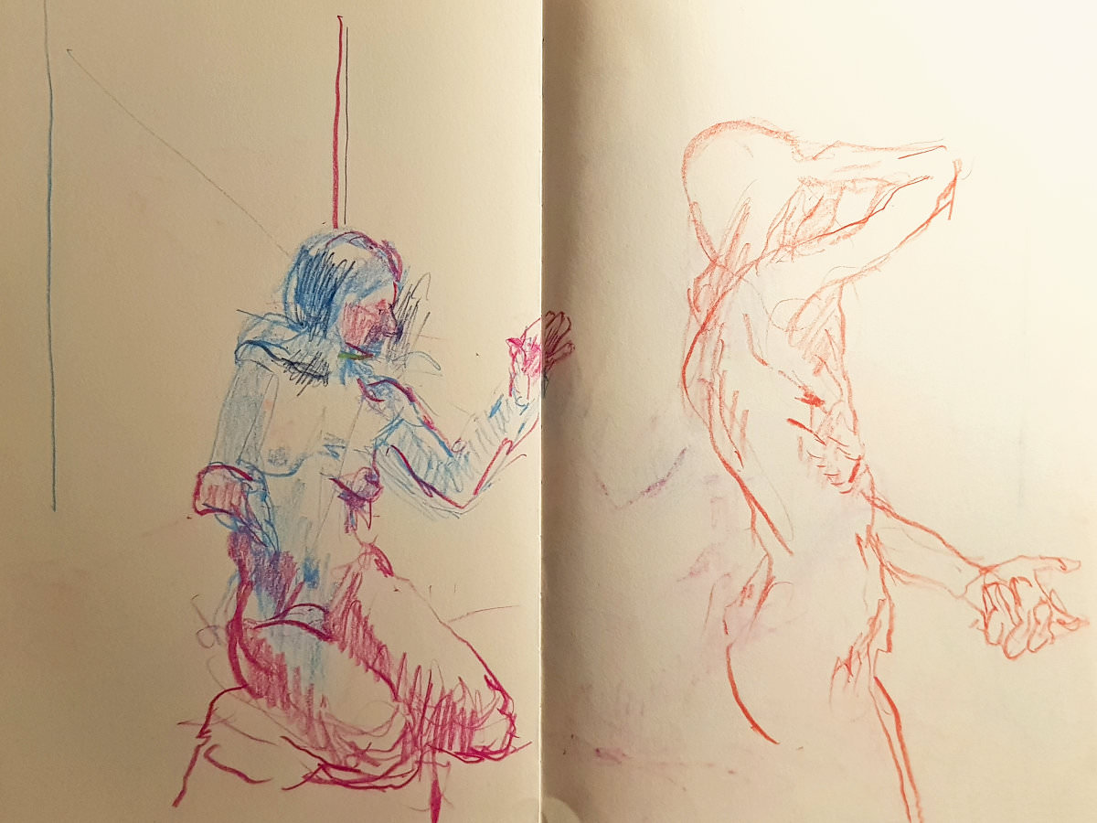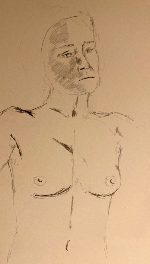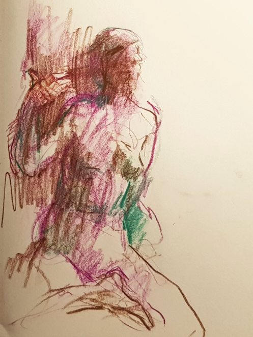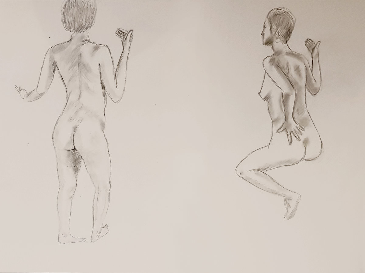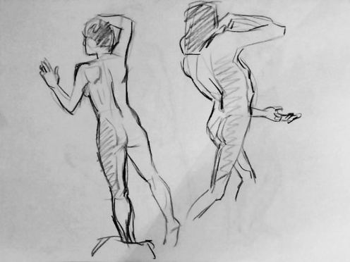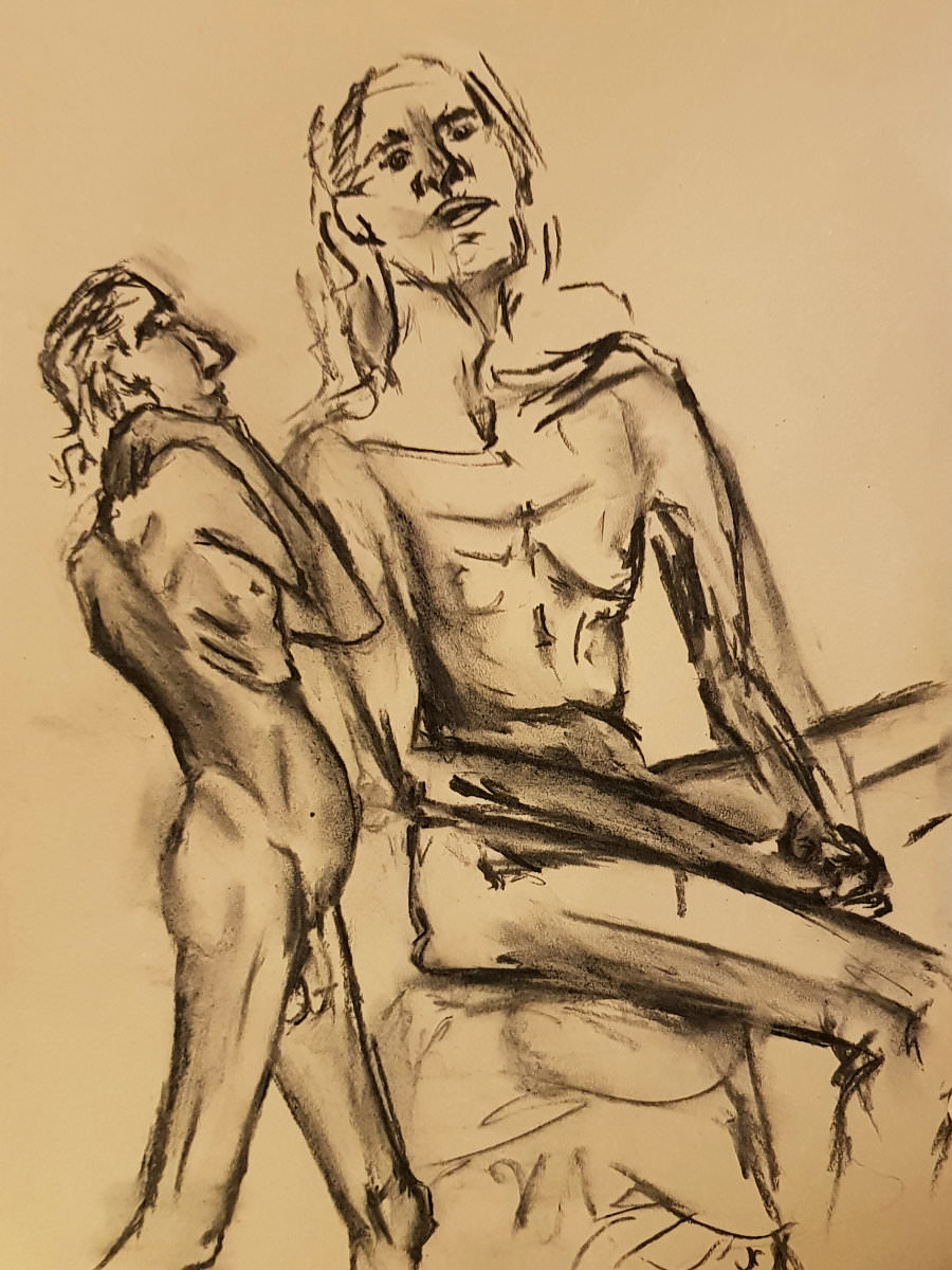 With such quickfire work from the outset, it was probably a kindness to artists that we weren’t able to intertwine. For the rest of this first half one of us stood whilst the other sat on a stool. Poses of 10 minutes, 15 minutes and 12 minutes took us to half-time.