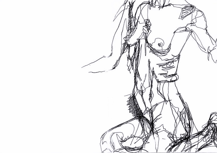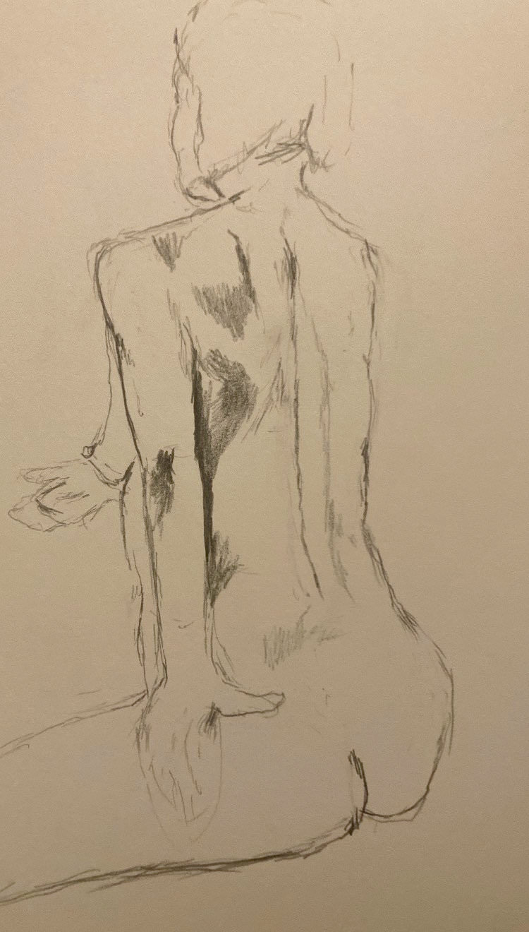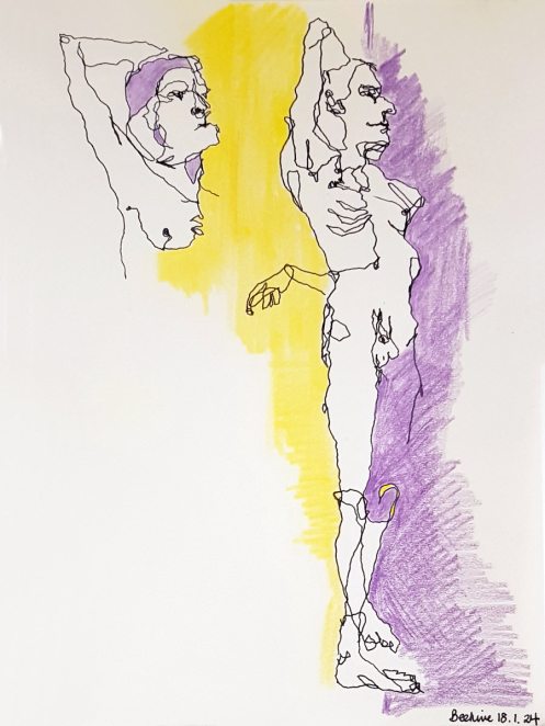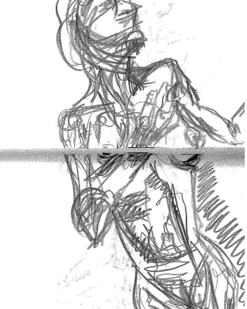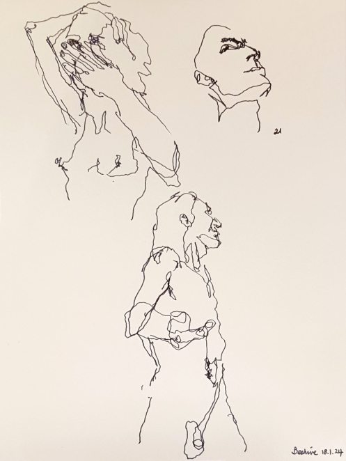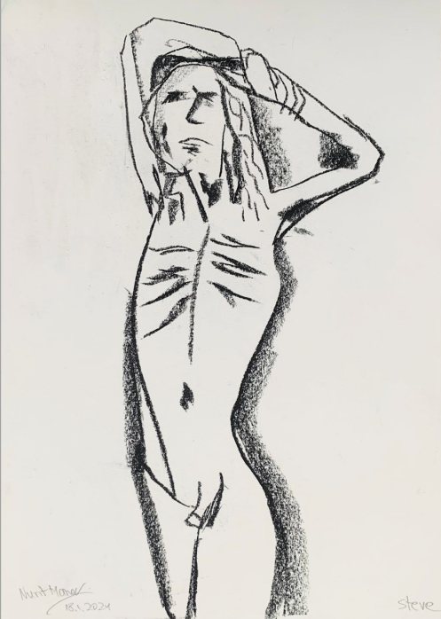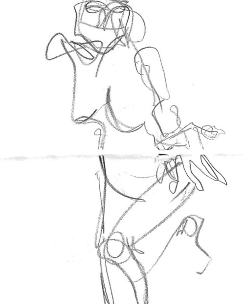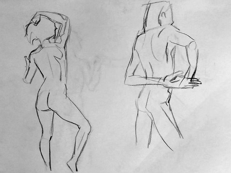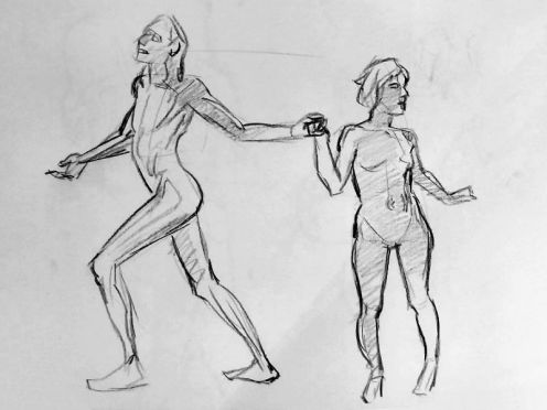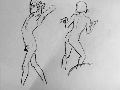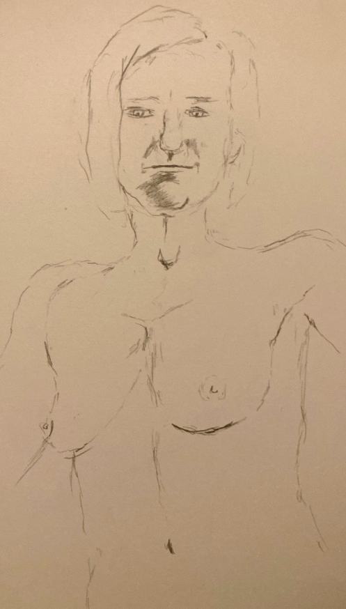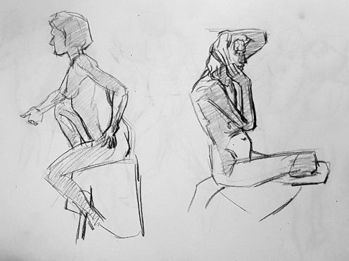 With such quickfire work from the outset, it was probably a kindness to artists that we weren’t able to intertwine. For the rest of this first half one of us stood whilst the other sat on a stool. Poses of 10 minutes, 15 minutes and 12 minutes took us to half-time.