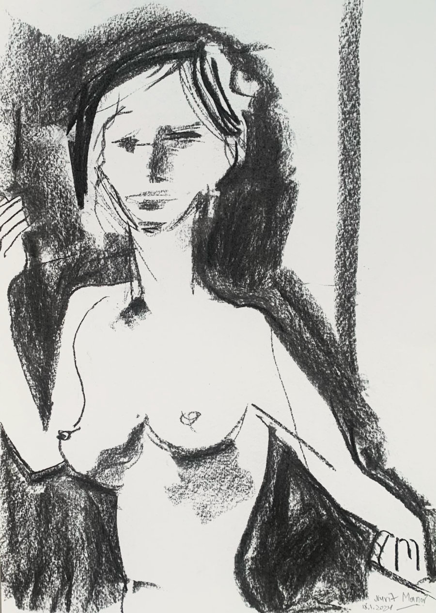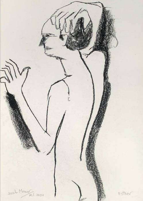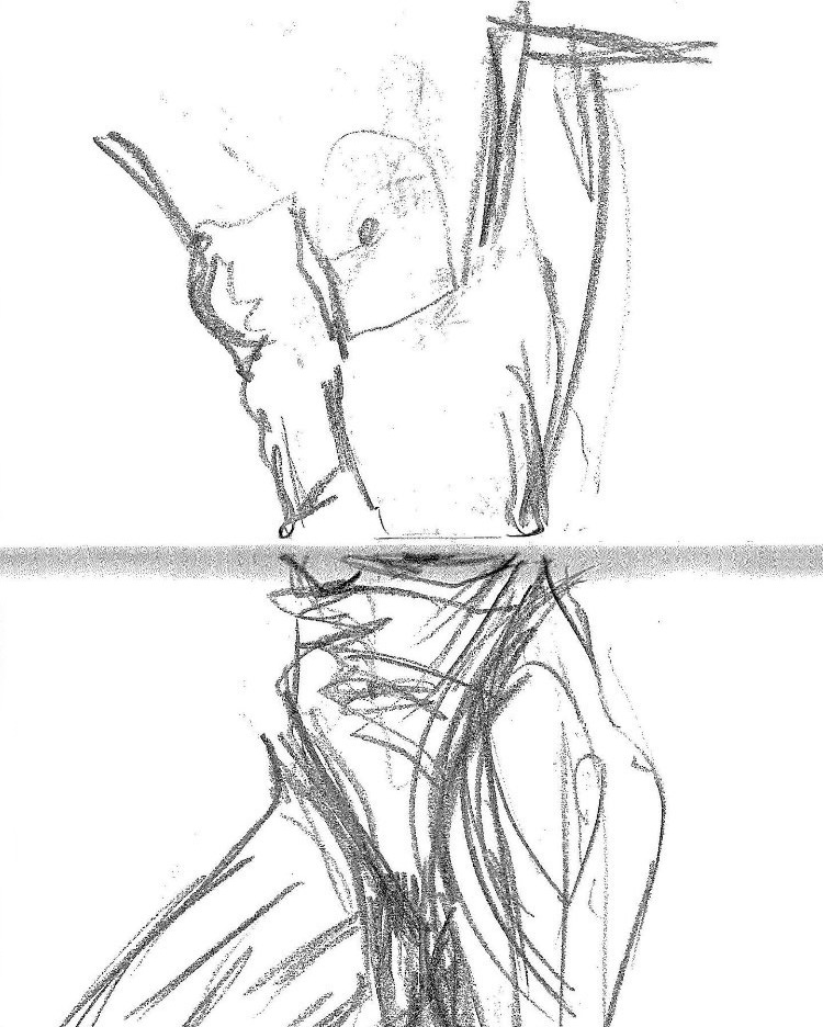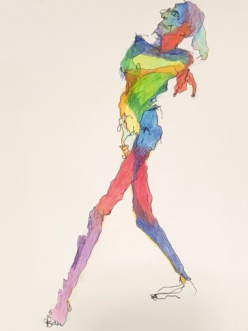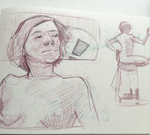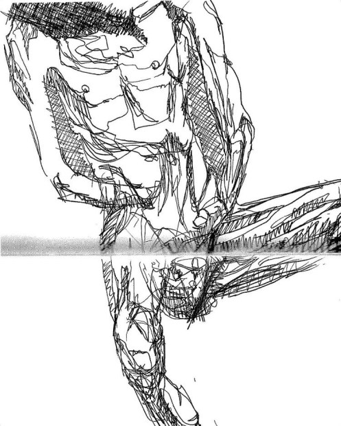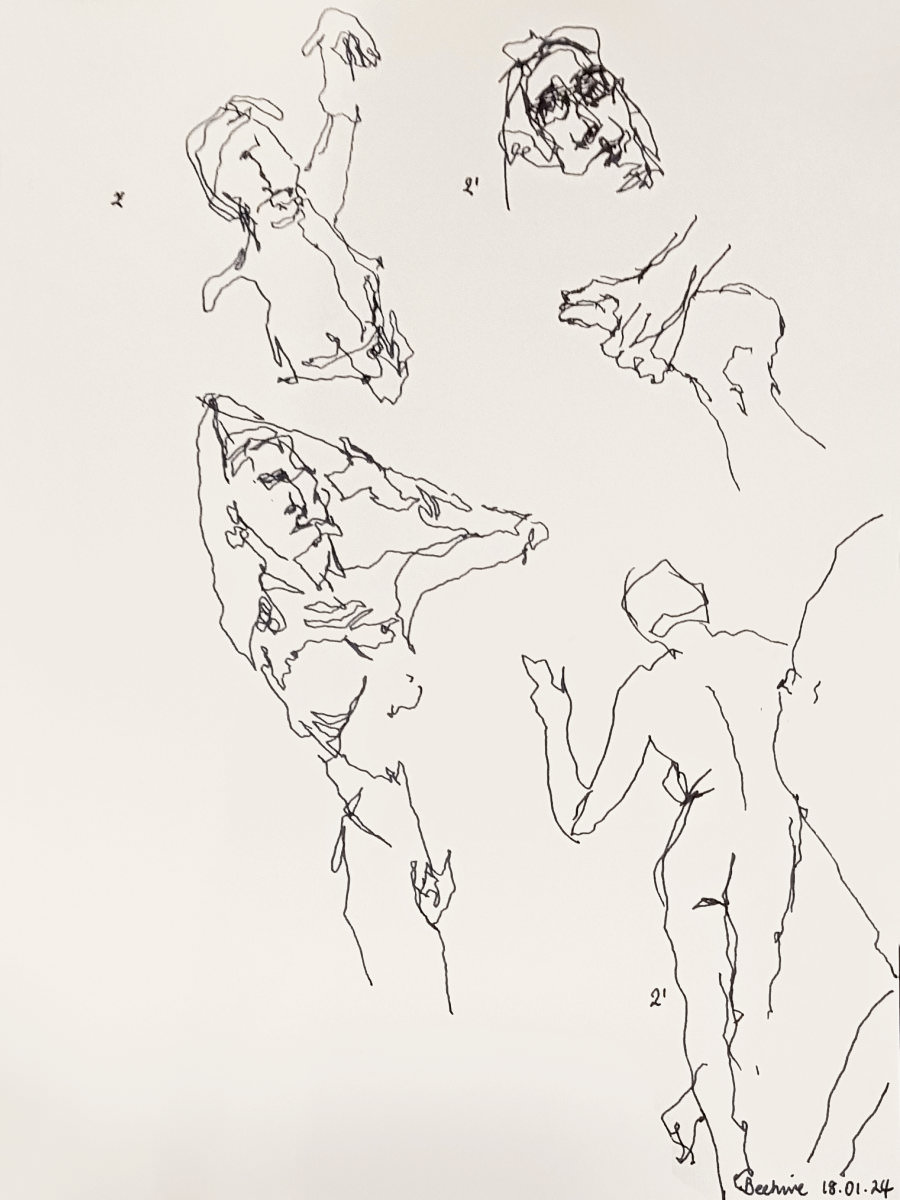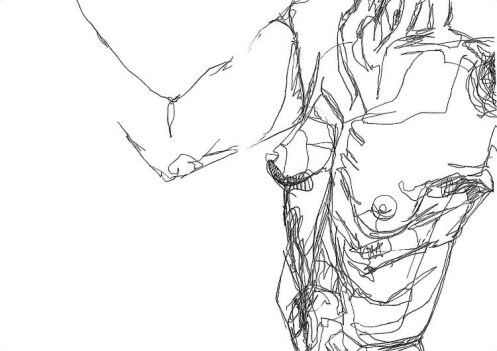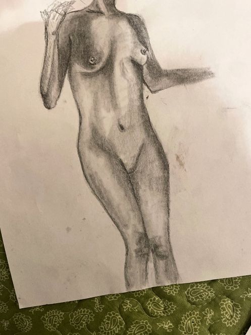 With such quickfire work from the outset, it was probably a kindness to artists that we weren’t able to intertwine. For the rest of this first half one of us stood whilst the other sat on a stool. Poses of 10 minutes, 15 minutes and 12 minutes took us to half-time.