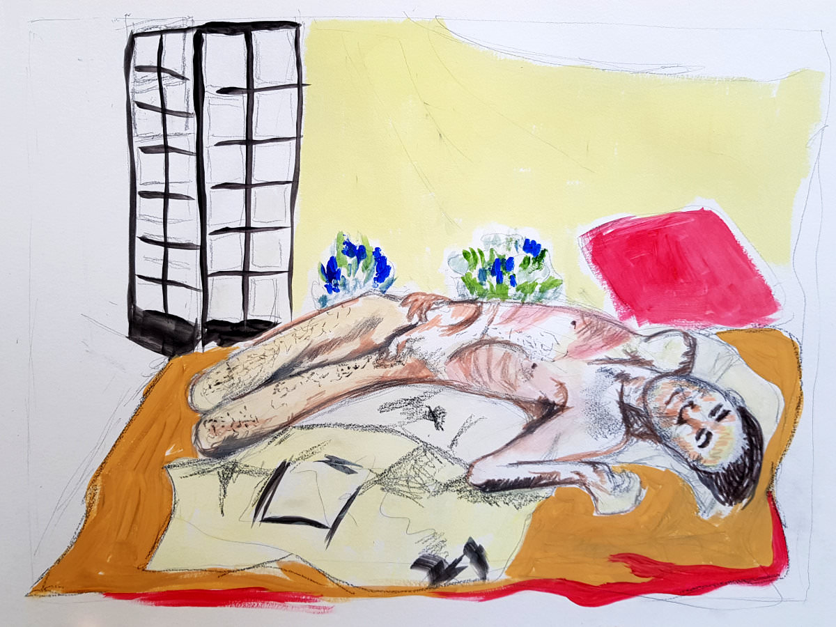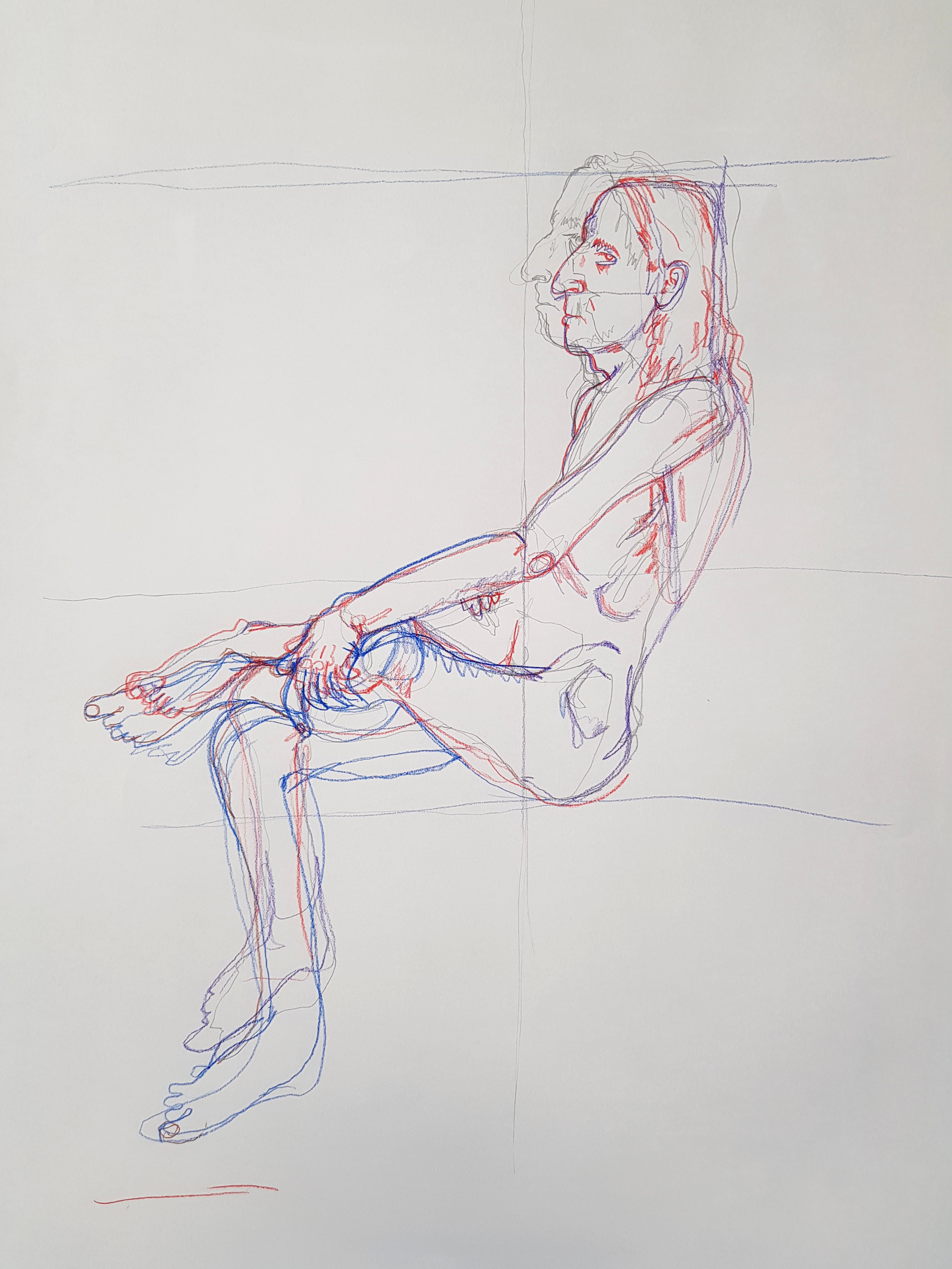 I was nicely comfortable and gladly agreed to a 5-minute extension. We took time out for lunch, then settled down to one long pose that completed the afternoon. I fidgeted into the most cosy reclining attitude achievable, and stayed there for 90 minutes.