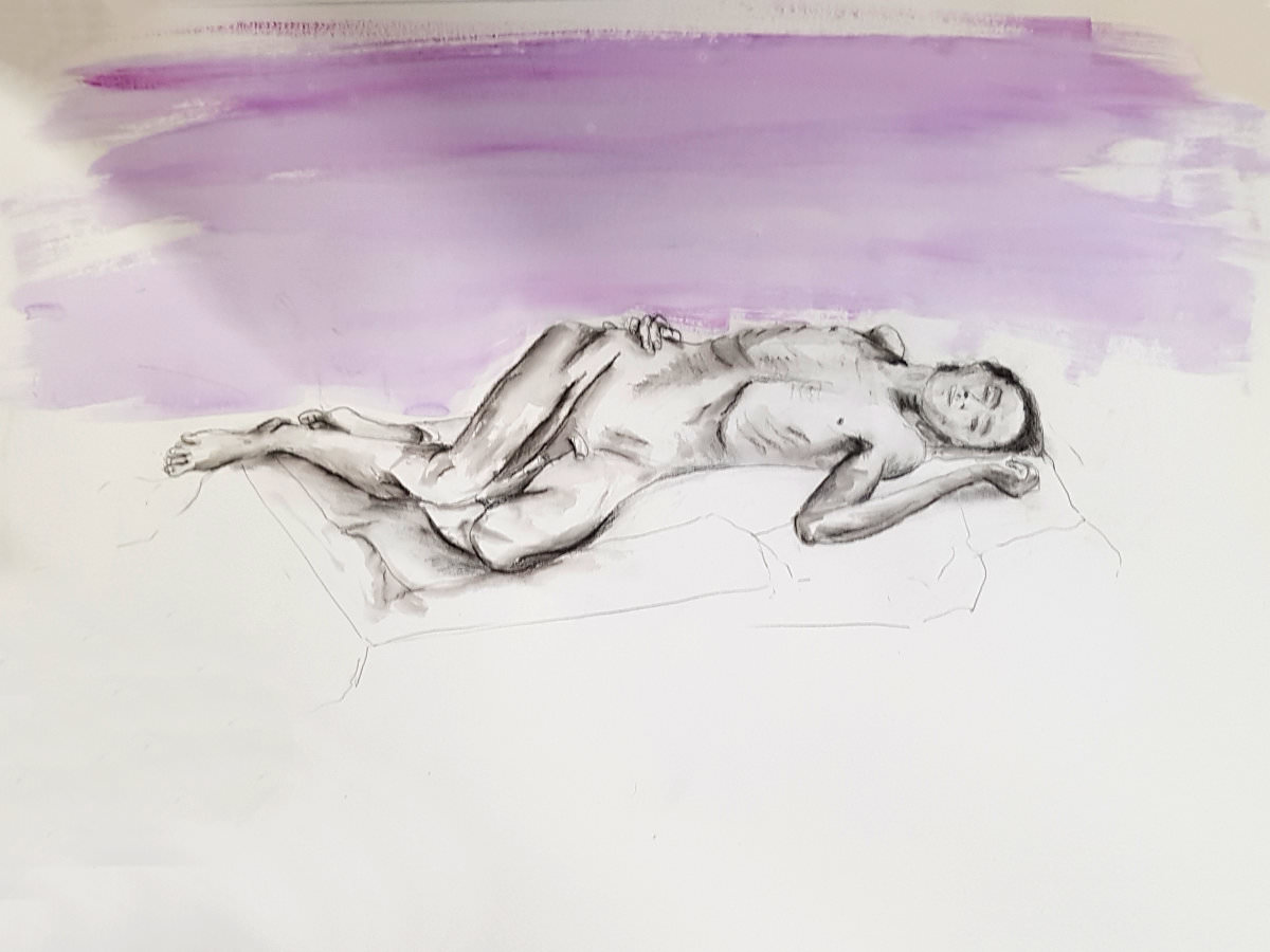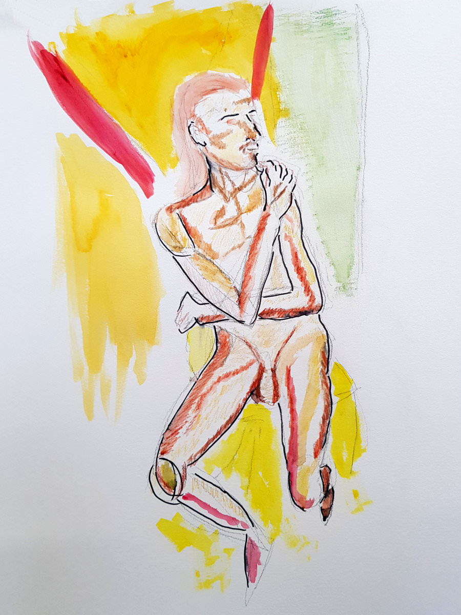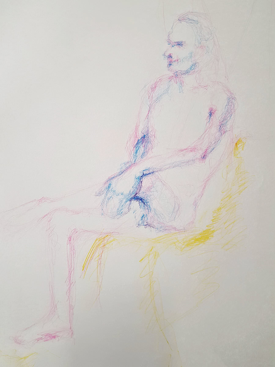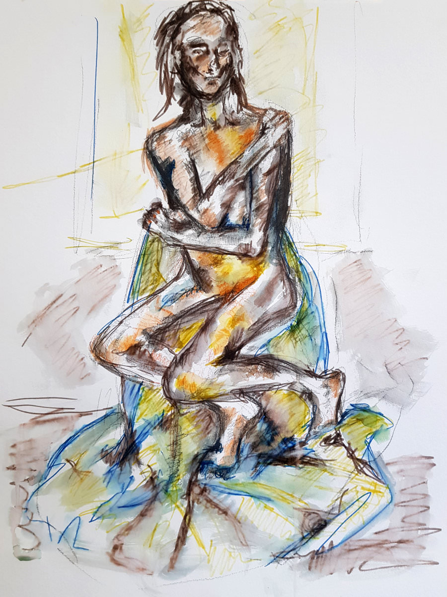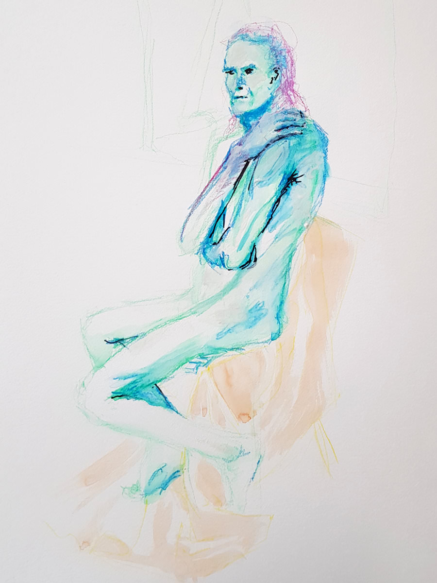 A short break followed, then out came graphite pencils, coloured pencils, watercolour pencils, and watercolour paints. Jo demonstrated techniques with each, before I took my seat once more and remained in pose for 45 minutes… which became 50.