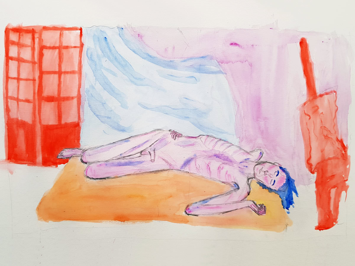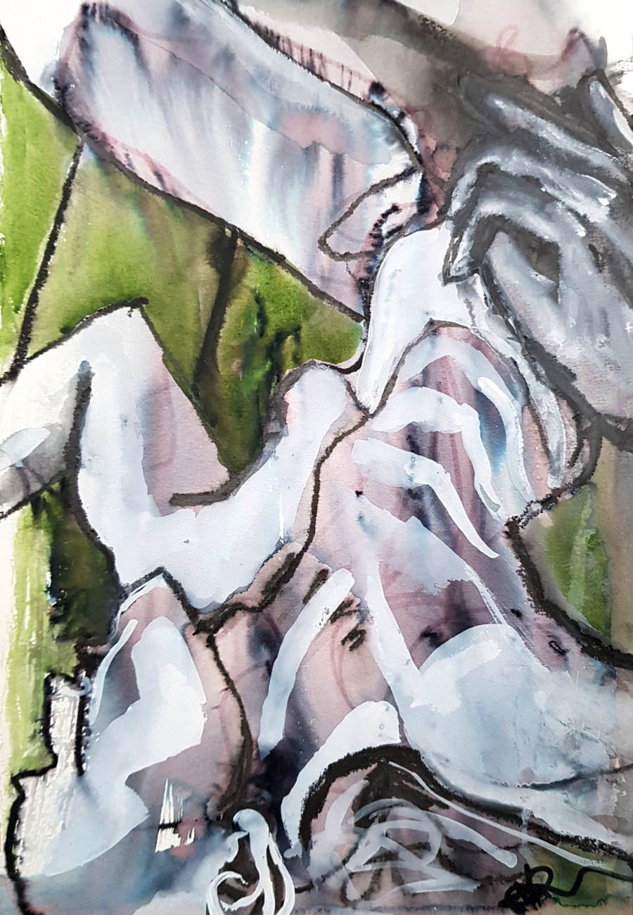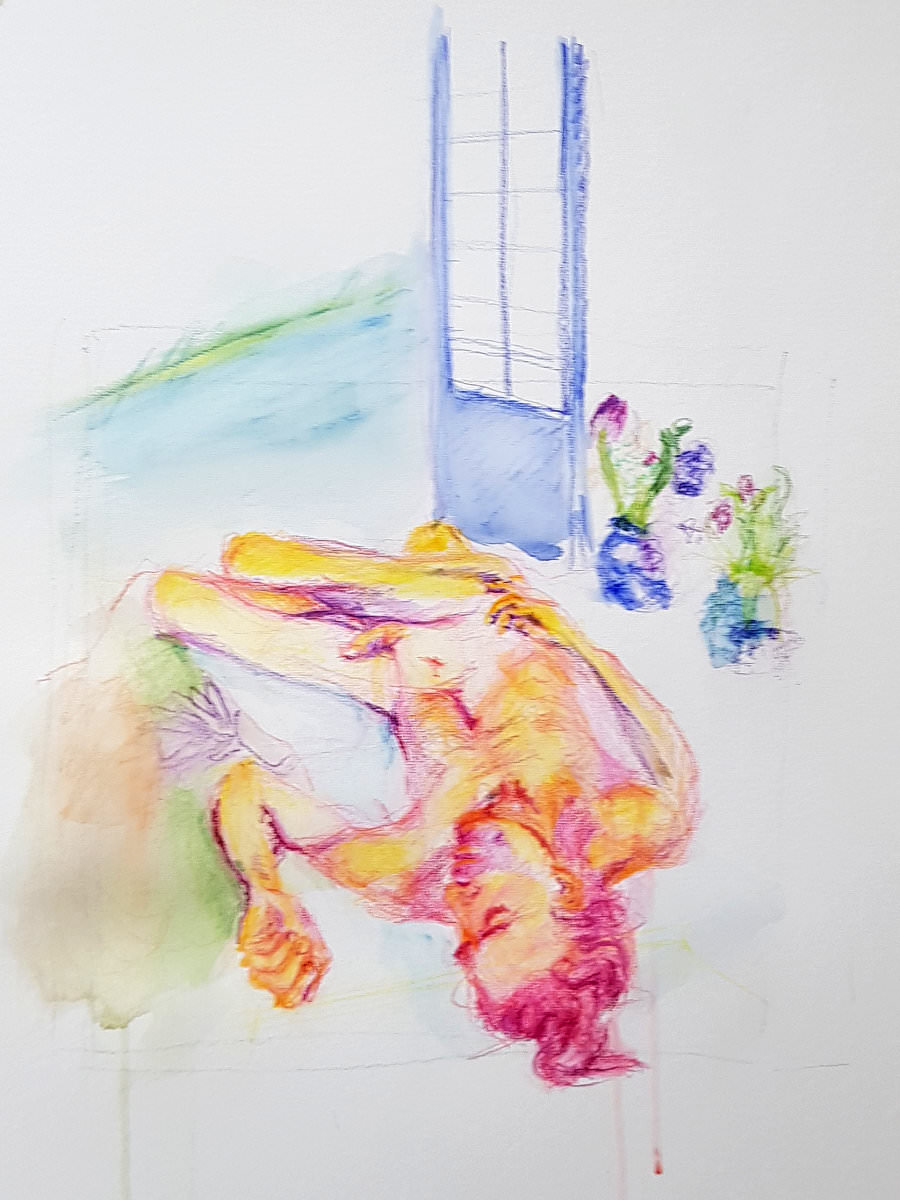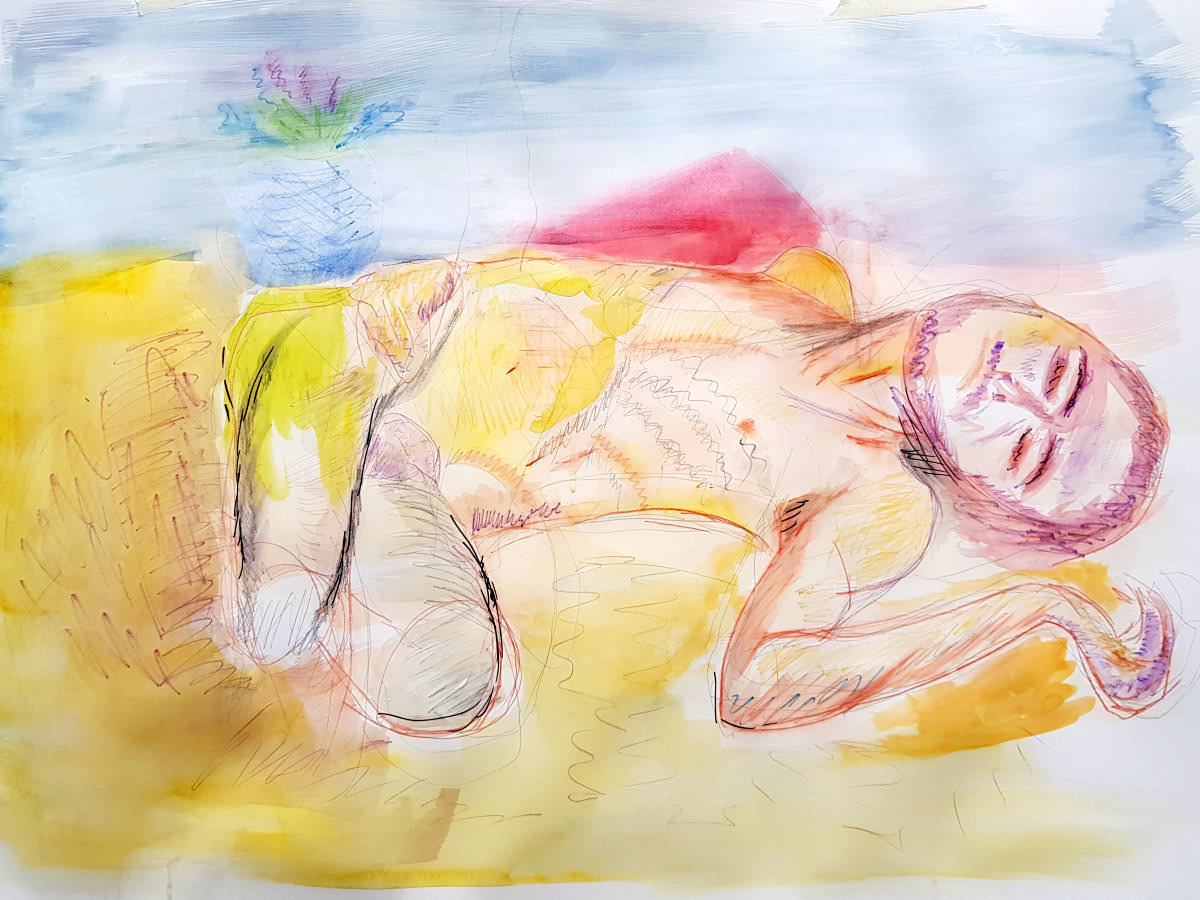 A short break followed, then out came graphite pencils, coloured pencils, watercolour pencils, and watercolour paints. Jo demonstrated techniques with each, before I took my seat once more and remained in pose for 45 minutes… which became 50.