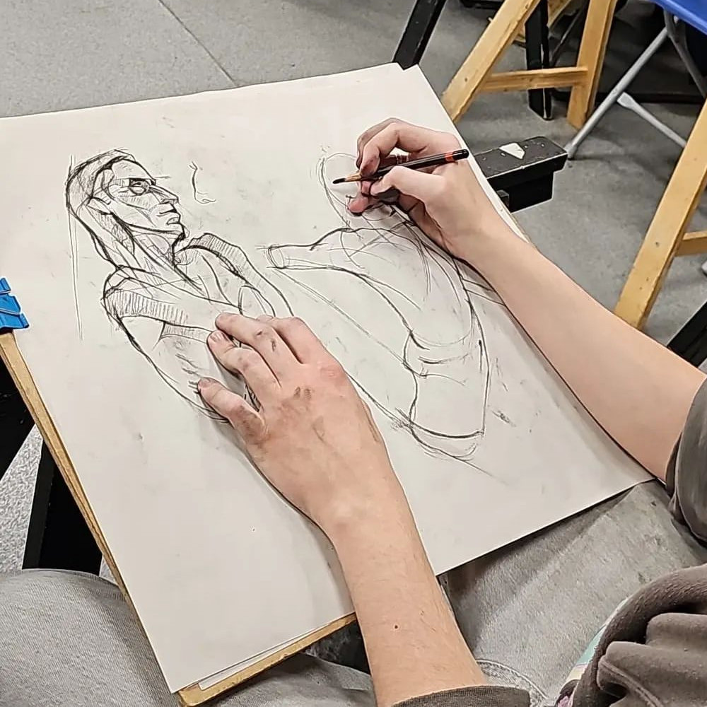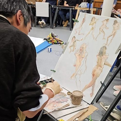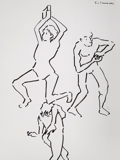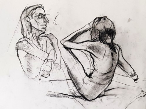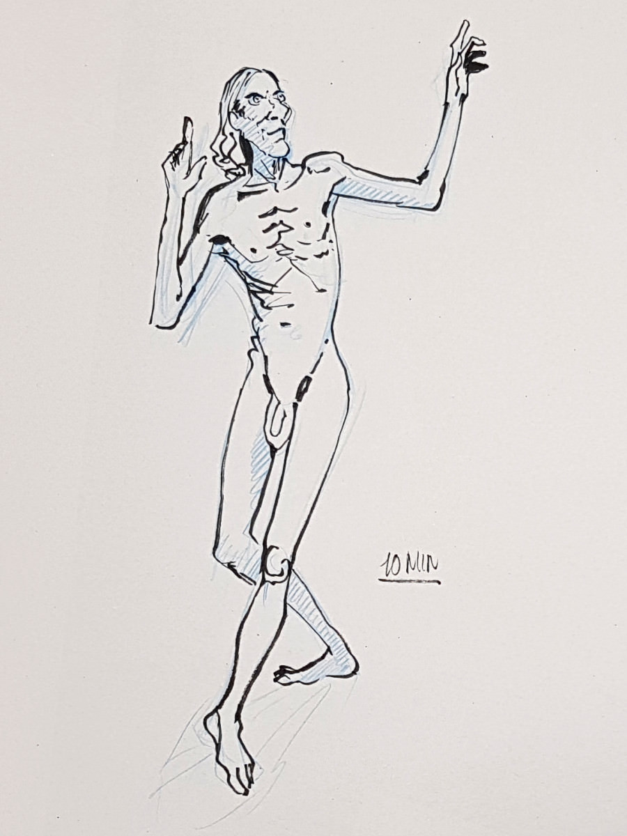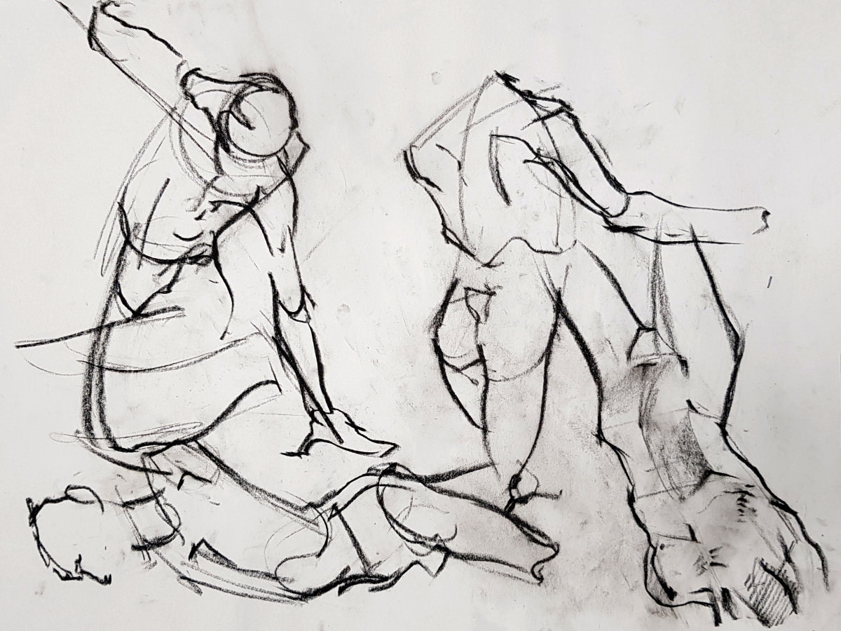 Anya stuck to a winning formula: artists on seats and at easels arranged in a square, model on gym mats at the centre, spotlight overhead, webcams for attendees online. We started with one 10-minute pose followed by five 1-minute poses, then continued with poses of 5, 10 and 20 minutes up to our break. Everything like clockwork.