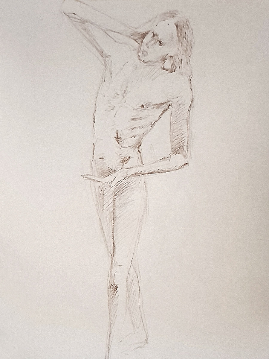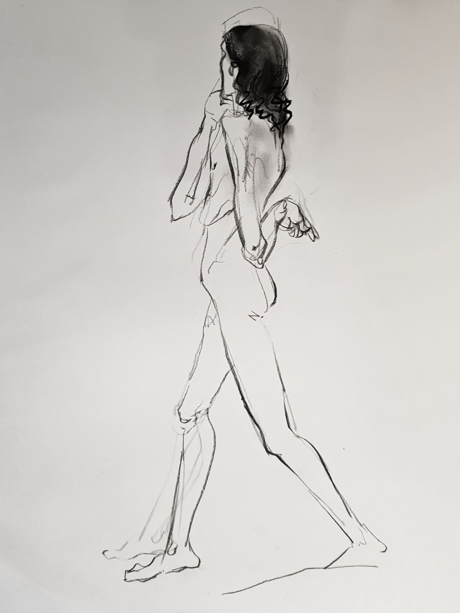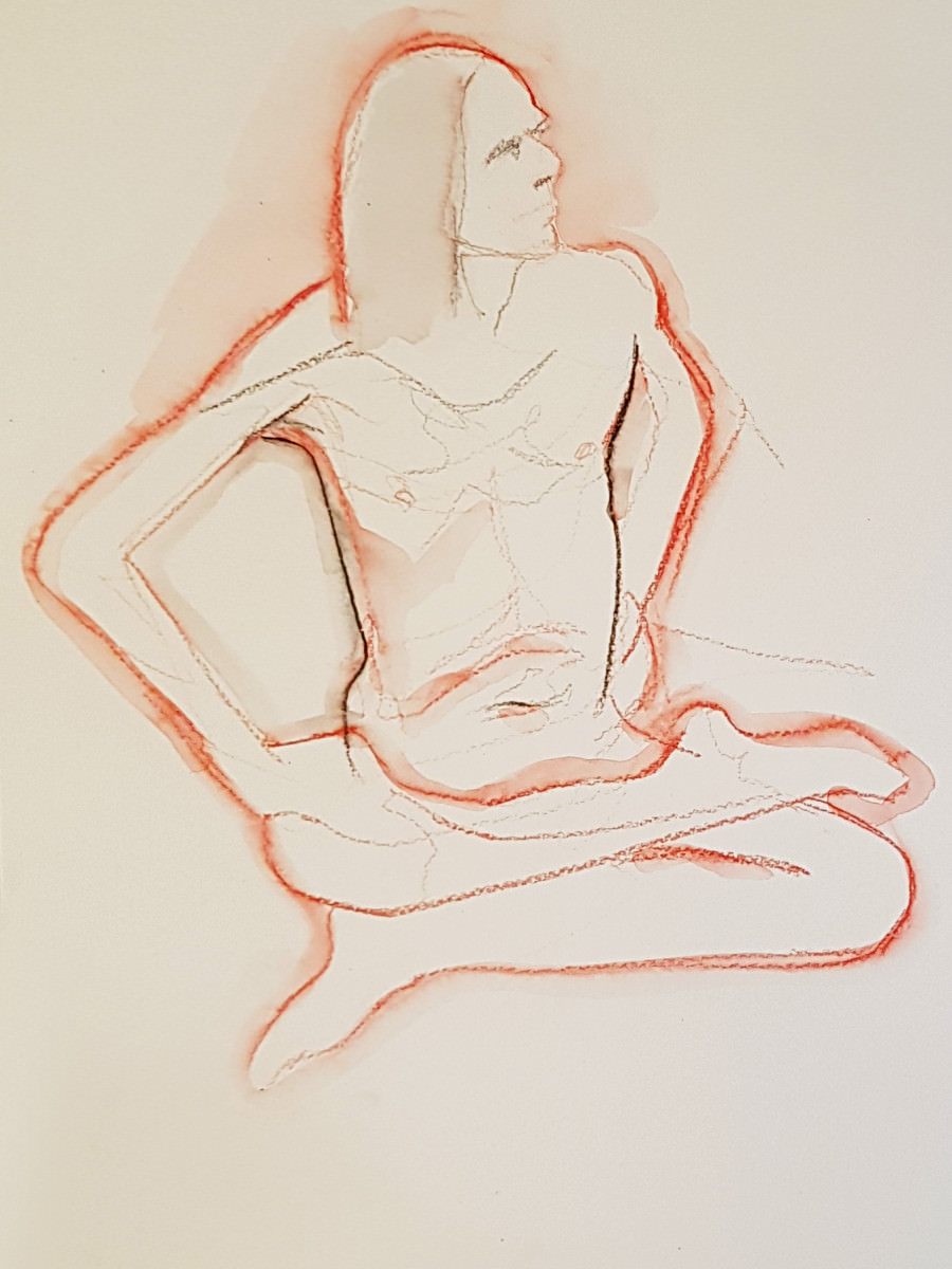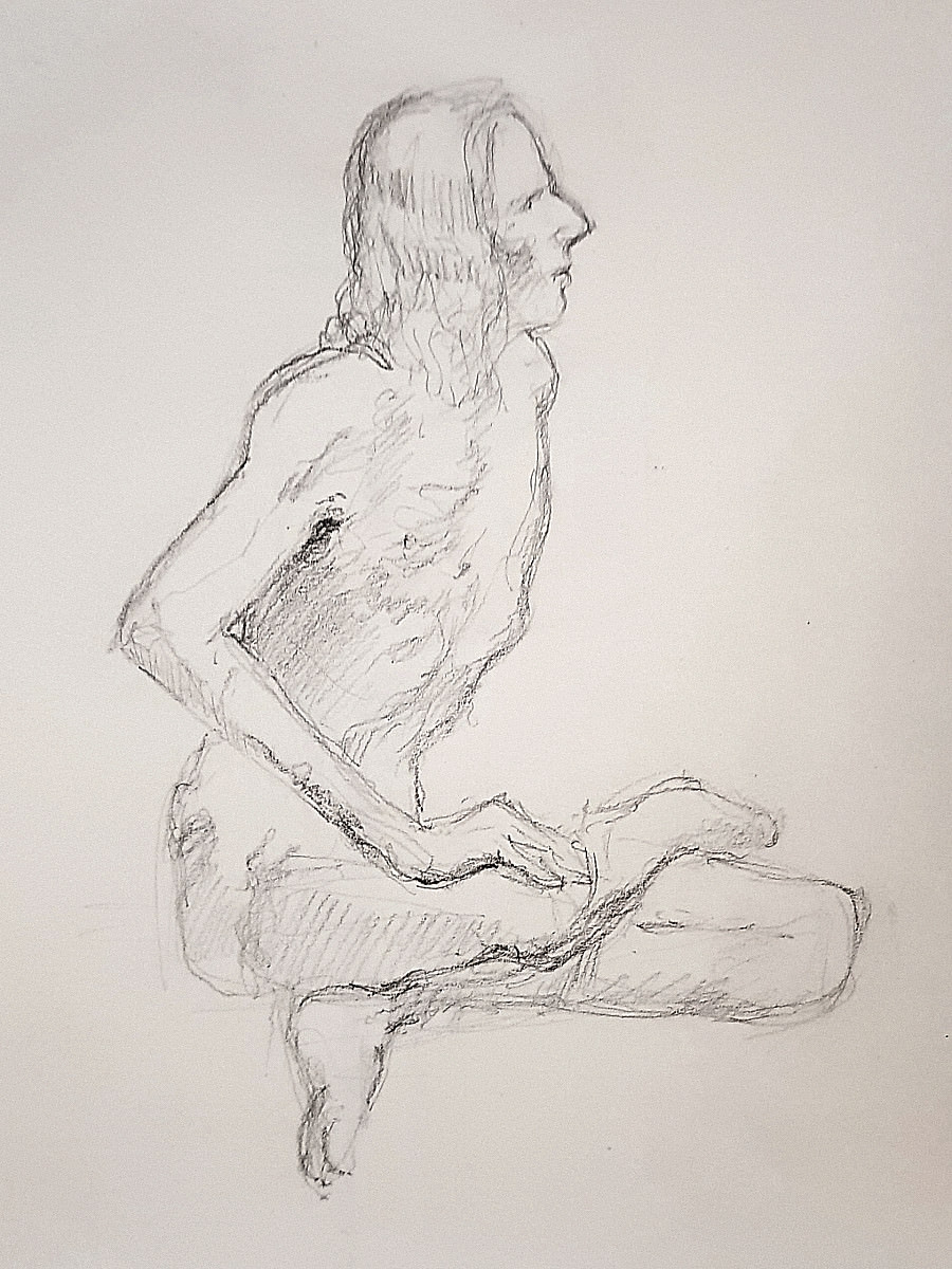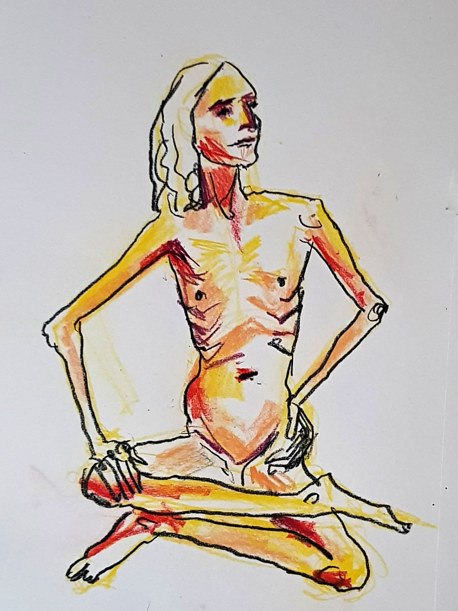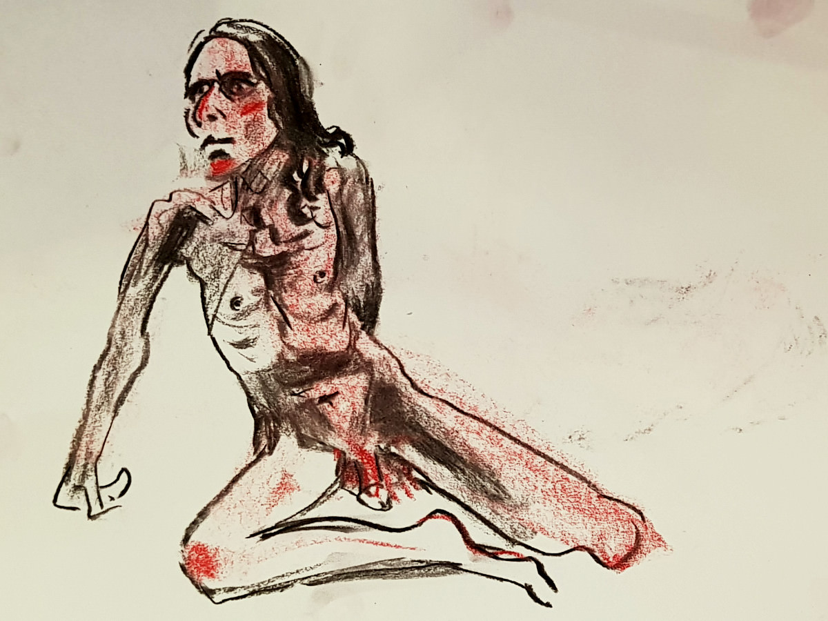 I’ve met many other talented artists during my thirty previous sessions as a life model in this space. People come and people go, but pacey poses, peppy playlists, passion for art, provision for all, plus a hint of Hackney hipness, make every occasion special. We started as always: poses of 5, 4, 3, 2, 1, 1, 1, half, half, half, 10 and 10 minutes.