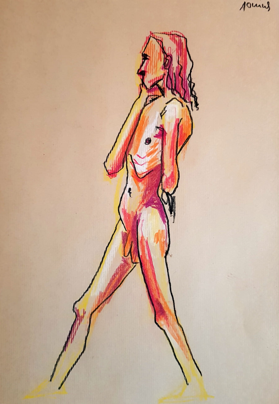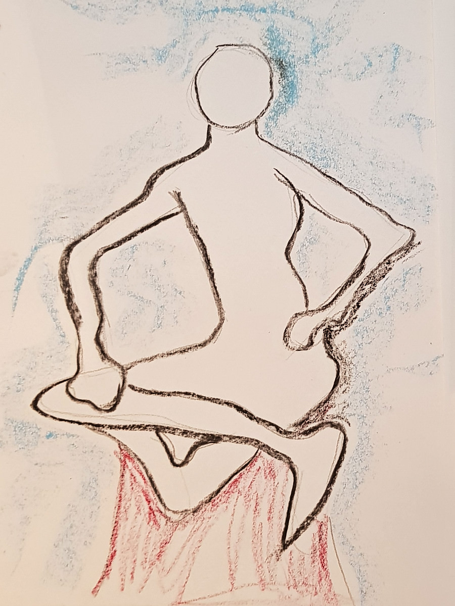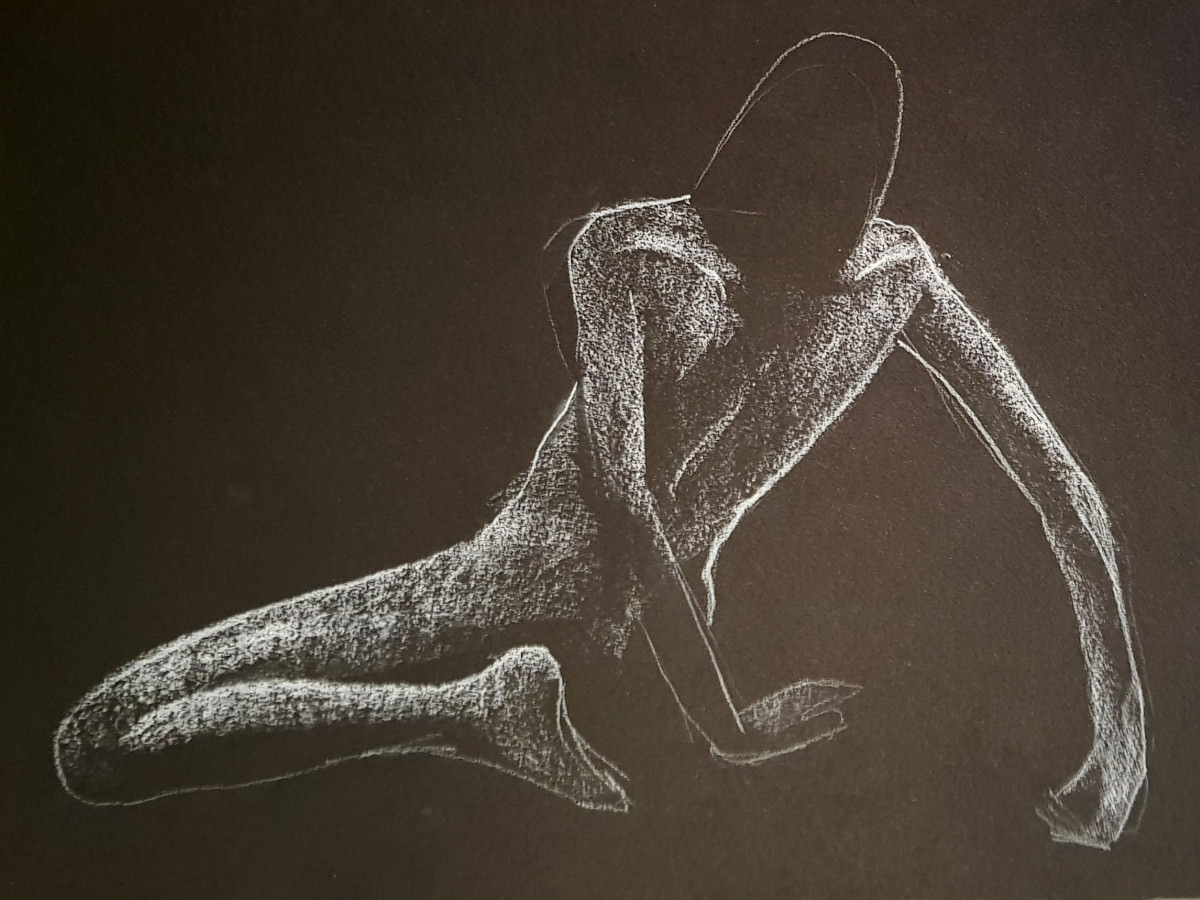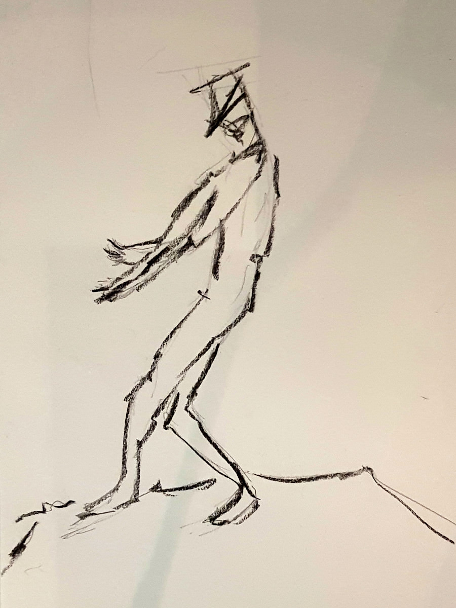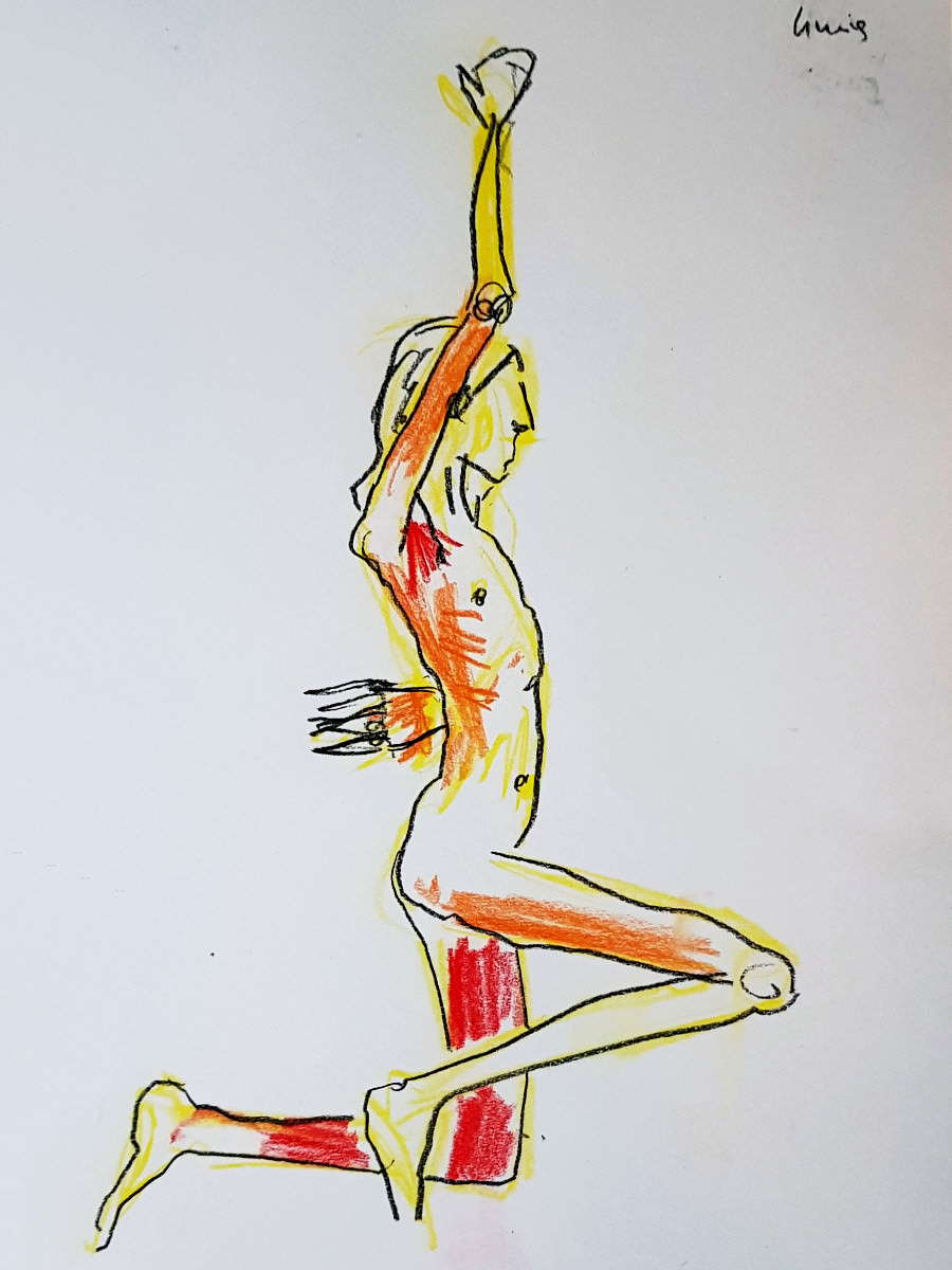I’ve met many other talented artists during my thirty previous sessions as a life model in this space. People come and people go, but pacey poses, peppy playlists, passion for art, provision for all, plus a hint of Hackney hipness, make every occasion special. We started as always: poses of 5, 4, 3, 2, 1, 1, 1, half, half, half, 10 and 10 minutes.