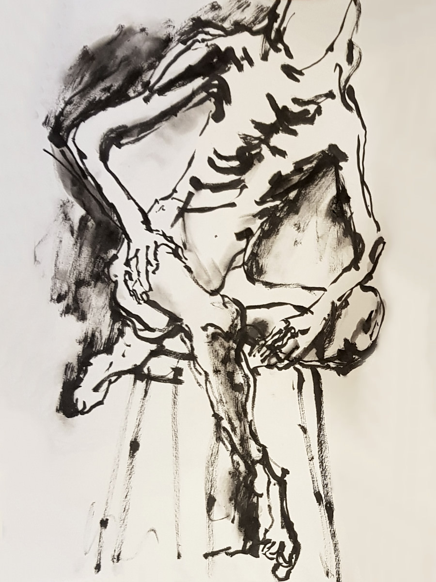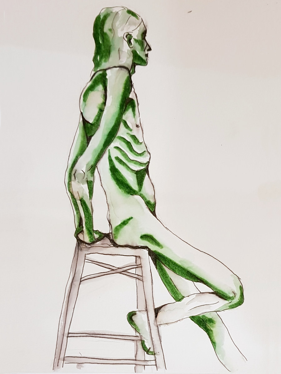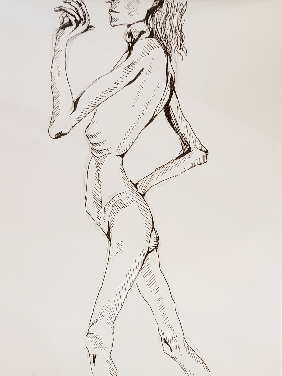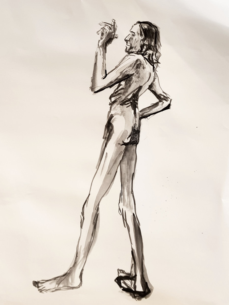 For the final 20-minute pose before our half-time break, I stood with my back arched, left foot a small pace forward, right hand on right hip, and left hand raised. During the interval, artists said they thought my raised arm must have ached. It hadn’t; but there was enough in that back arch to make this easily the session’s most painful pose.