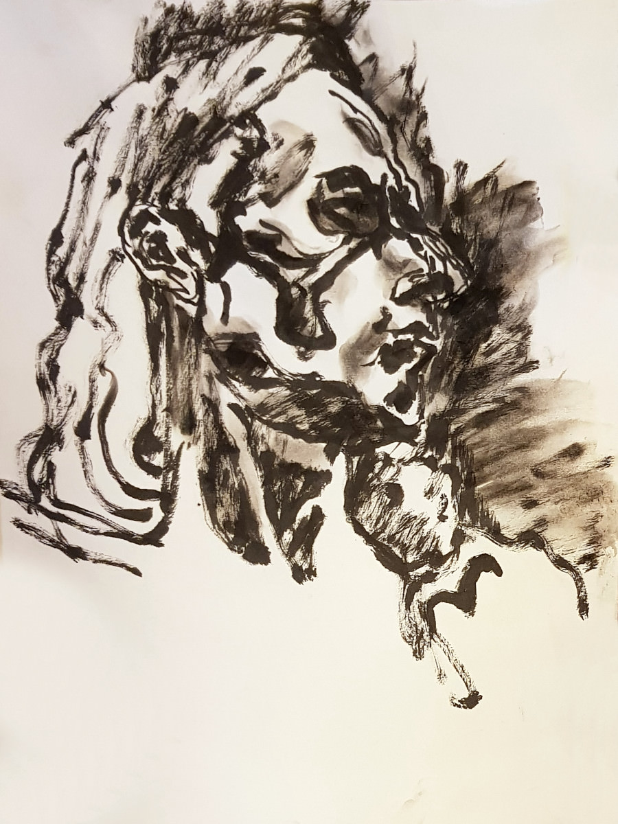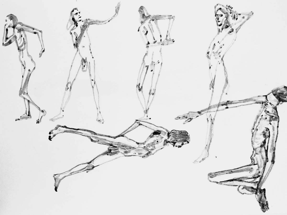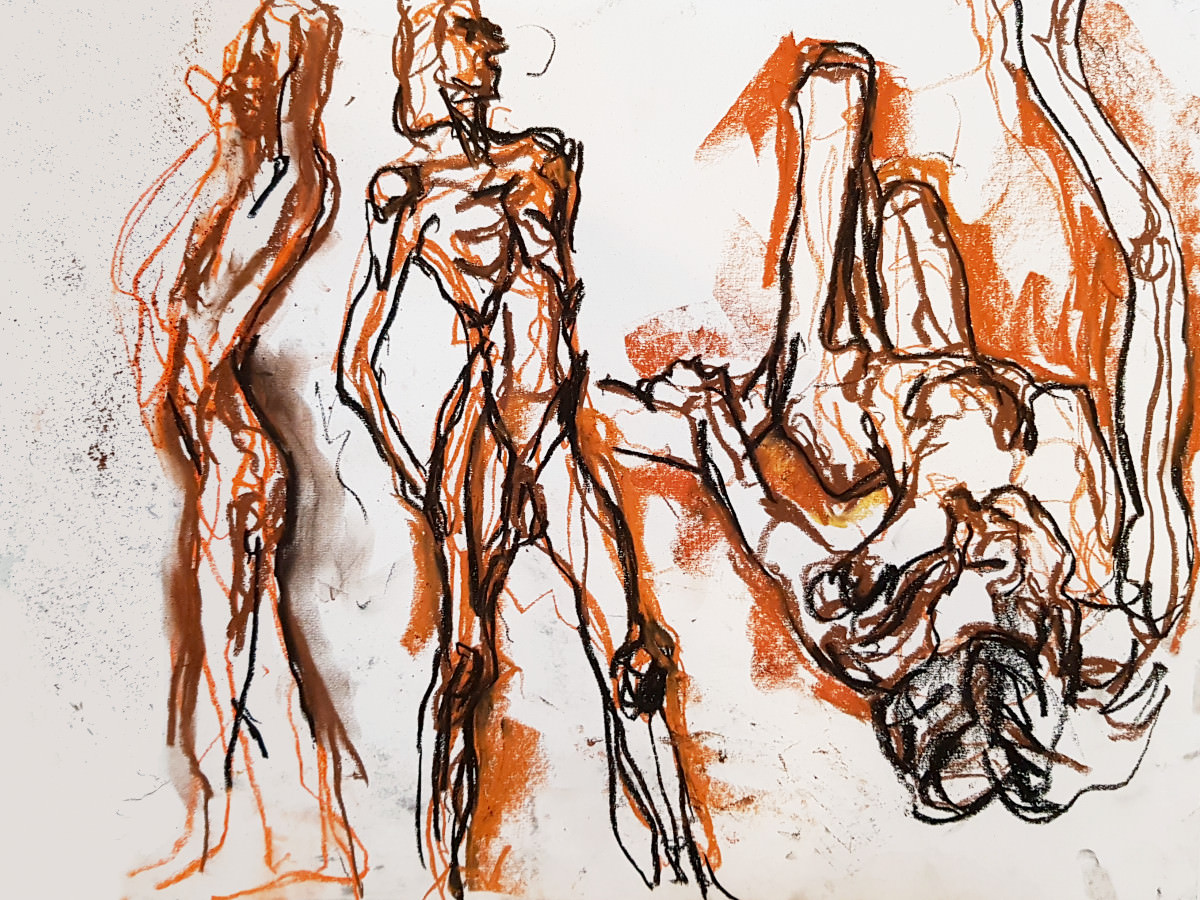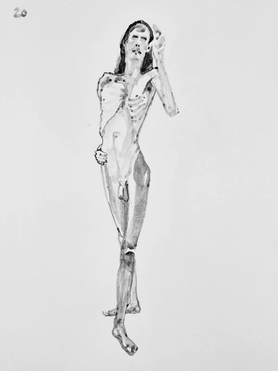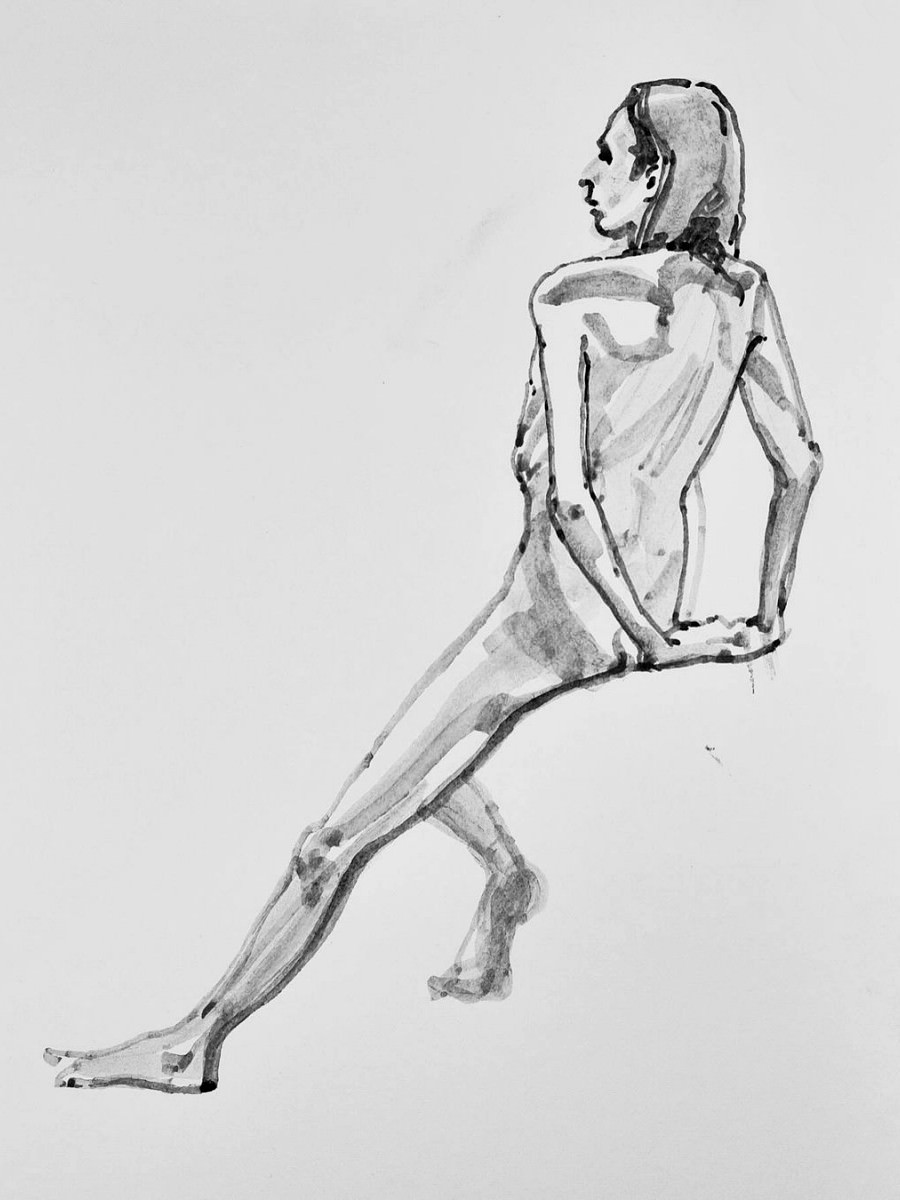For the final 20-minute pose before our half-time break, I stood with my back arched, left foot a small pace forward, right hand on right hip, and left hand raised. During the interval, artists said they thought my raised arm must have ached. It hadn’t; but there was enough in that back arch to make this easily the session’s most painful pose.