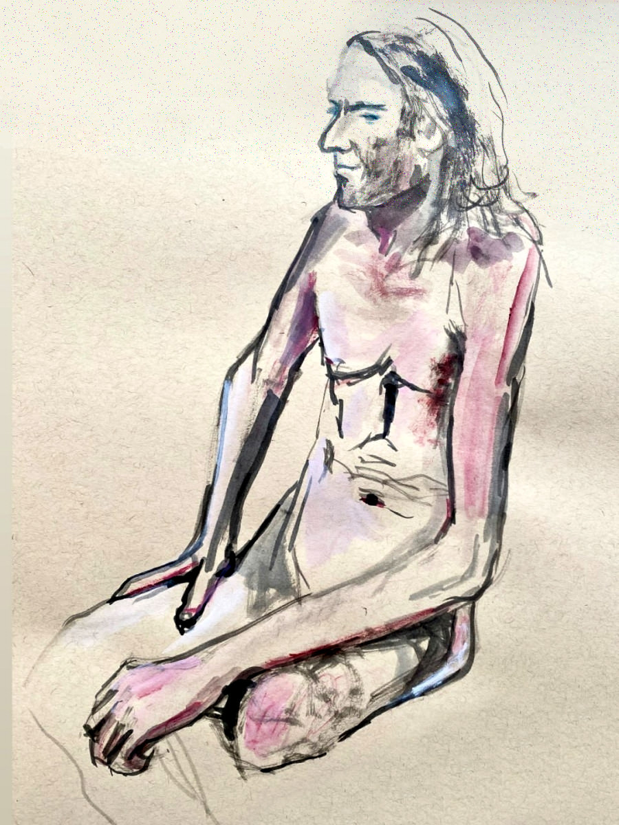 Two 20-minute poses concluded our second half. I sat upon a high bar stool for both, first facing north, then turning south. Not for polar alignment, but out of consideration for where most artists were clustered. It’s not possible to make each pose perfect for everyone in the round, but one does at least try to be fair to all… and please most!