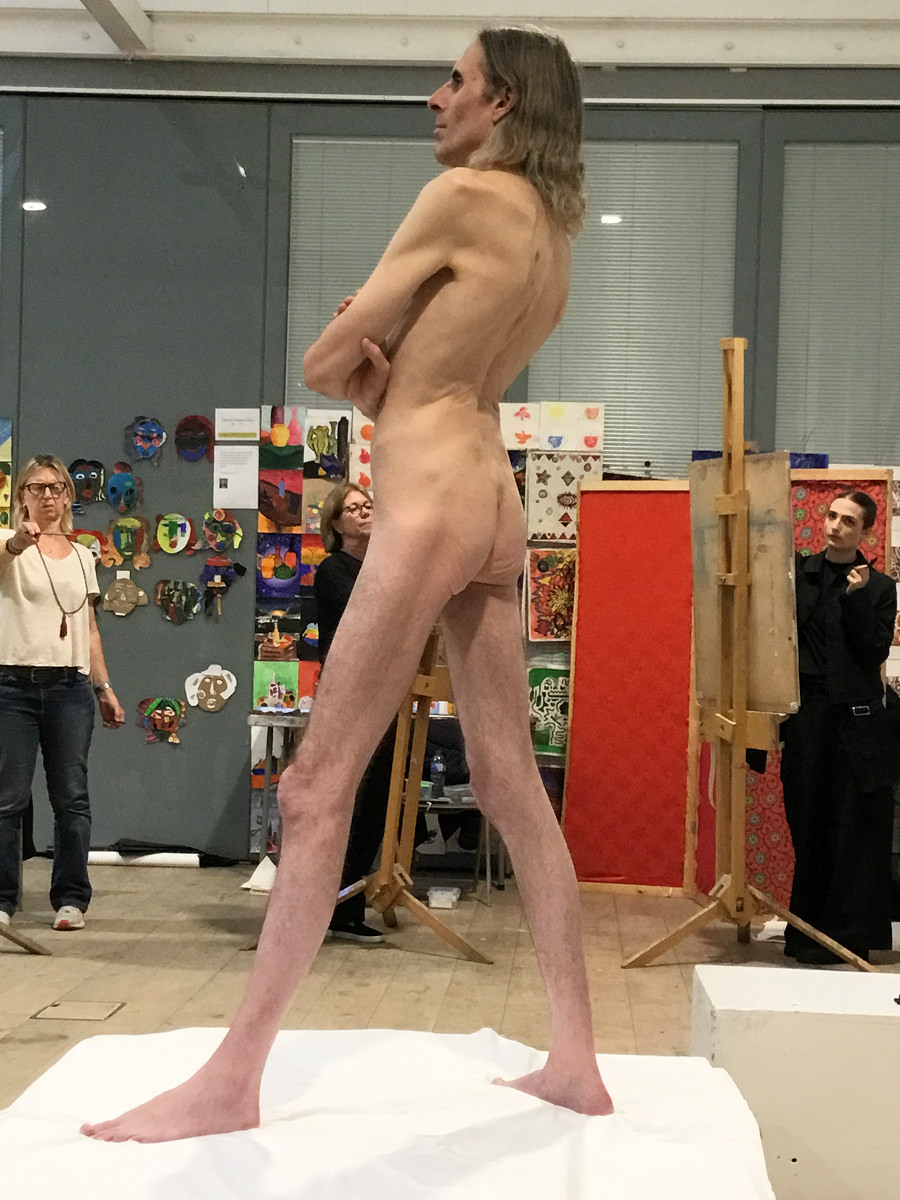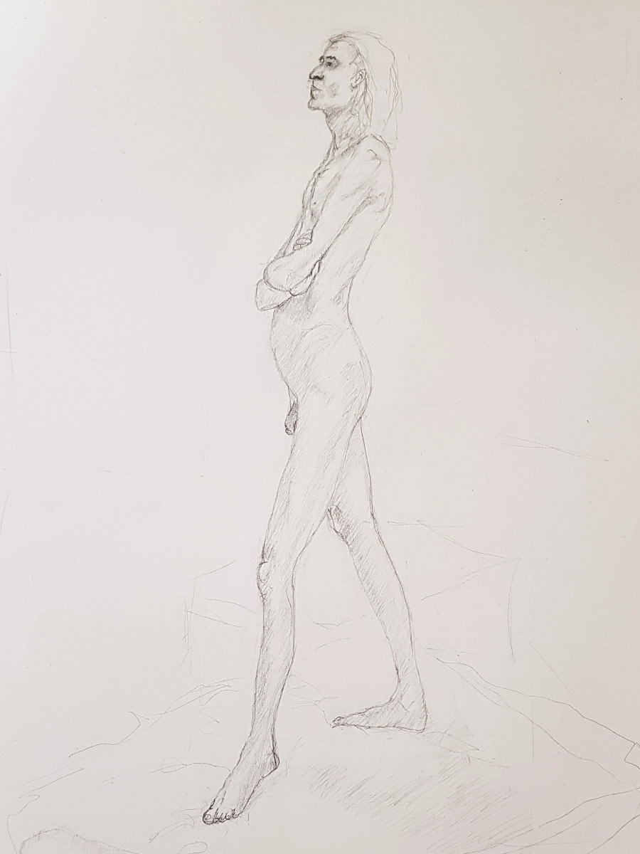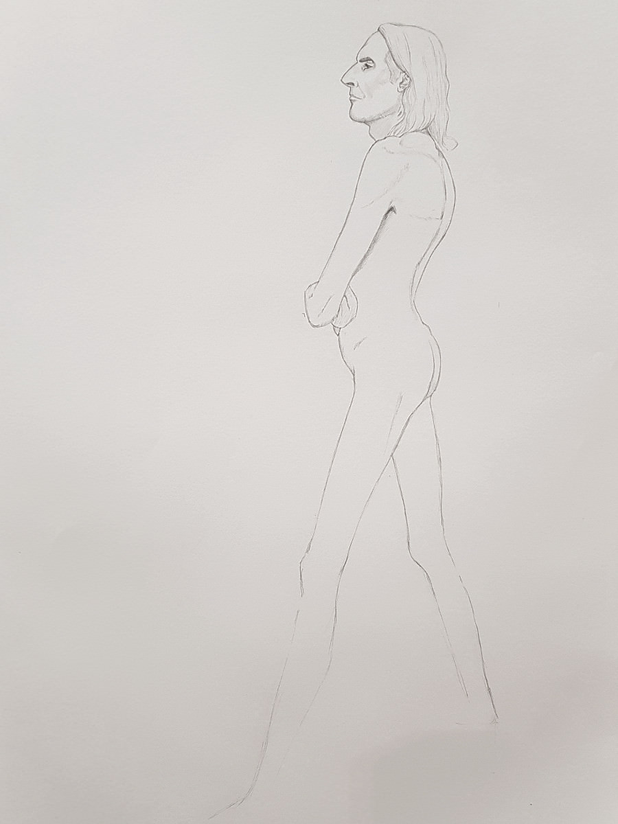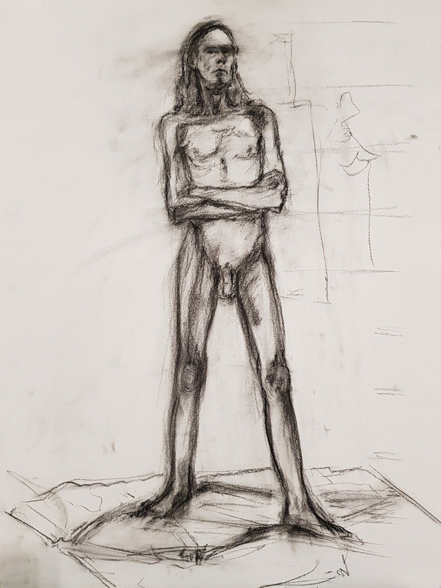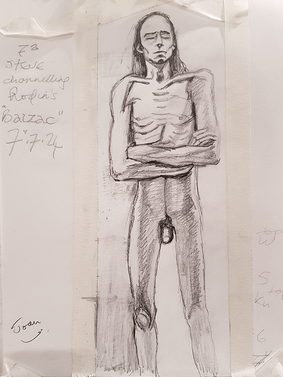 A single long pose would occupy our remaining two hours. Tutor Victoria Rance had suggested we look to the sculptures of Auguste Rodin for inspiration, so we scrolled through images of his works and were drawn to the strong standing stance of a portly gentleman with arms folded. I was to be Balzac, étude de nu C, grand modèle.