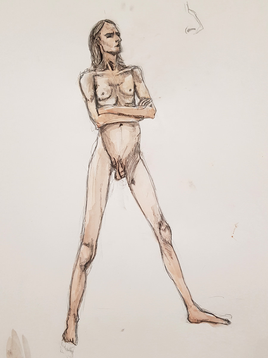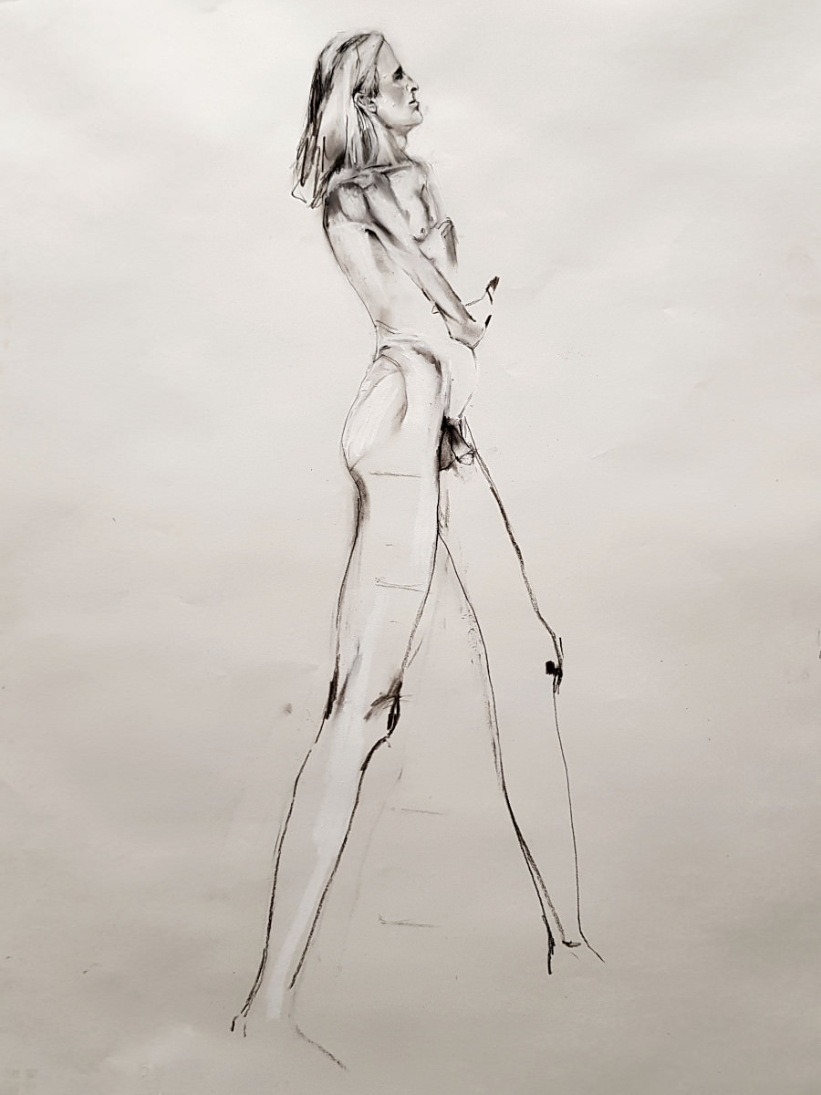 Life modelling is always a more comfortable experience in the warm summer months of long light days with fewer clothes to shed. And where better to appreciate this than The Conservatoire in Blackheath beneath the glass roof of its Victorian art building? ‘Warm-up’ poses, for those still in need of warming-up, were: 1, 1, 1, 5, 10 minutes.