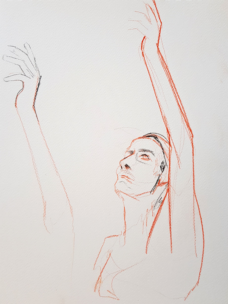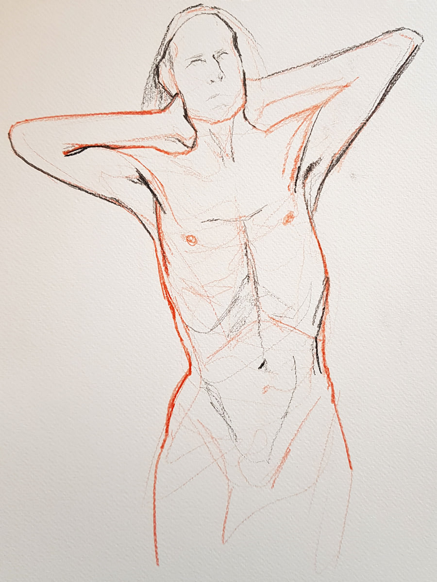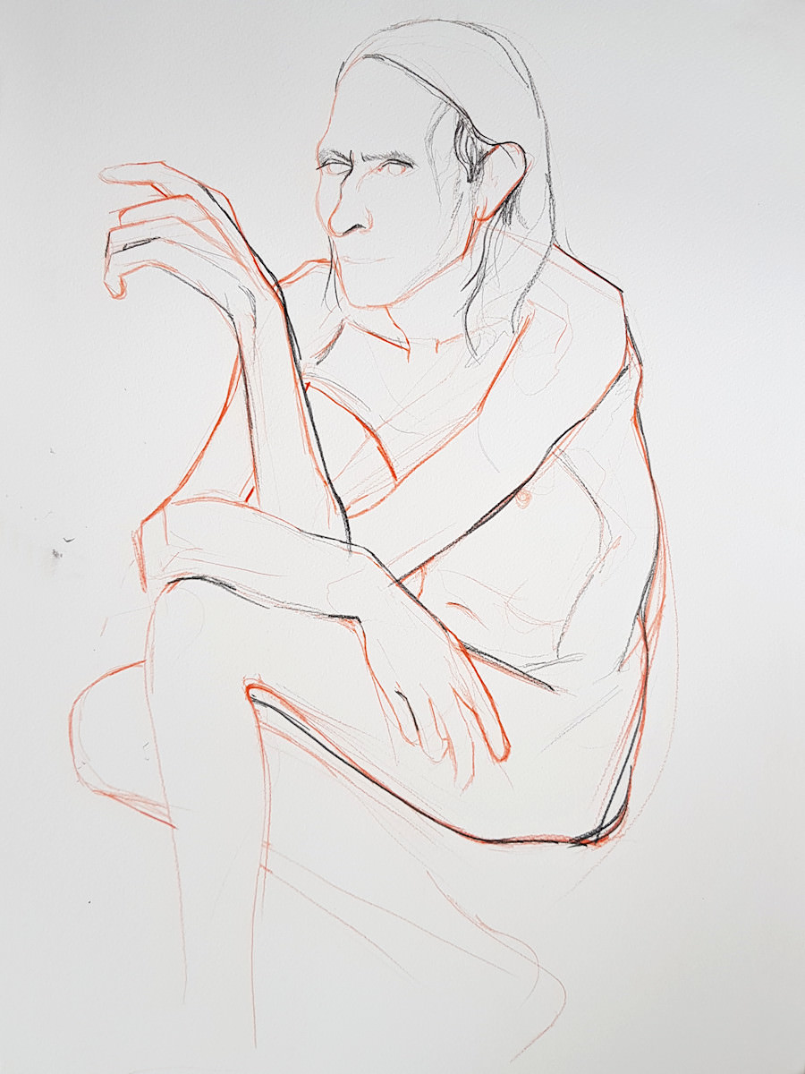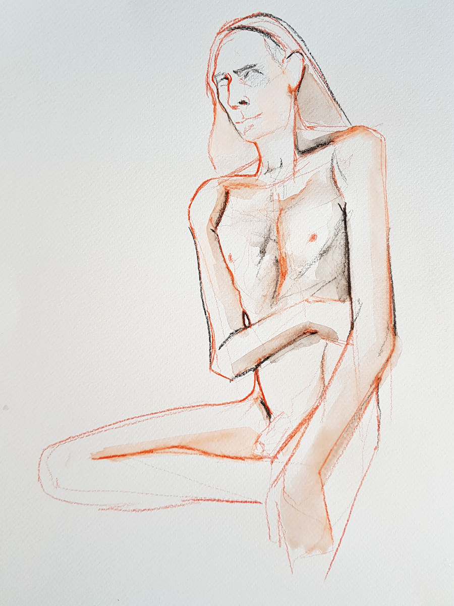 We finished with a few shorter poses: 11 minutes standing, 16 minutes sitting side-on and 7 minutes sitting with one arm reaching upwards. Whilst pose times in classes or group settings usually end with a five or zero, at private bookings artists can luxuriate in asking for an extra minute or two whenever it’s desirable… and sustainable. 🙂