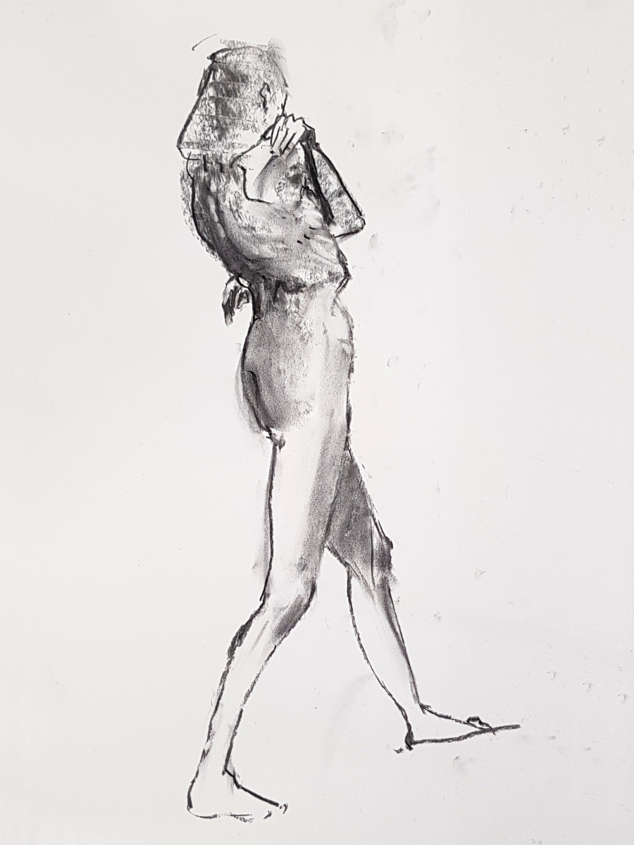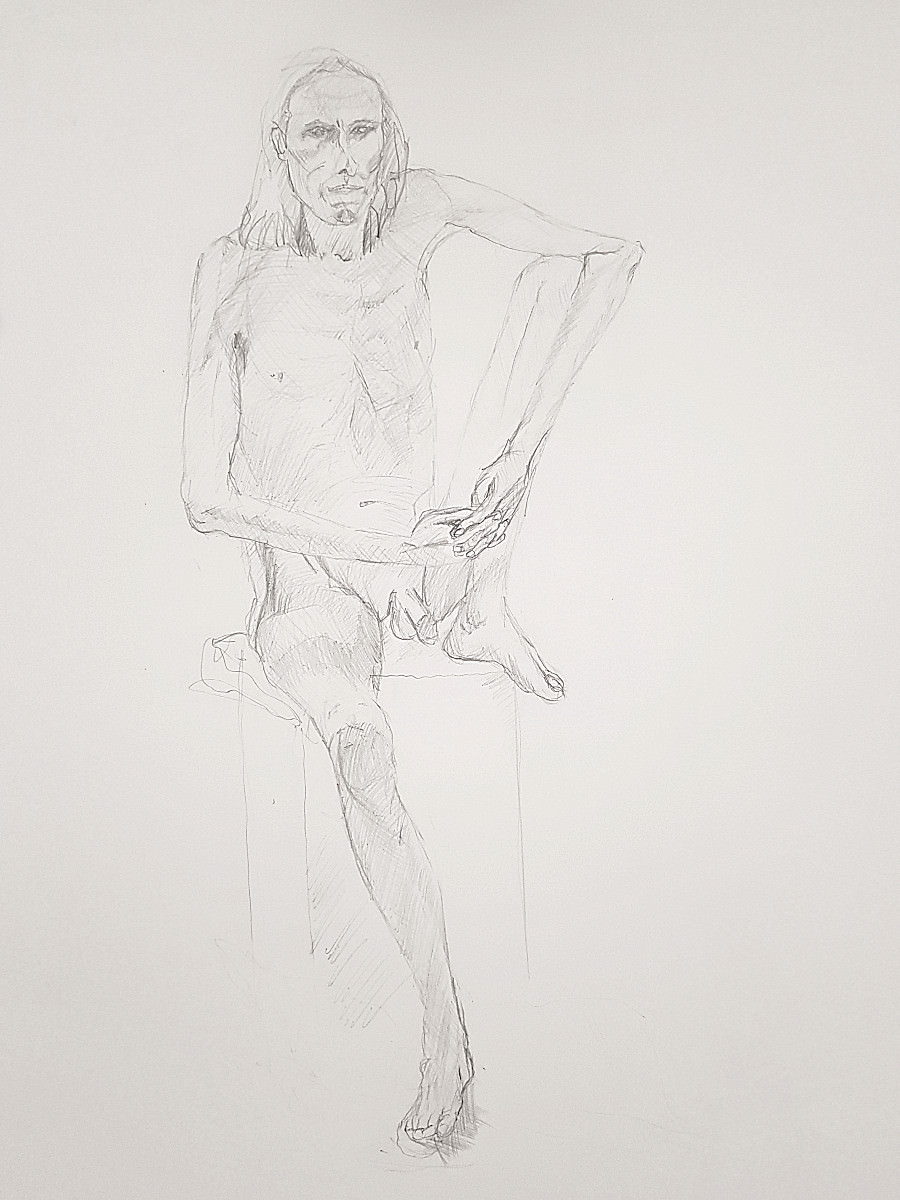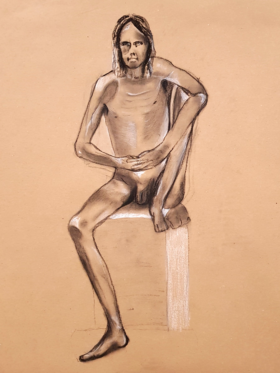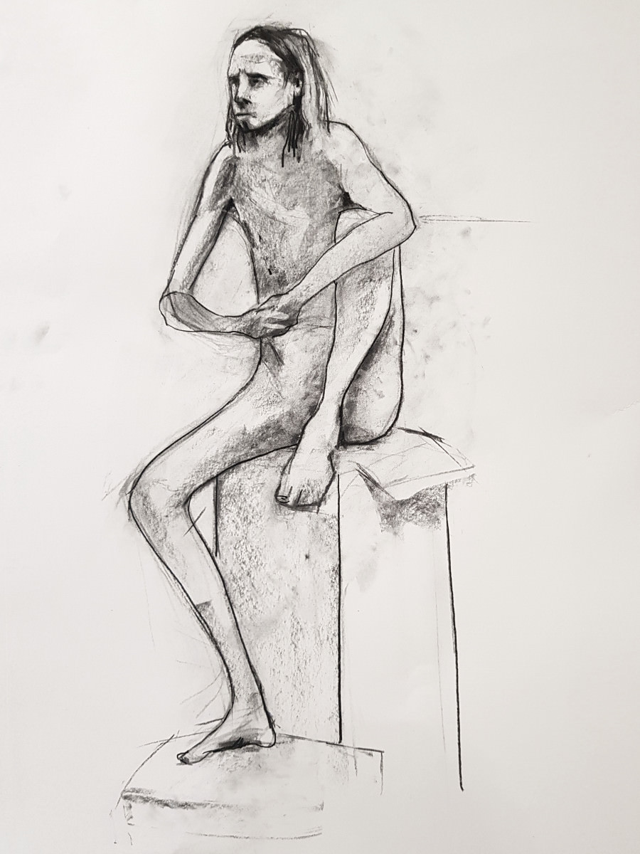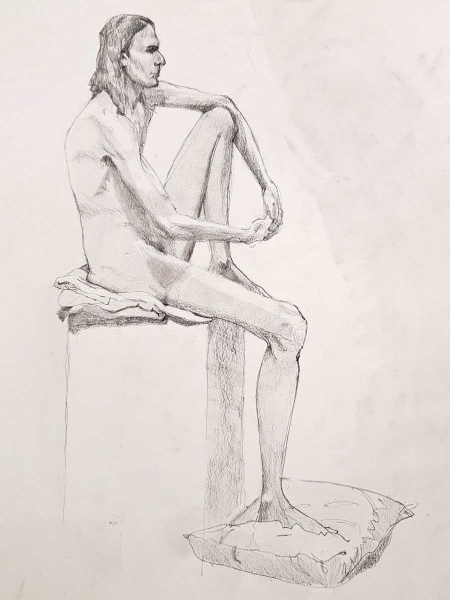 Upon resuming we had great difficulty recreating the pose to everybody’s satisfaction based on their drawings up to that point. Note to self: when commencing a long pose with complex positioning, make sure a reference photo is taken at the outset!