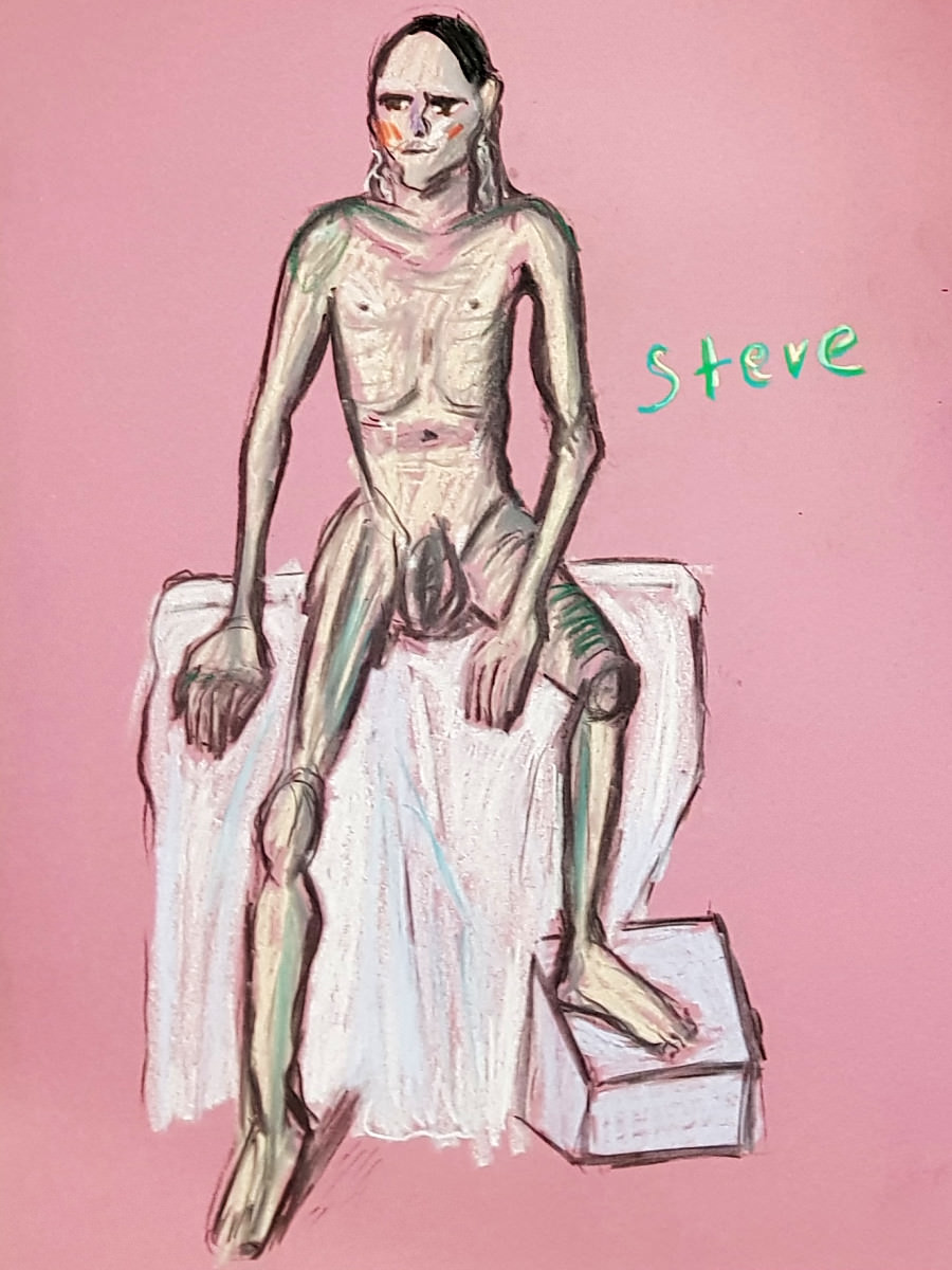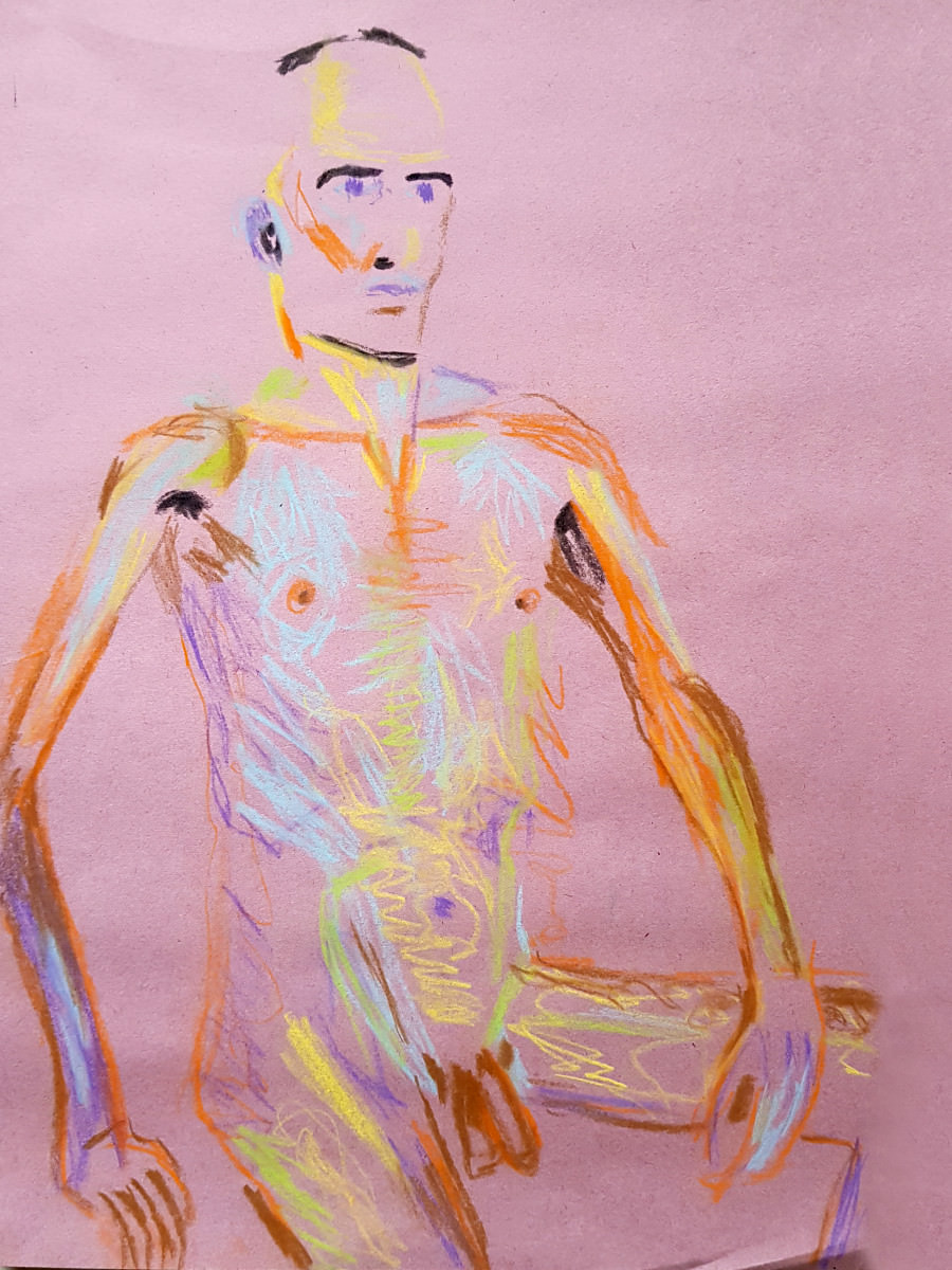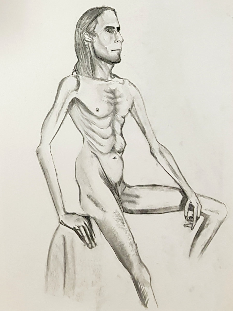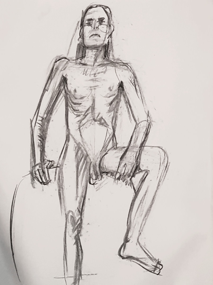 Six months on from my last time life modelling at The Art of Isolation, the long-pose slot has evolved. Whereas in April the session was comprised mostly of short poses with a 35-minute pose at the end, now ‘Long Pose Saturday’ starts with two 5-minute warm-ups before focusing entirely on a single 90-minute pose.