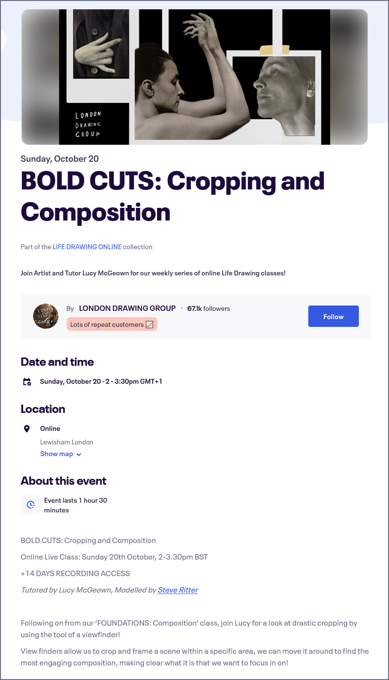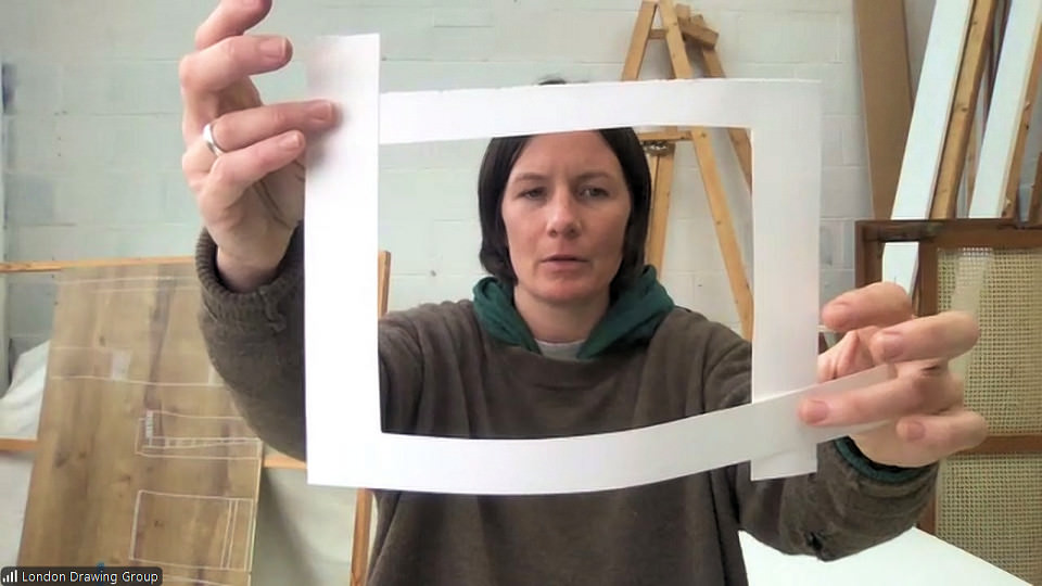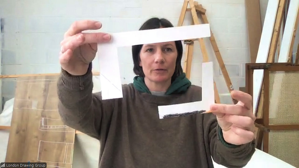 The theme was ‘cropping’, which meant that after five 2-minute warm-up poses, each subsequent 15-minute pose would be scrutinised by online artists with an intention of finding an area of the overall composition to ‘crop’ and draw. Lucy demonstrated how this could be facilitated using two L-shaped strips of paper.
