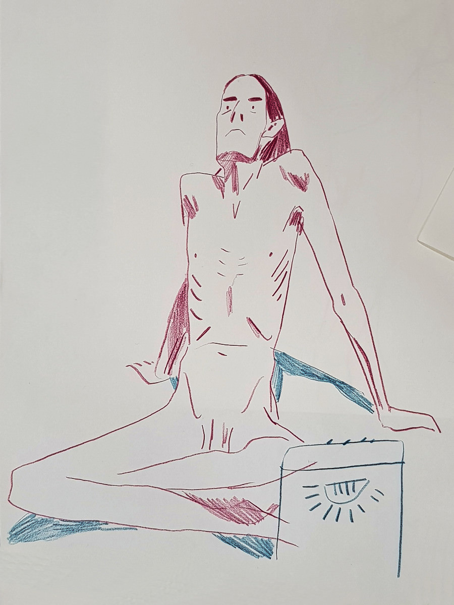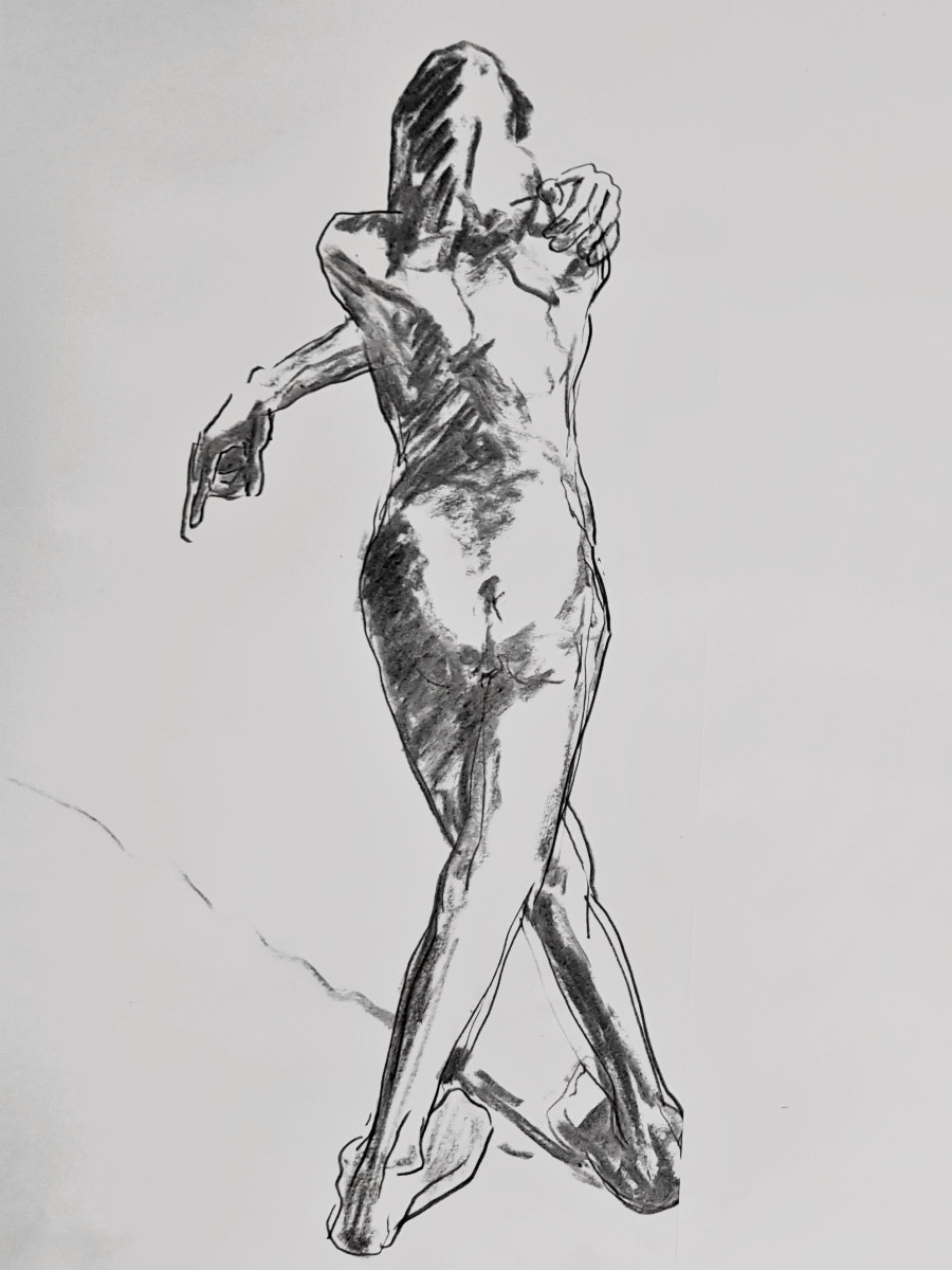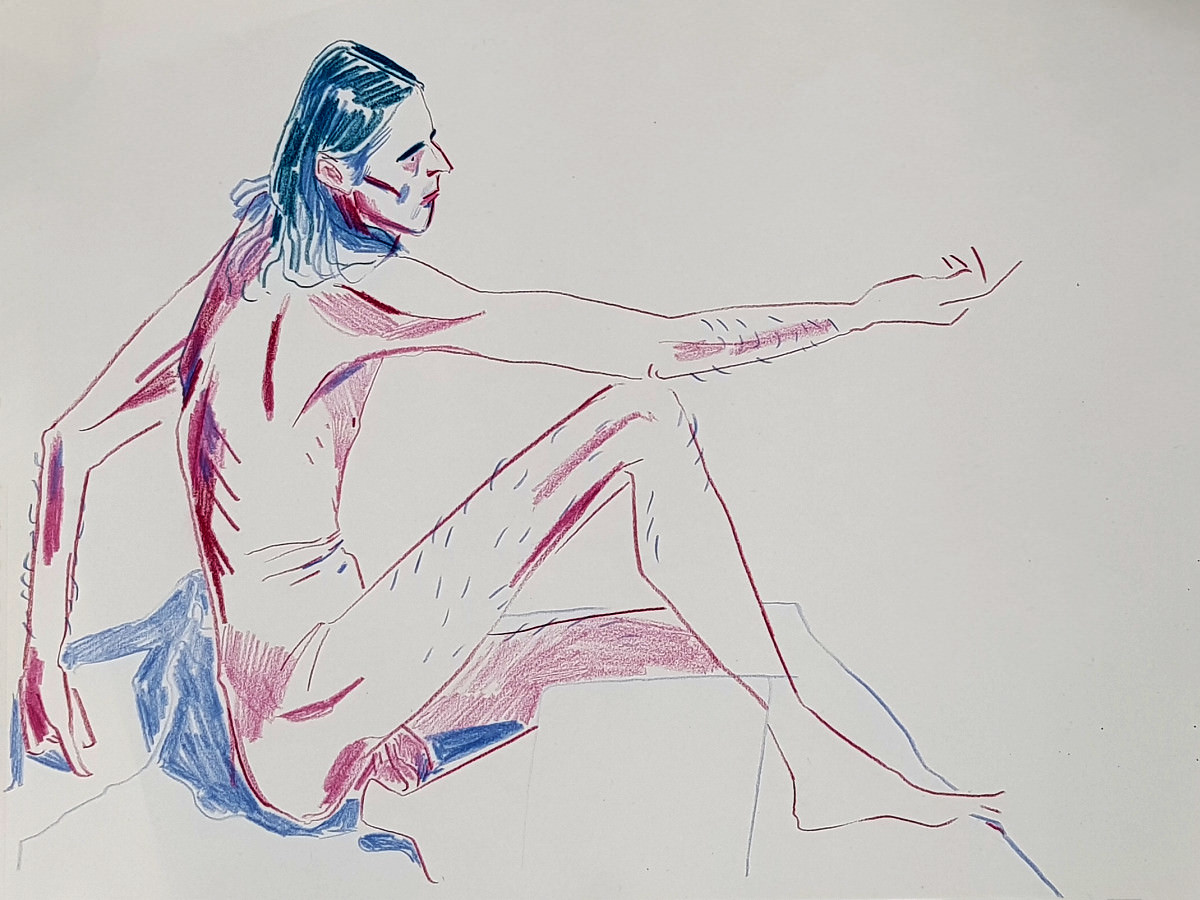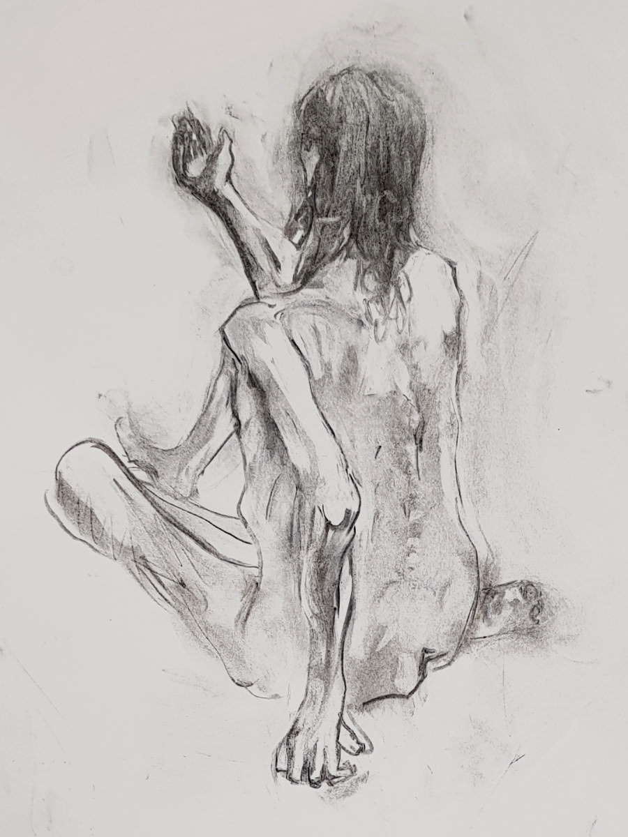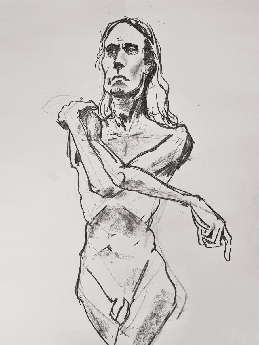 No matter what else might be happening in the universe, I require nothing more than a warm place to be a life model. No props nor prompts; naked simplicity. Tell me a pose duration and allow me to make the most interesting sustainable shape with my body.