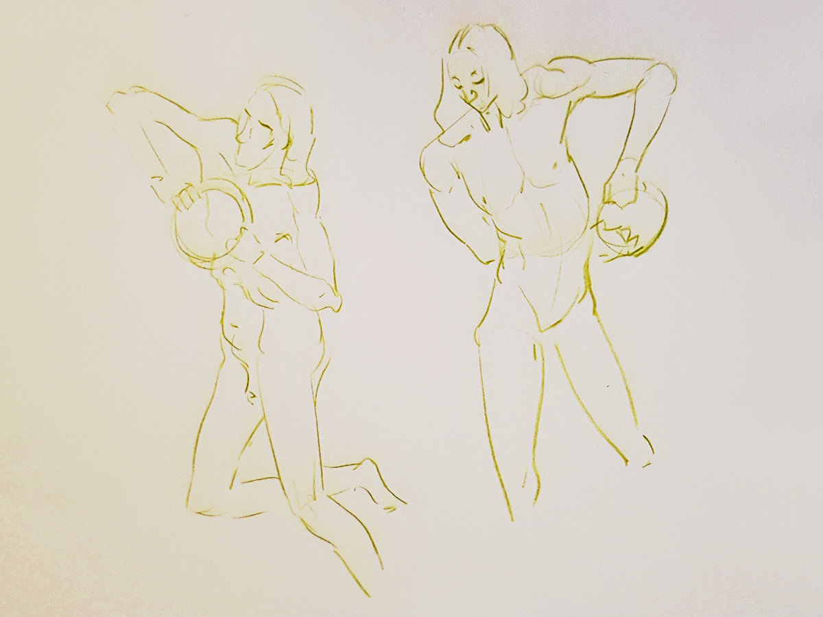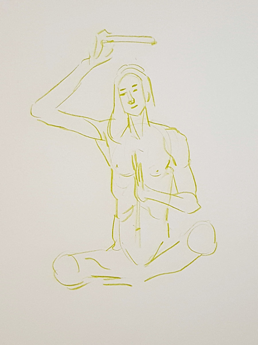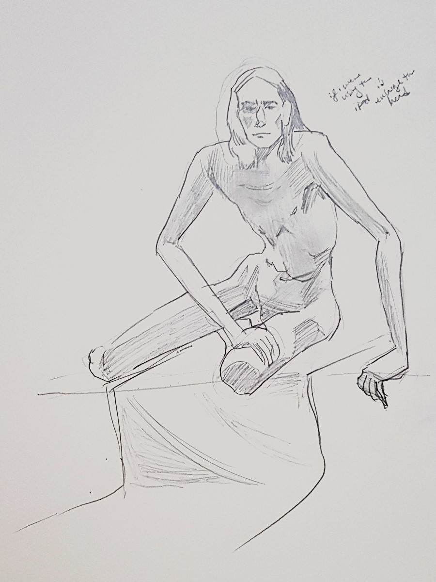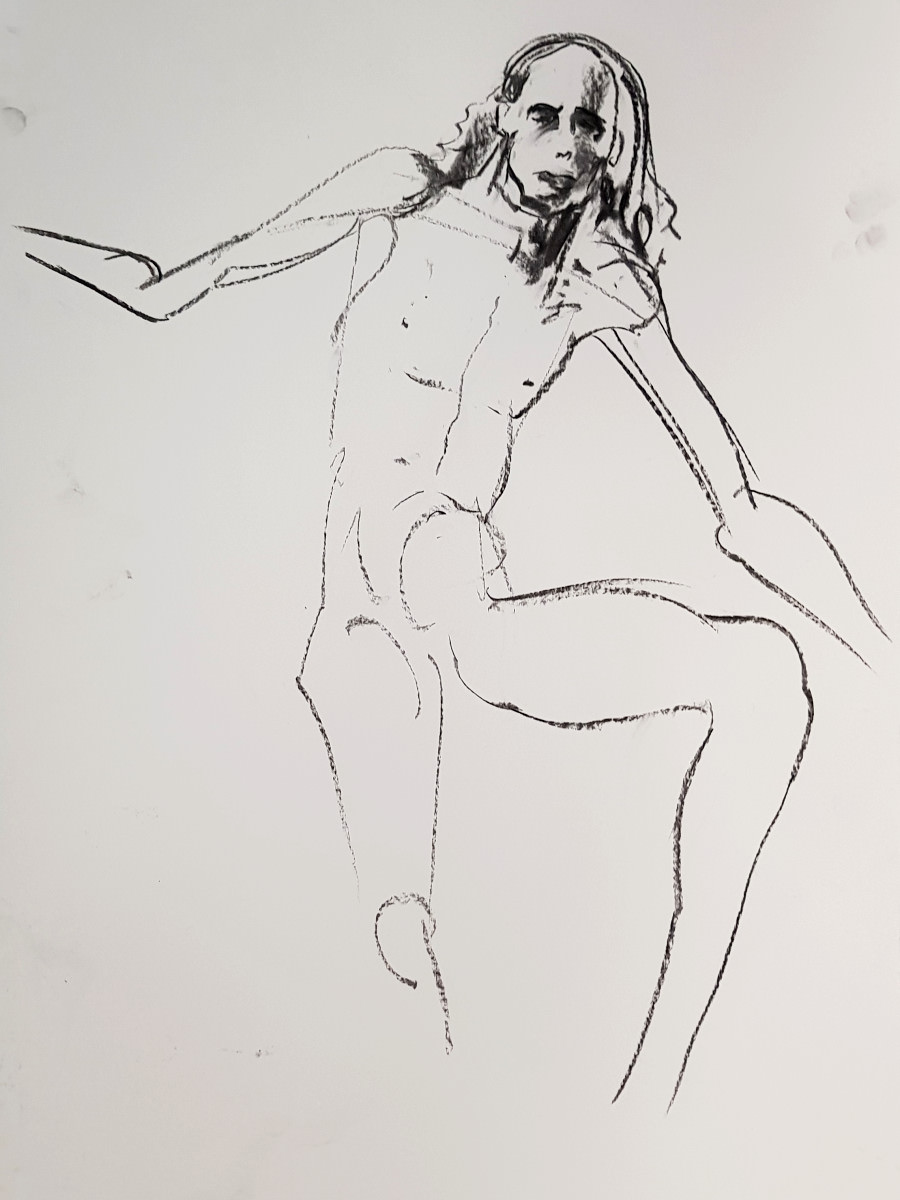 The set-up was exactly the same as before: the space, availability of props, the pose lengths, the automated timing system, music, a glass of wine at the interval. All good. Small easels for the artists seemed to be new. And, of course, people change. Artists can vary from session to session; and I no longer had Esther.
