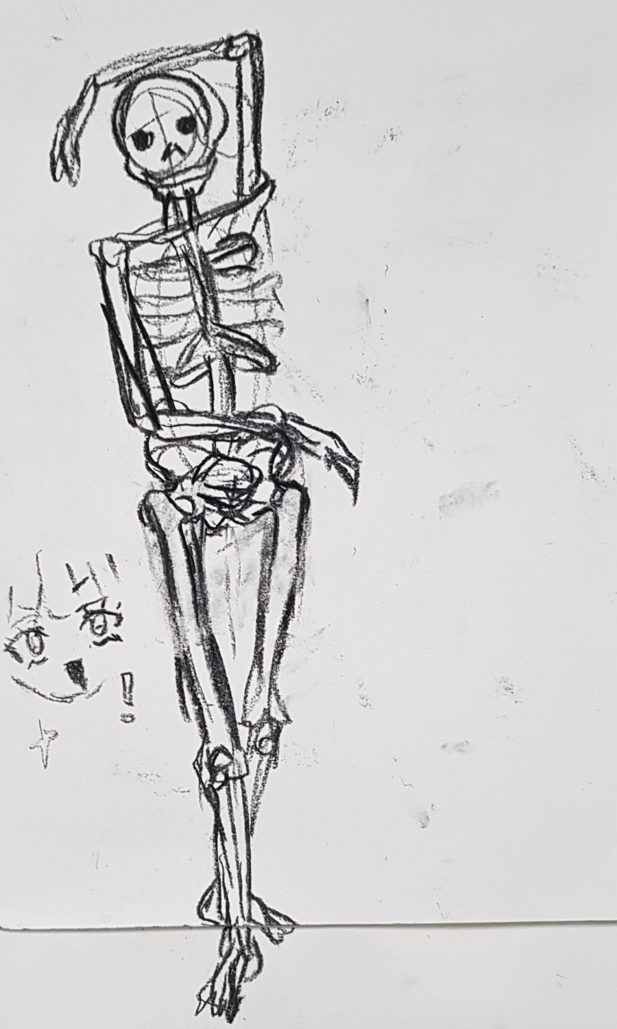 Mercifully, the whole session was to be one of imagination. Students were not tasked with drawing me as they saw me. Rather, they were to consider what lay beneath my skin and muscle (and bloat) to draw only my inner frame – pelvis solid, spine curving, ribcage twisted, shoulders tilted – either in stick-figure form or assembled bones.