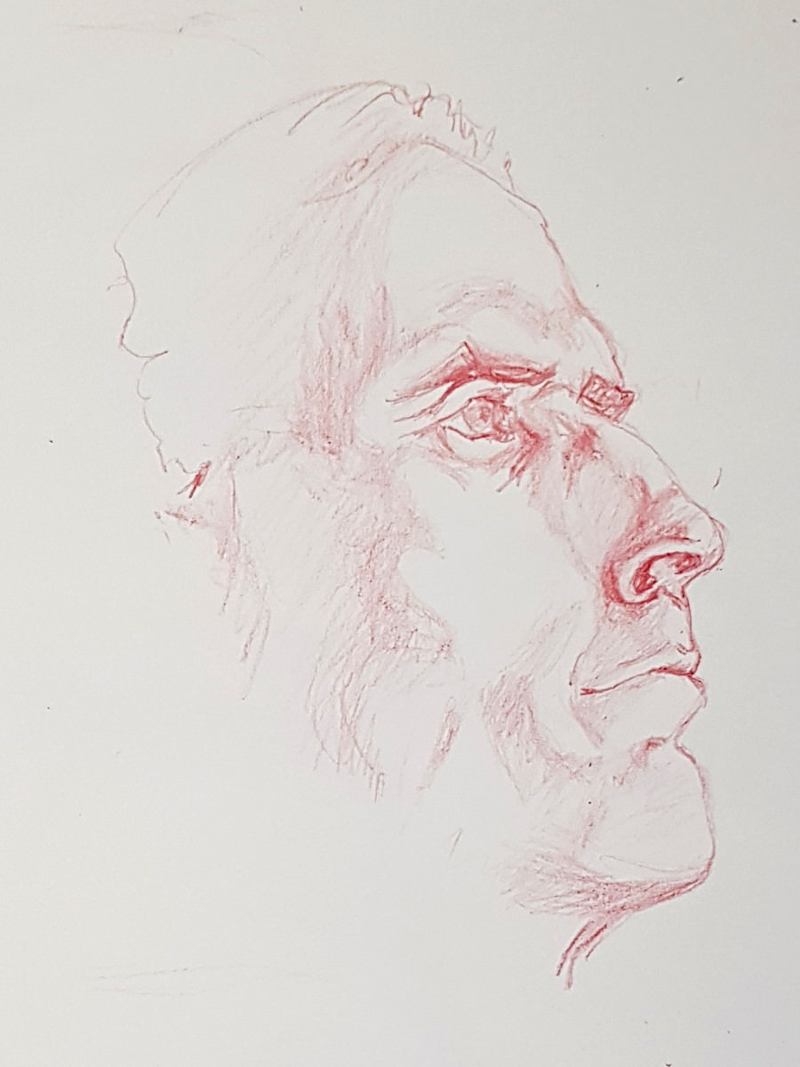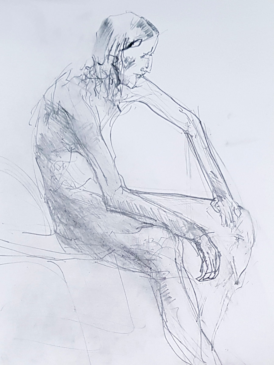 The last pose on a soft padded chair ought to have been the most comfortable but as is so often the case, I managed to make it painful. I’d perched on the very edge of the chair so its side arms wouldn’t obscure me, and I tilted my body forward but too much over to the right. Hours later I was still paying for those decisions in achiness.
