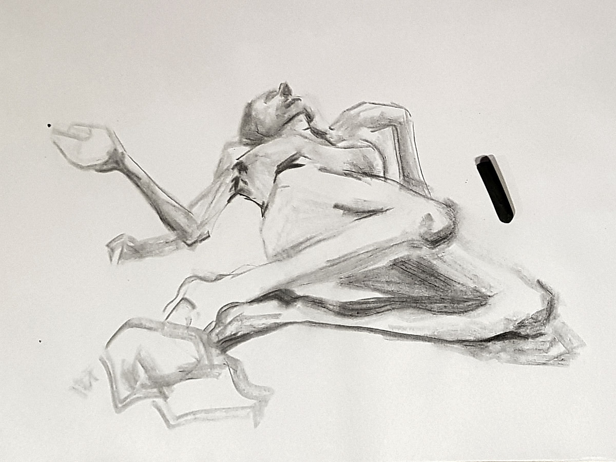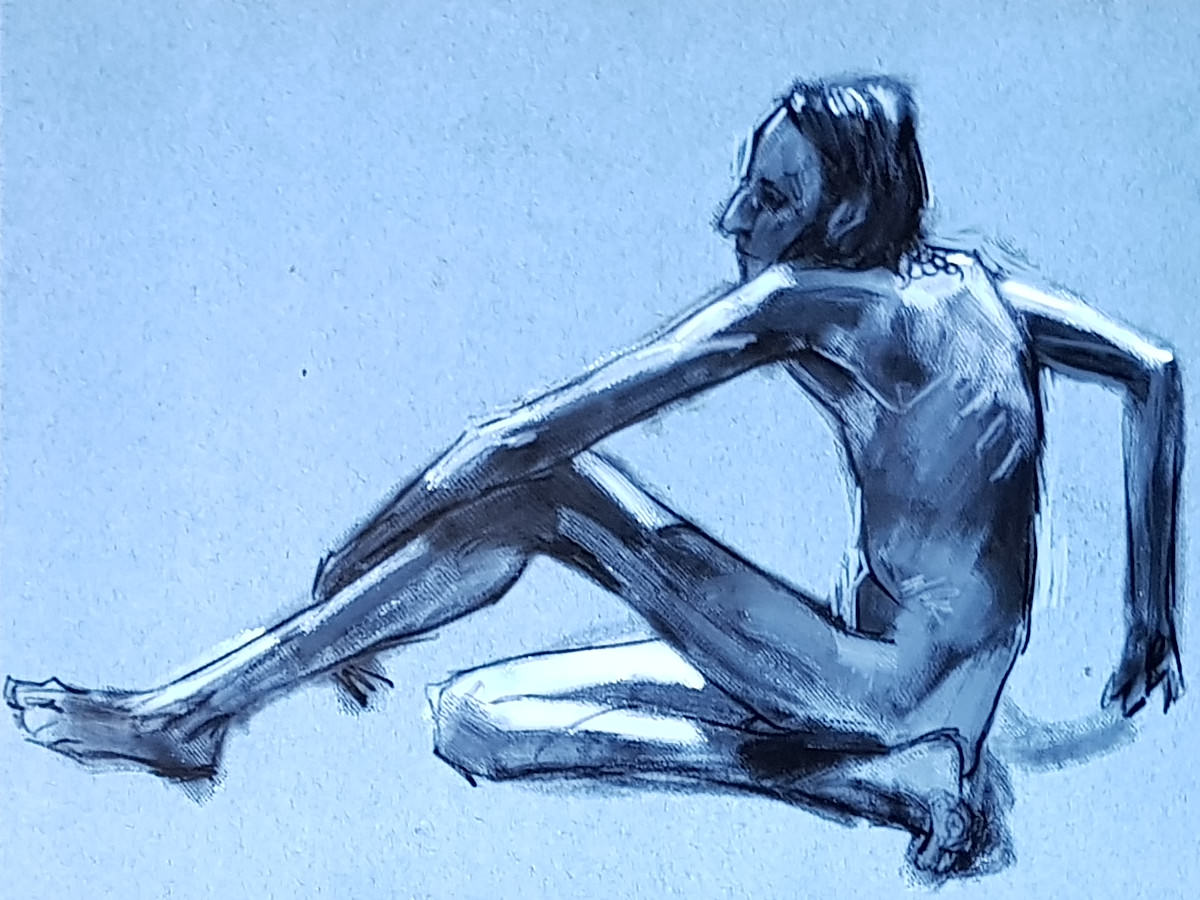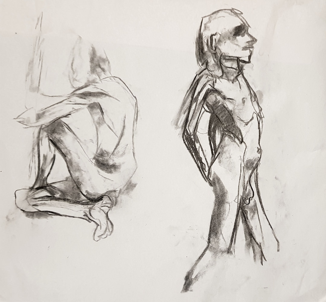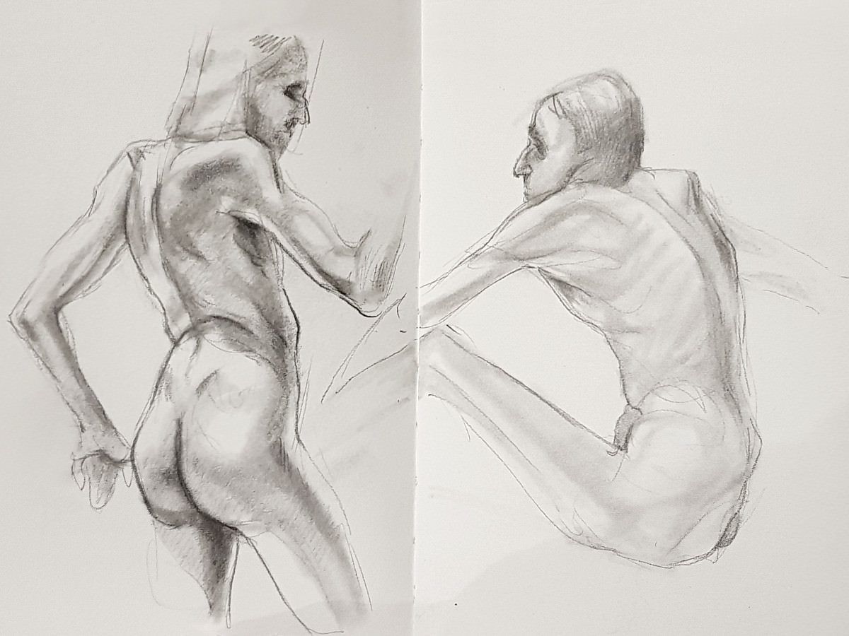 As a model in these situations the key is to plan poses well in advance. I knew all the likely pose lengths for the whole session before I started, so mentally I planned how I would alternate between standing, sitting and reclining, constantly changing direction in the round, such that I could best avoid two successive ‘cold’ poses.