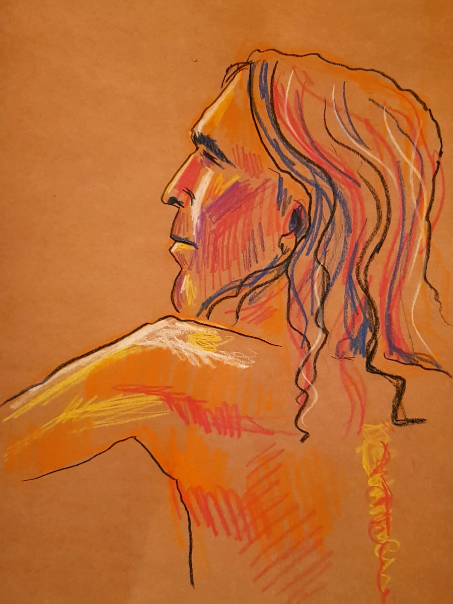 Two free seats at the outset were filled by latecomers before the break. Another artist who arrived during the second half had either to stand or find room on the floor. I love seeing exemplary life drawing groups flourish. Sold out! Standing-room only! Yeah!