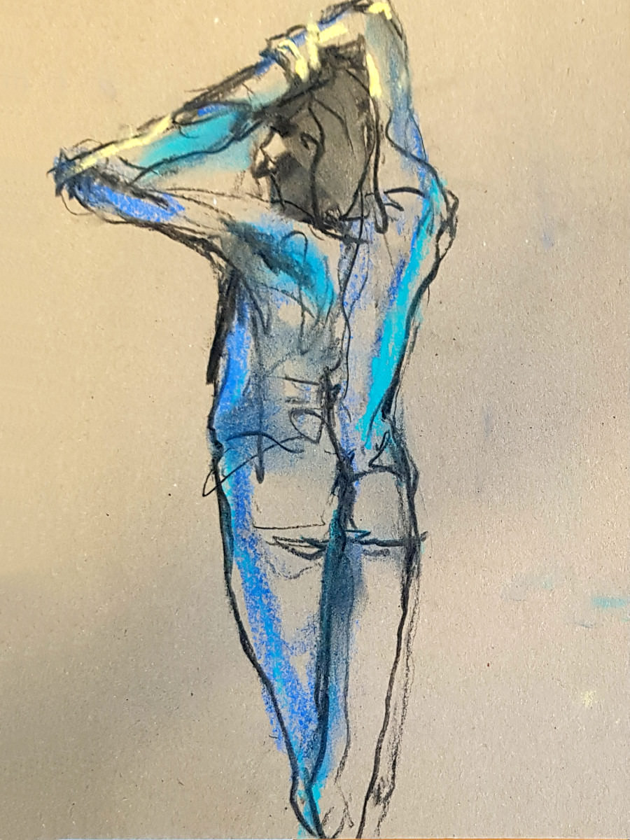 We began with a 10-minute warm-up, after which poses ranged from 2 to 15 minutes taking us to our break. For these poses, artists were encouraged to try drawing in the pastel style of James McNeill Whistler. Famous Whistler witticisms were read aloud but I confess my own knowledge is limited to Monty Python’s Oscar Wilde sketch.