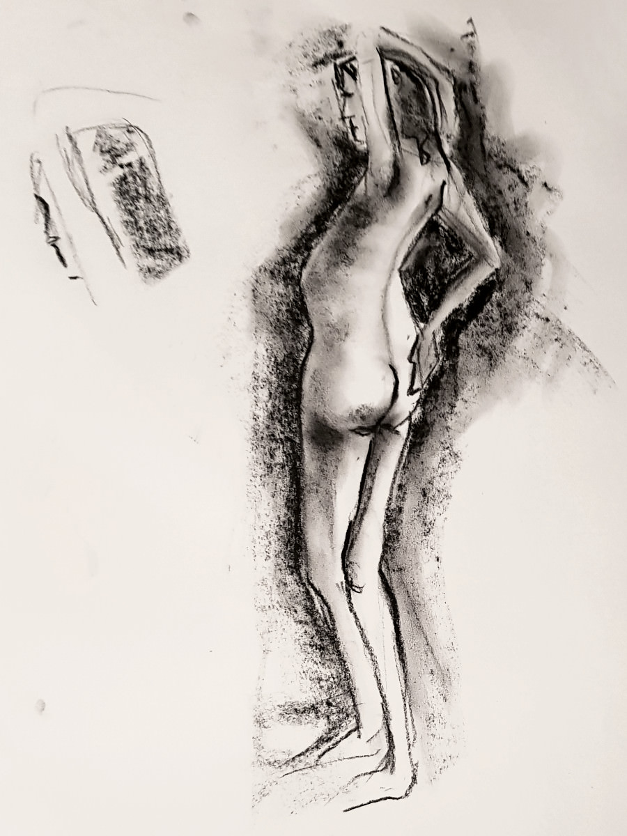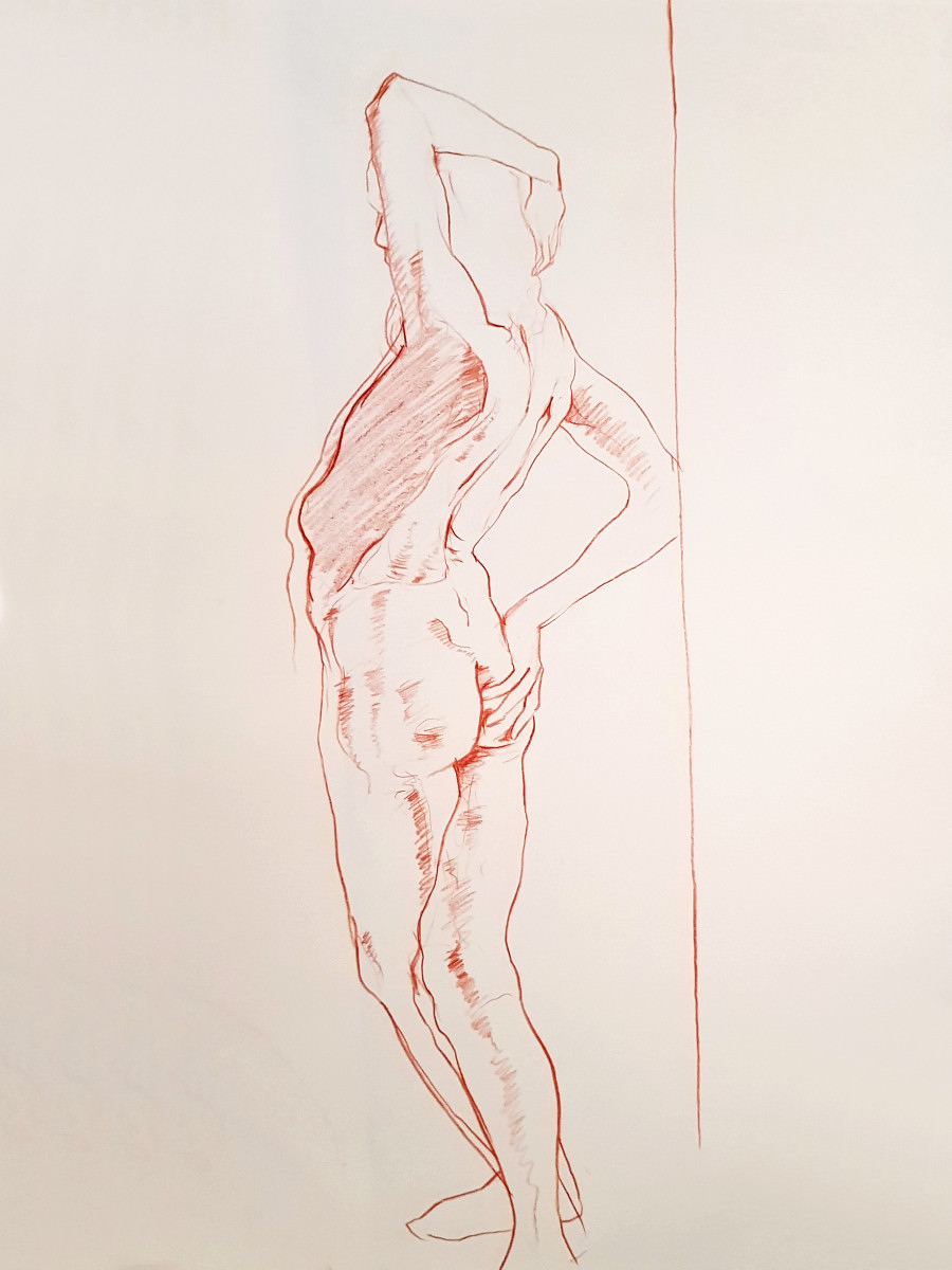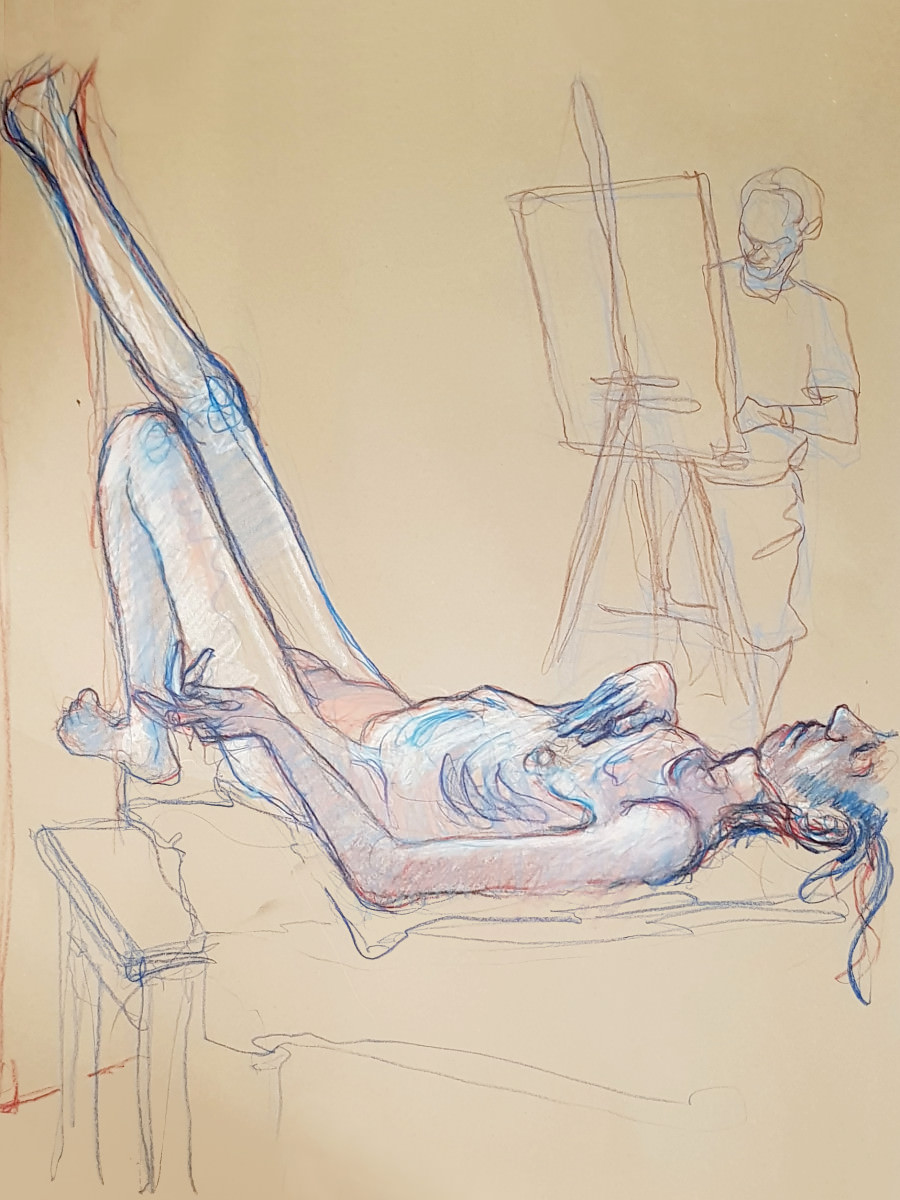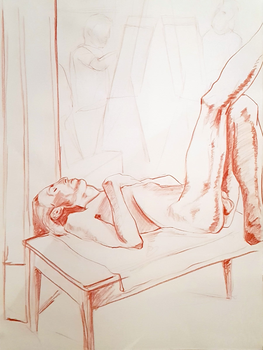 As this was most likely to occur if I was either sitting or reclining, I remained standing throughout the first half of the session. After an extended interval for socialising there was time a single pose of 20 minutes, which I felt might work with me laying down if I sprawled upon a table in the doorway and raised my feet up high on the door frame.