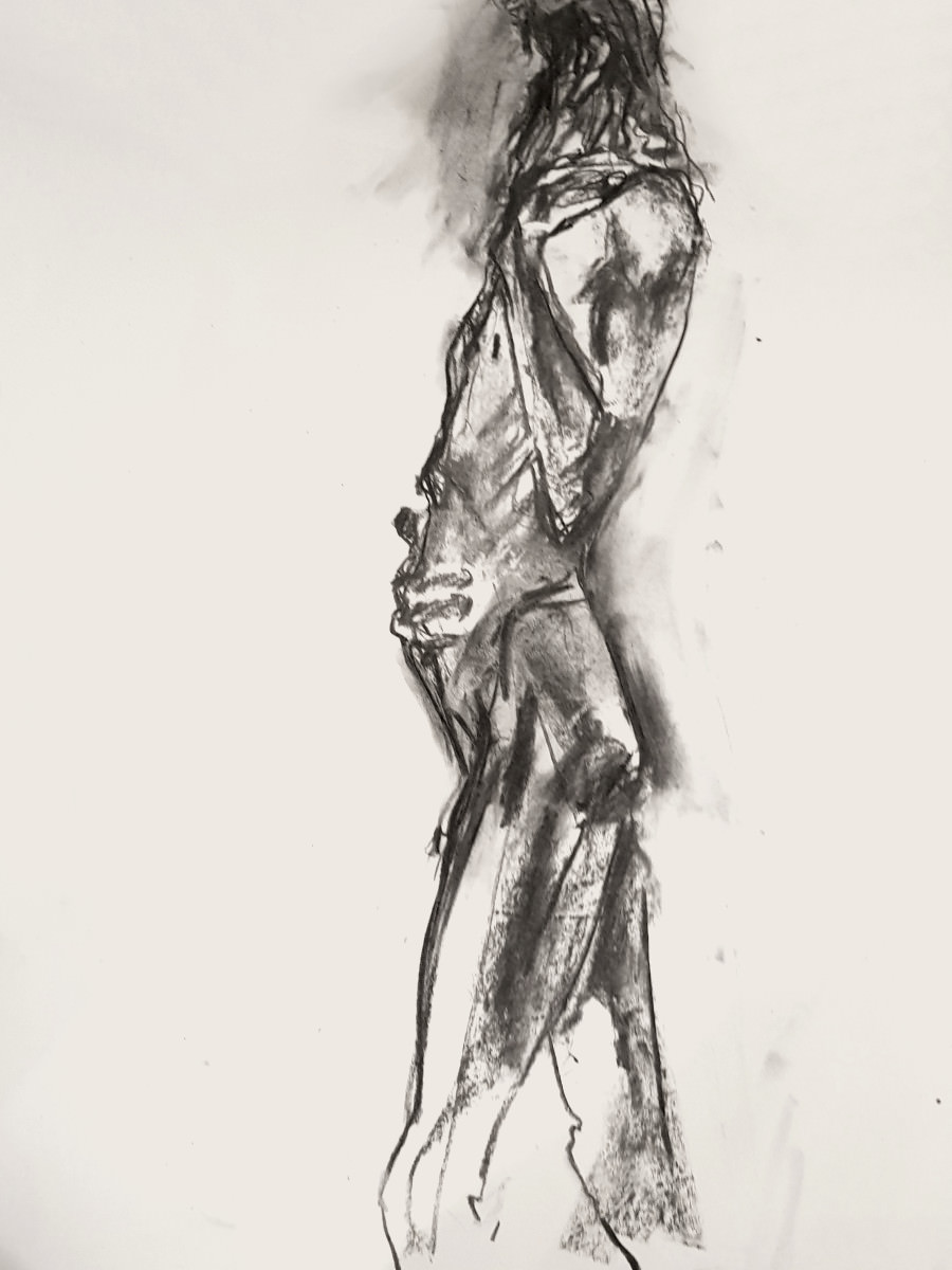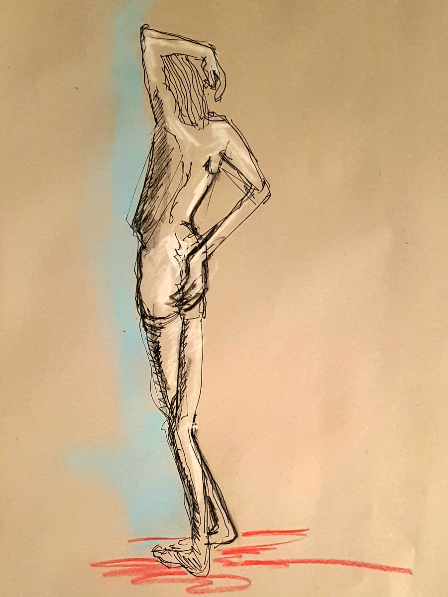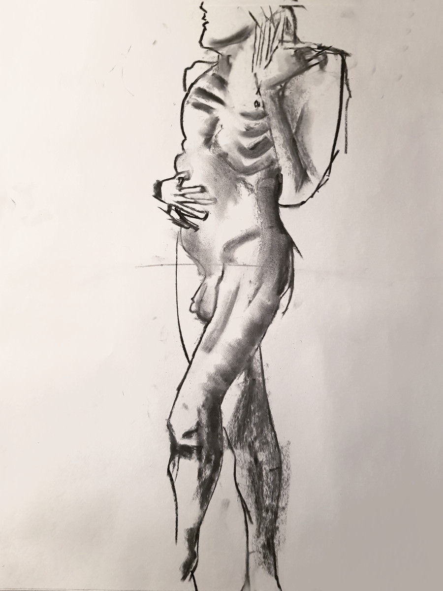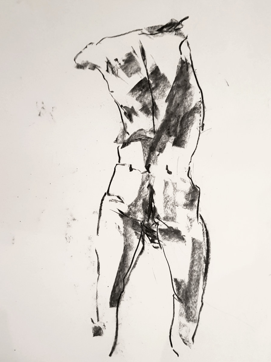 As this was most likely to occur if I was either sitting or reclining, I remained standing throughout the first half of the session. After an extended interval for socialising there was time a single pose of 20 minutes, which I felt might work with me laying down if I sprawled upon a table in the doorway and raised my feet up high on the door frame.